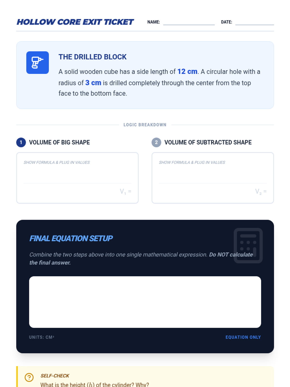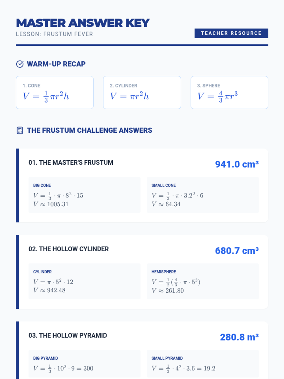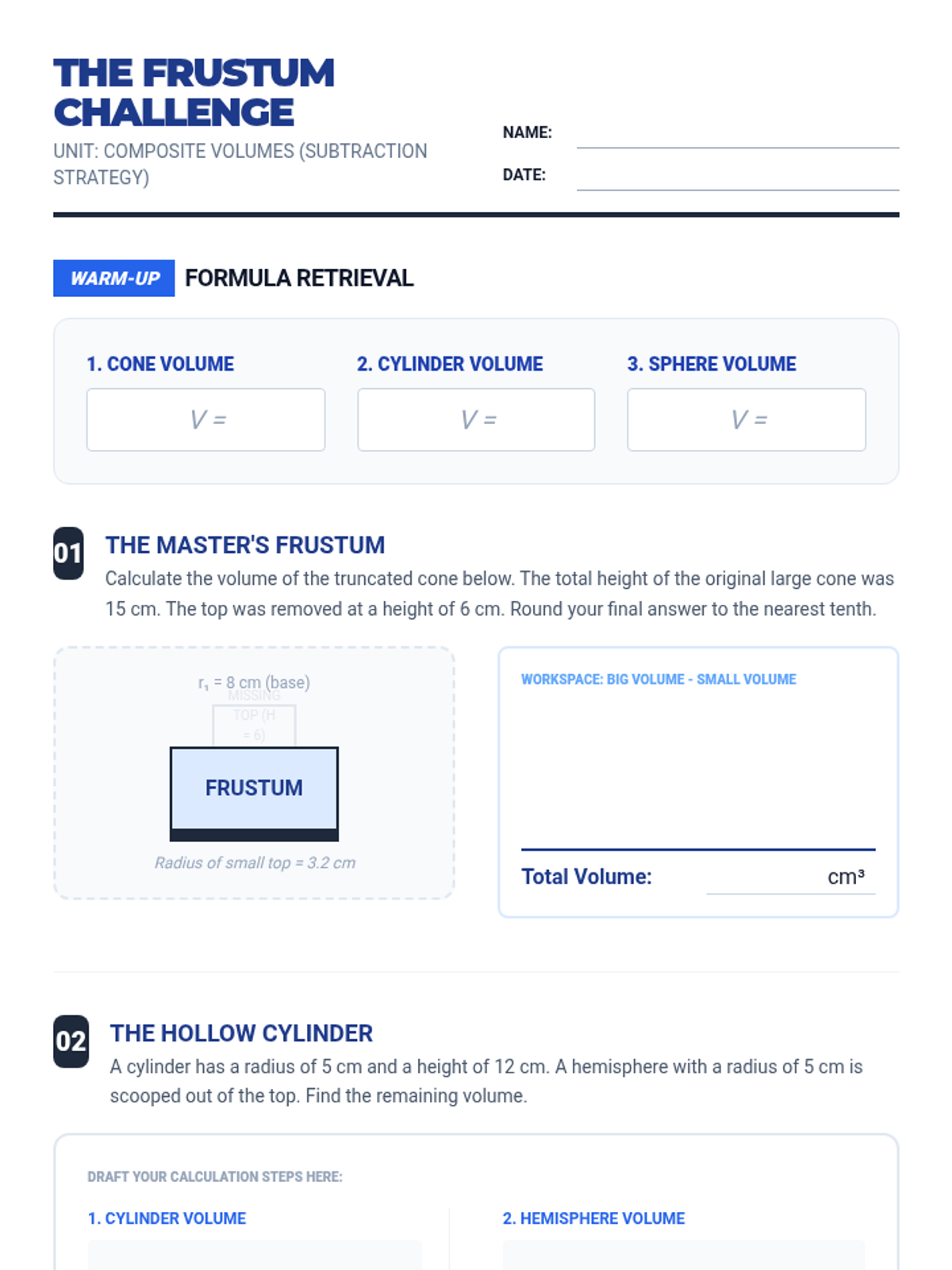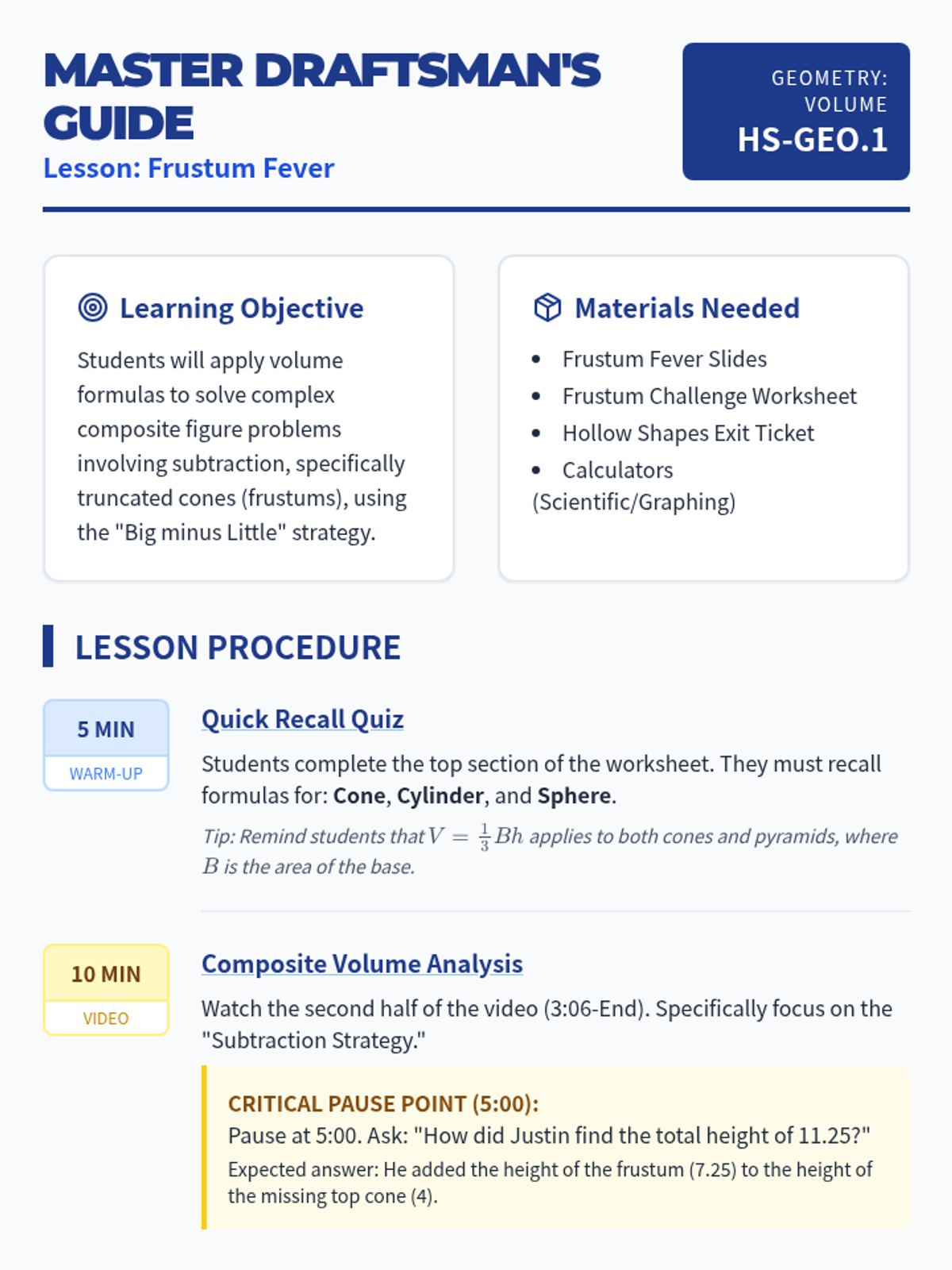 Students will master the subtraction strategy for finding composite volumes, focusing on truncated cones (frustums) and other hollowed-out shapes. The lesson uses a specific instructional video and collaborative problem-solving to reinforce 'Big Shape minus Little Shape' logic.