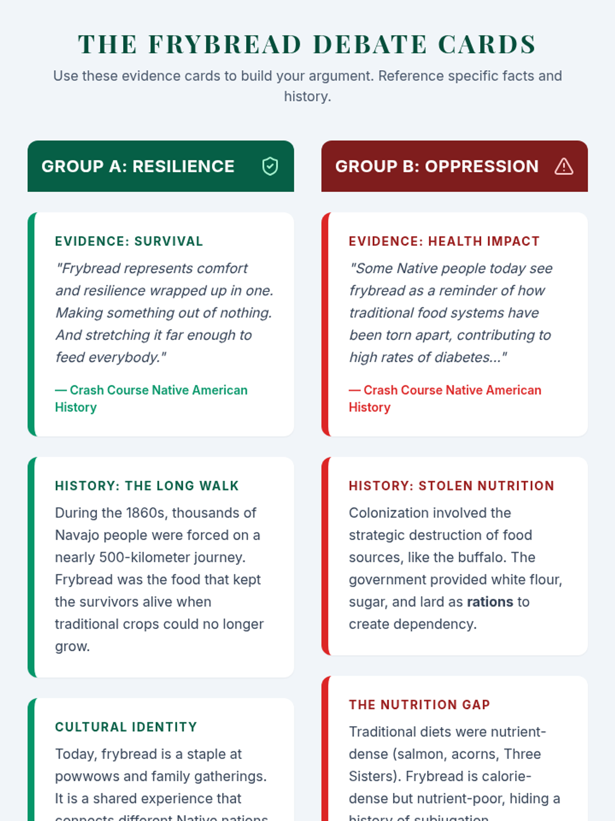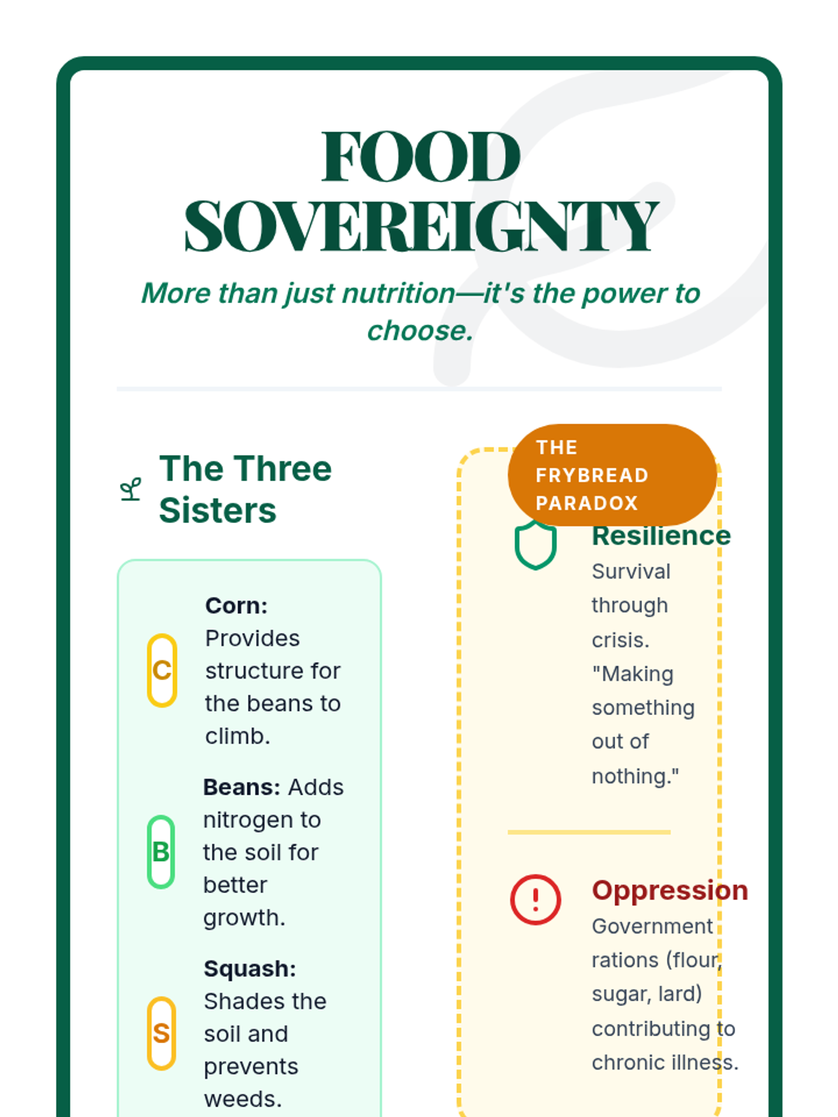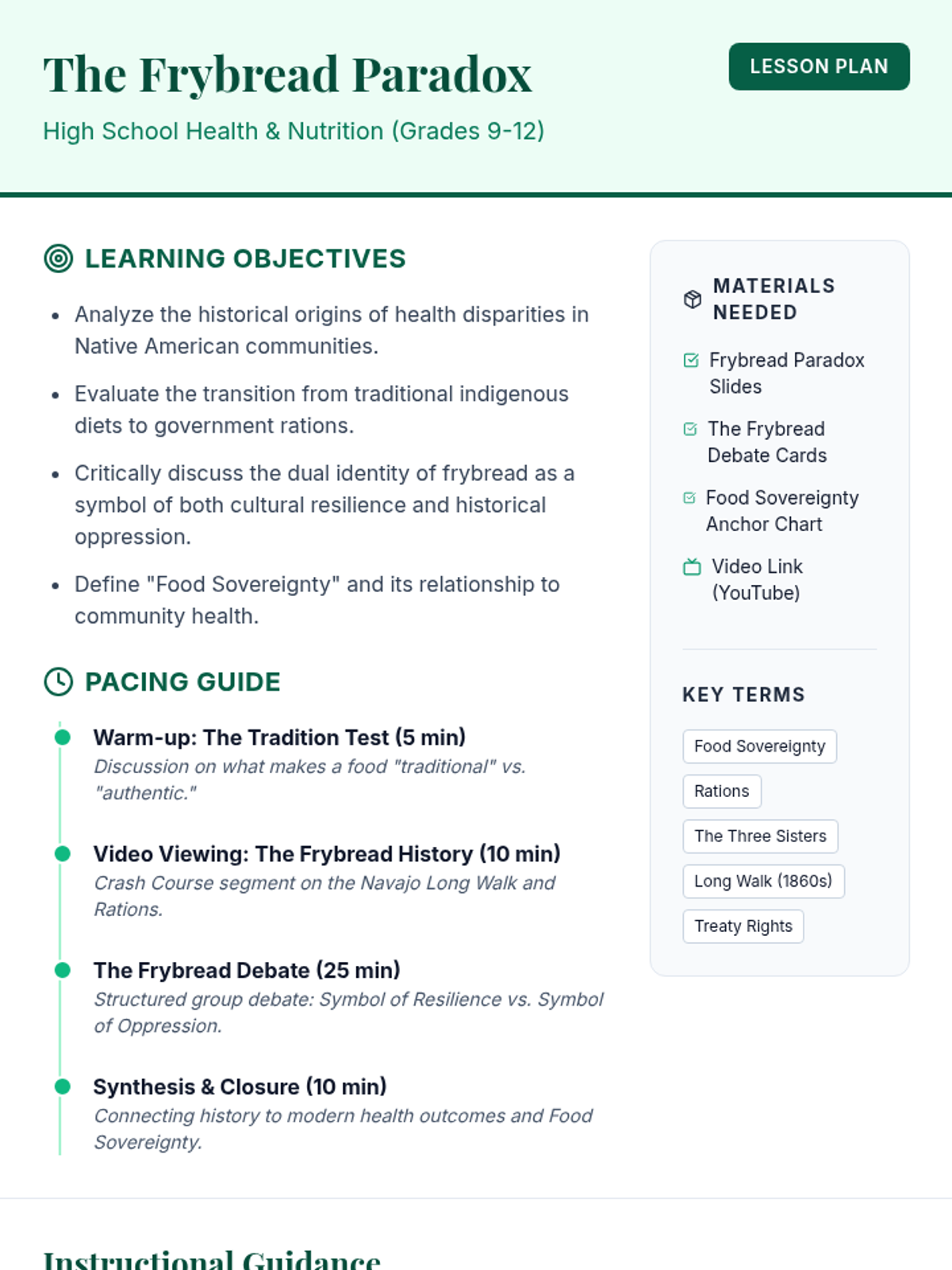 This lesson explores the historical origins of health disparities in Native American communities by examining the transition from traditional, nutrient-dense diets to government-issued rations, centered around the 'frybread paradox.' Students will analyze the impact of colonization on food sovereignty and debate the complex cultural and health implications of frybread today.