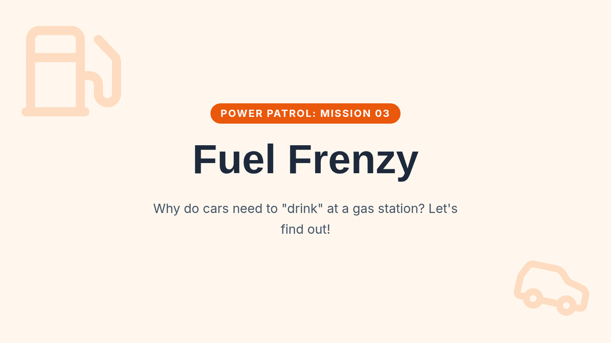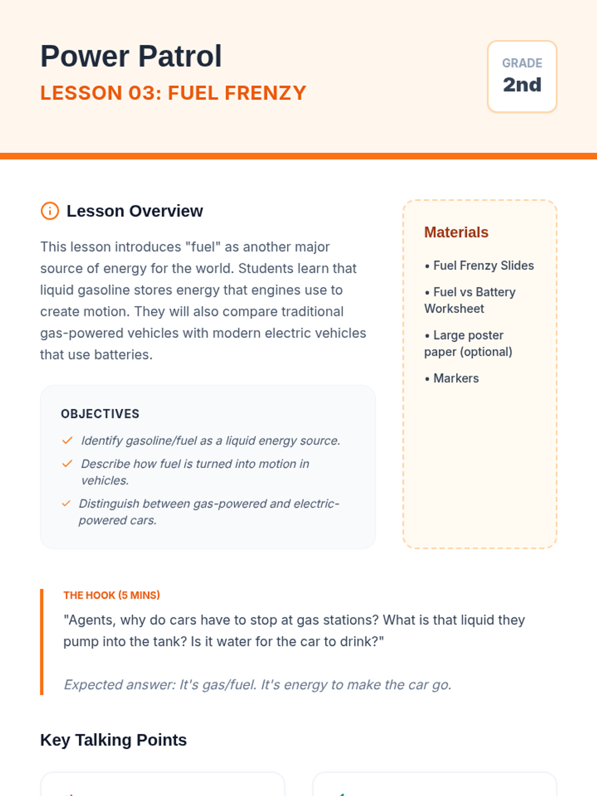 Students explore how liquid fuel powers vehicles and compare gas-powered cars to electric cars that use batteries.