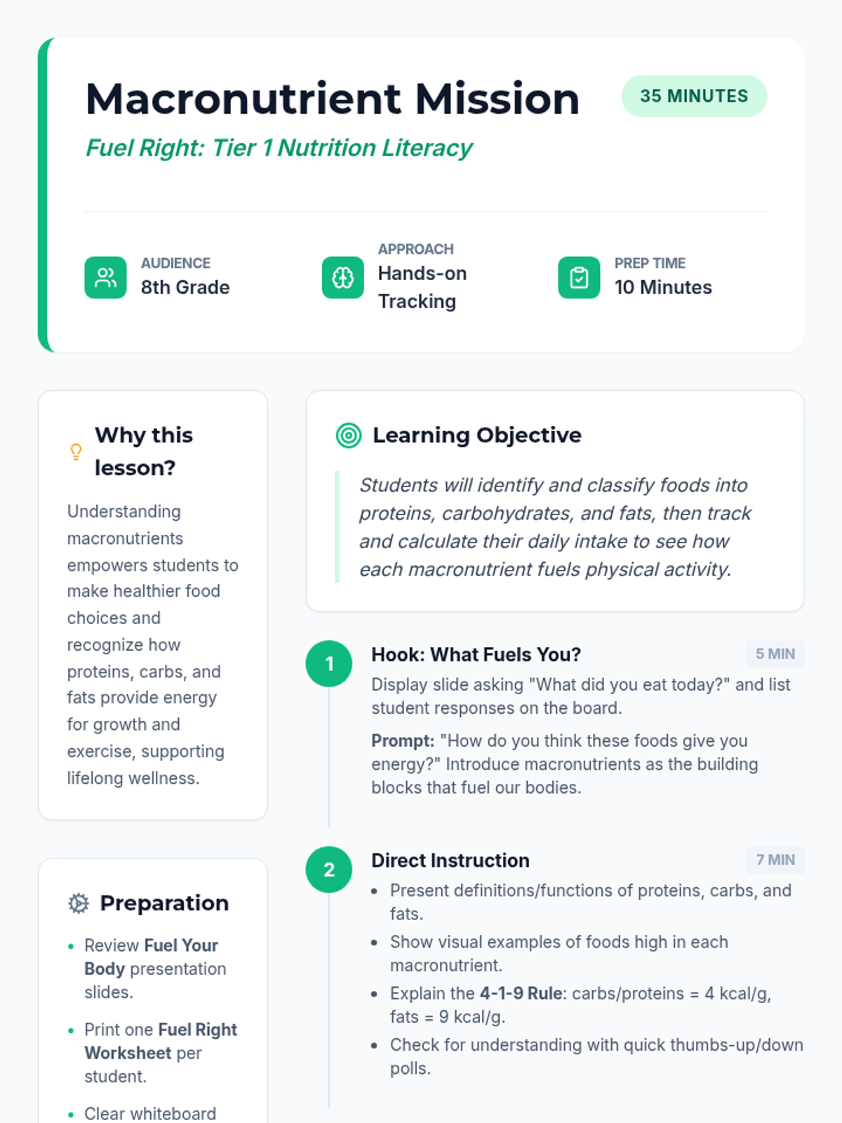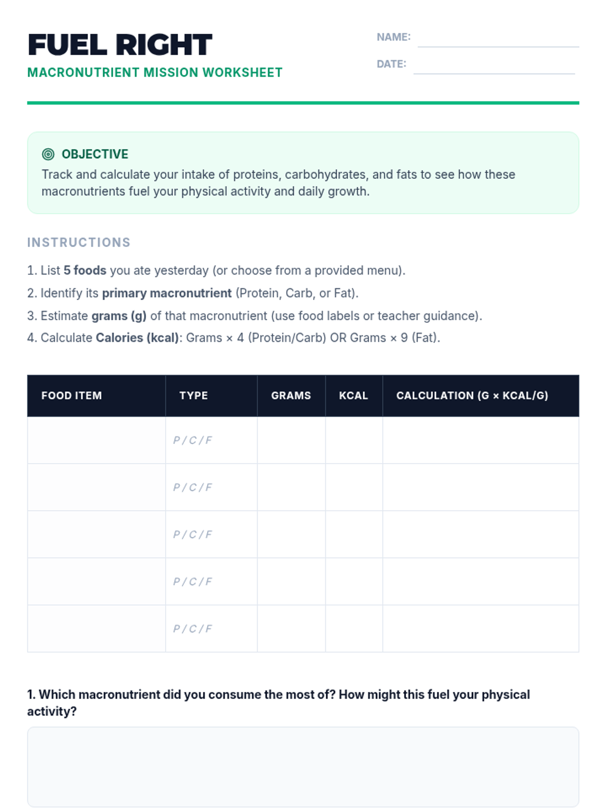 In this 35-minute Tier 1 lesson, 8th graders track their macronutrient intake (proteins, carbohydrates, and fats) to understand how different foods fuel their bodies and physical activity.
