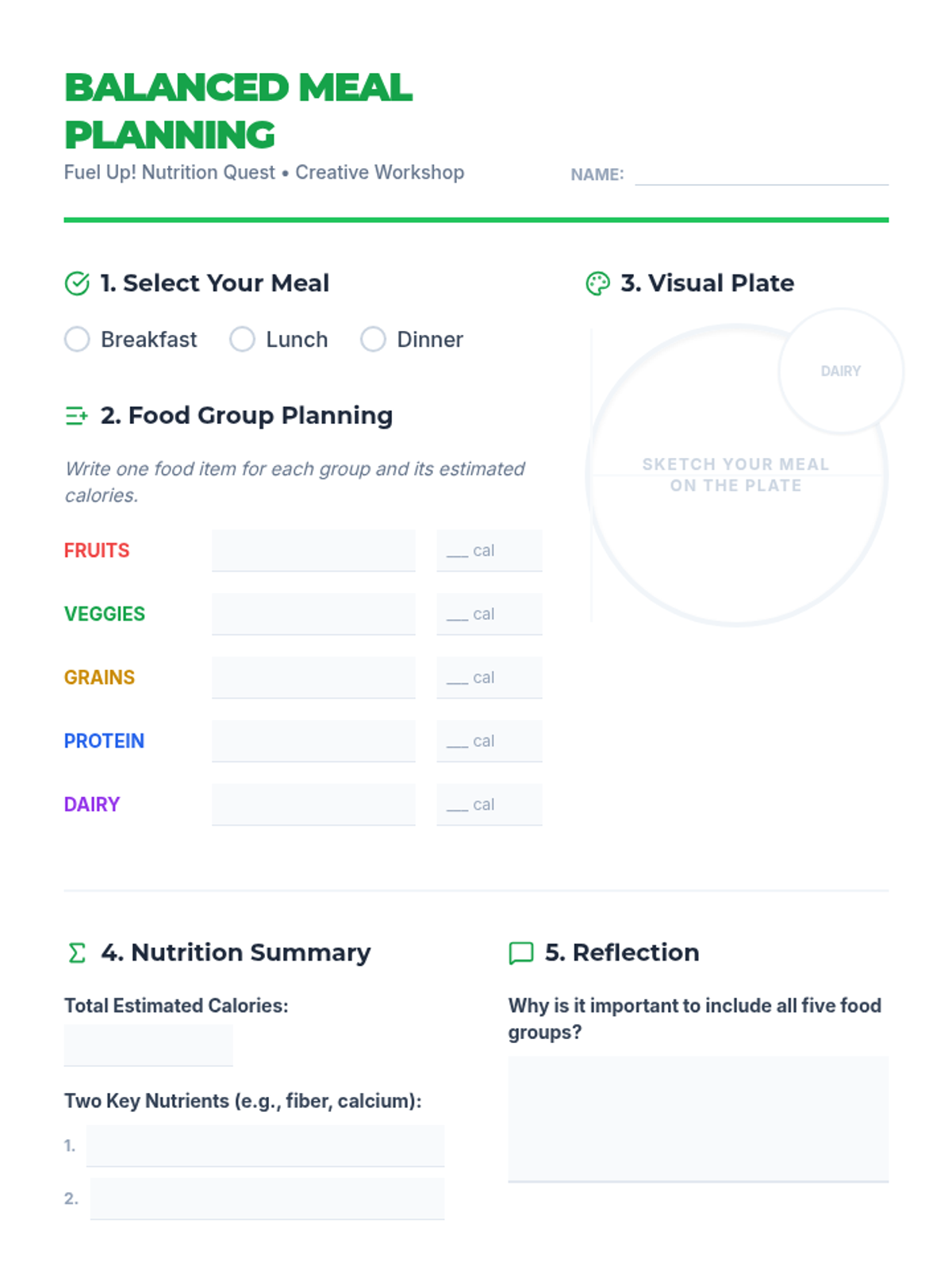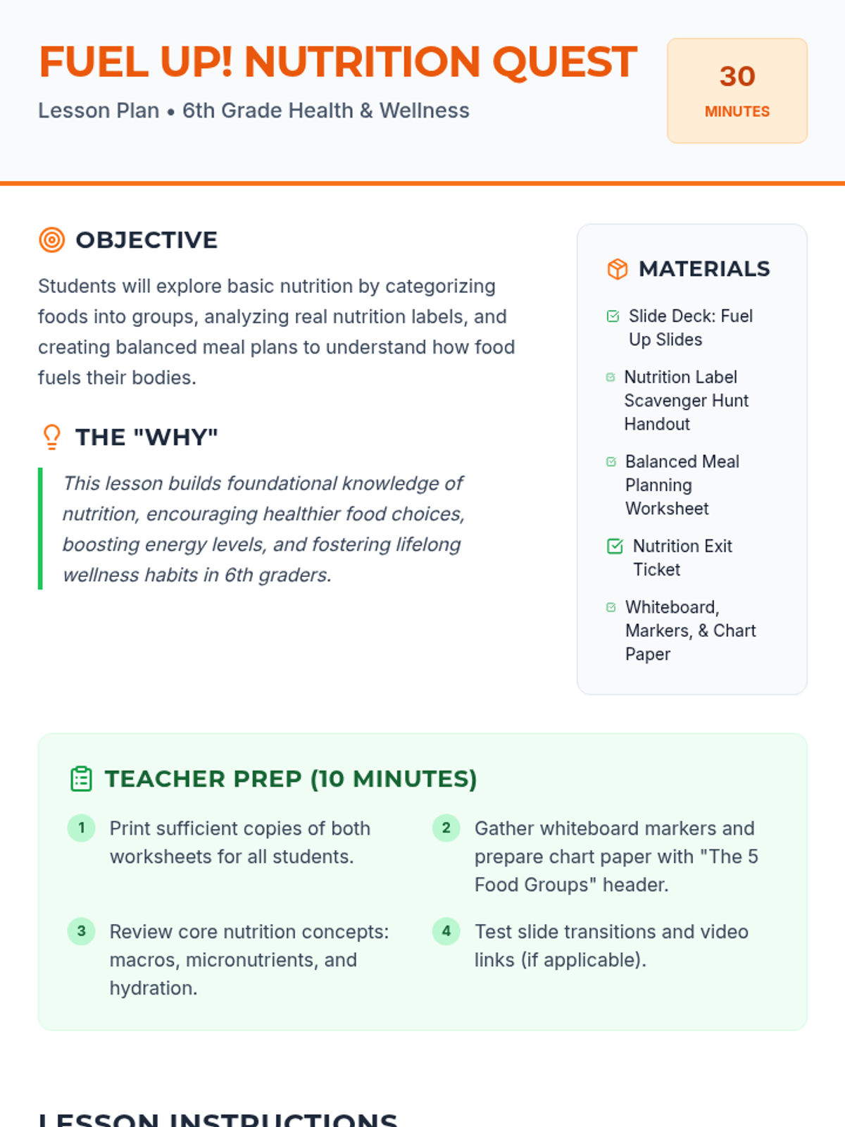 In this engaging 30-minute lesson, 6th graders explore the fundamentals of nutrition, analyze nutrition labels, and design balanced meals to understand how food fuels their bodies.