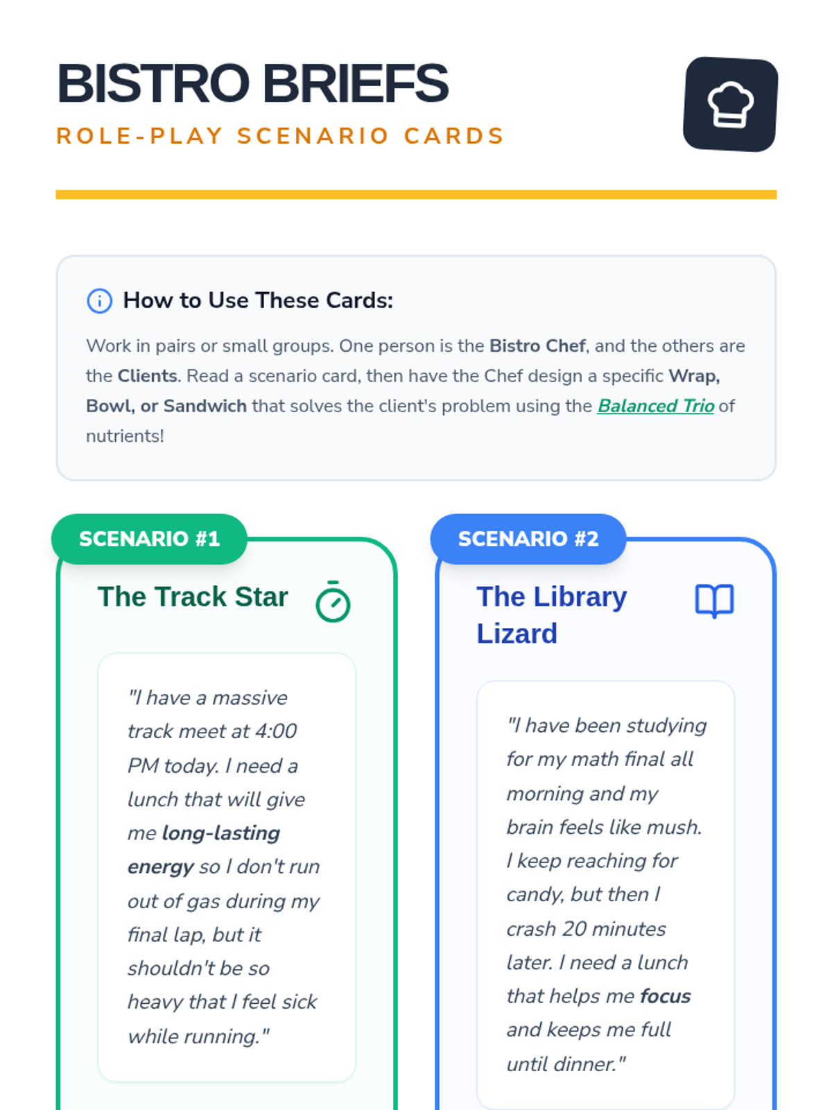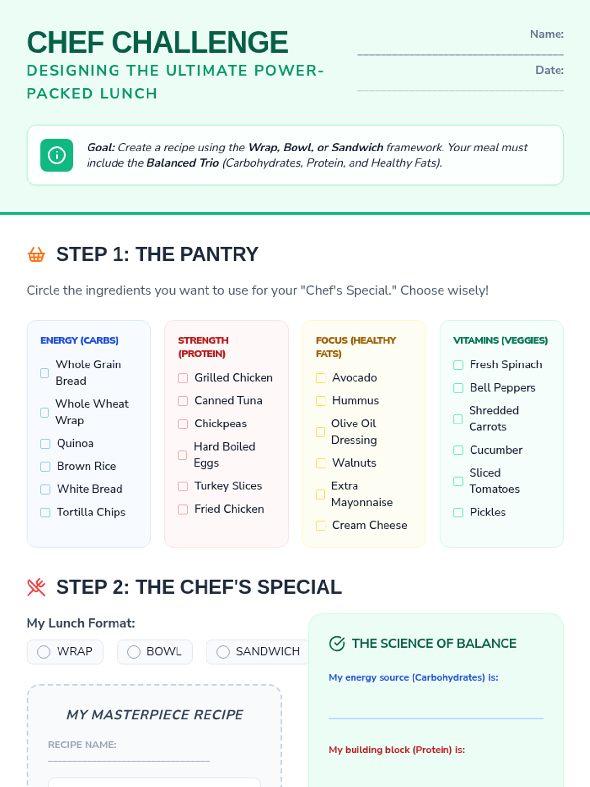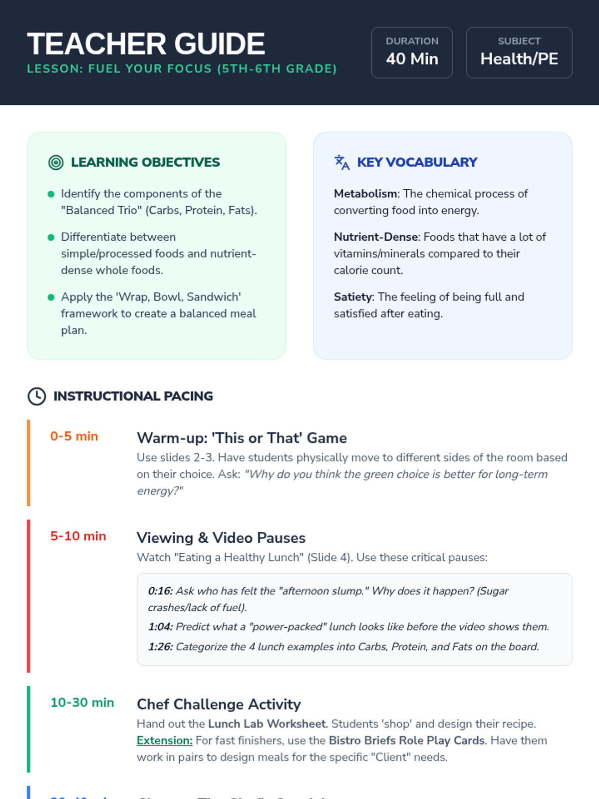 A dynamic lesson for 5th and 6th graders to master the 'Balanced Trio' of nutrients by creating custom healthy lunches using the 'Wrap, Bowl, Sandwich' framework. Students will learn to identify carbohydrates, proteins, and healthy fats through a mix of interactive games, video analysis, and a creative 'Chef Challenge' activity.