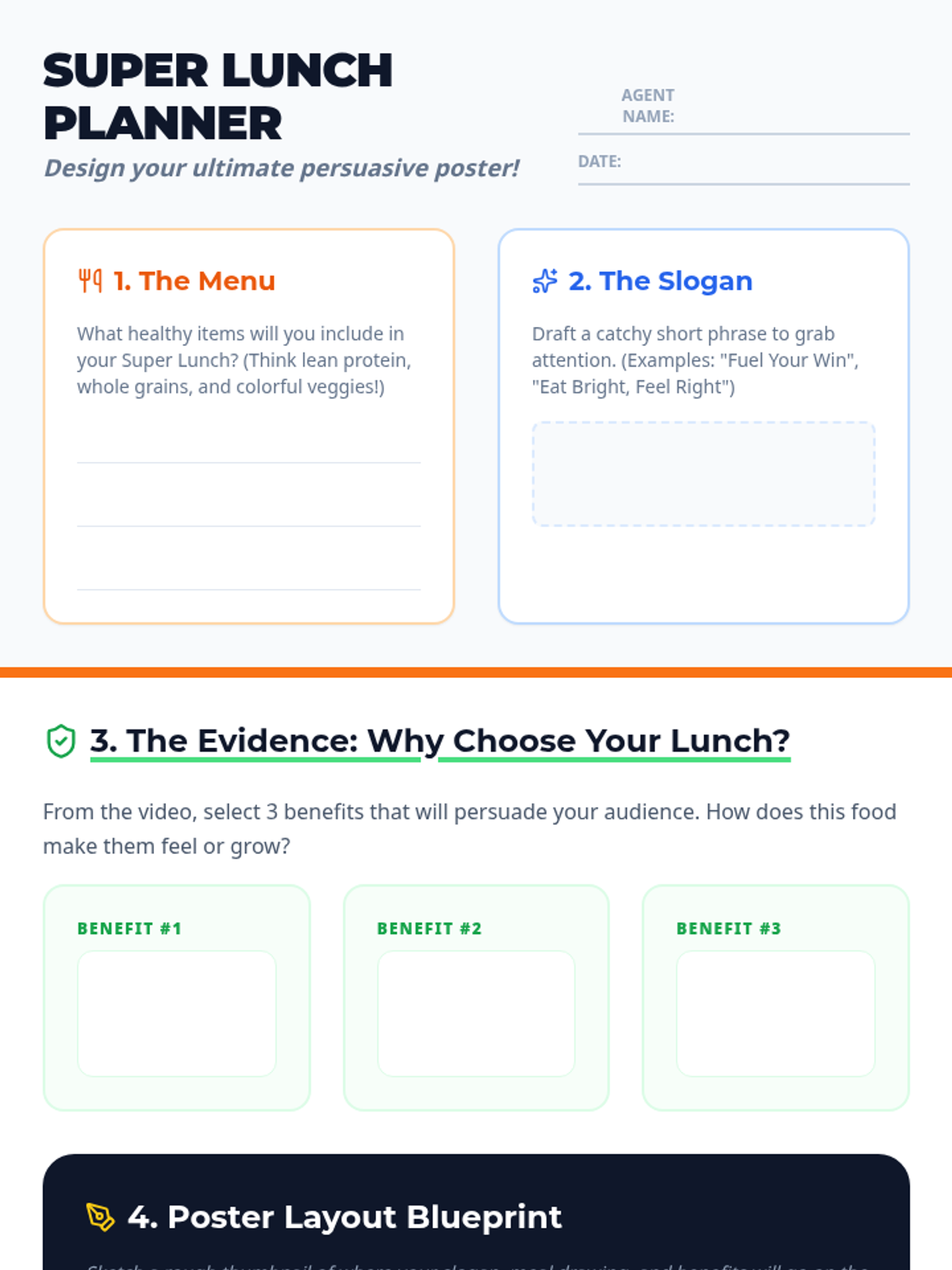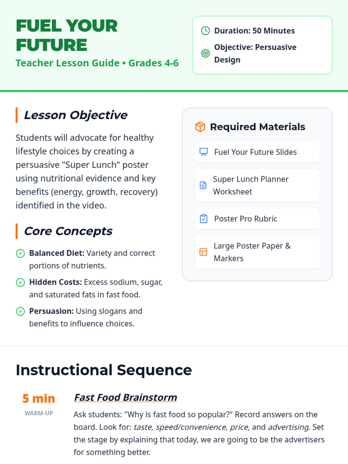 Students investigate the nutritional impact of fast food vs. balanced diets and create a persuasive 'Super Lunch' poster using evidence from the video 'Balanced Diets and Fast Food'.