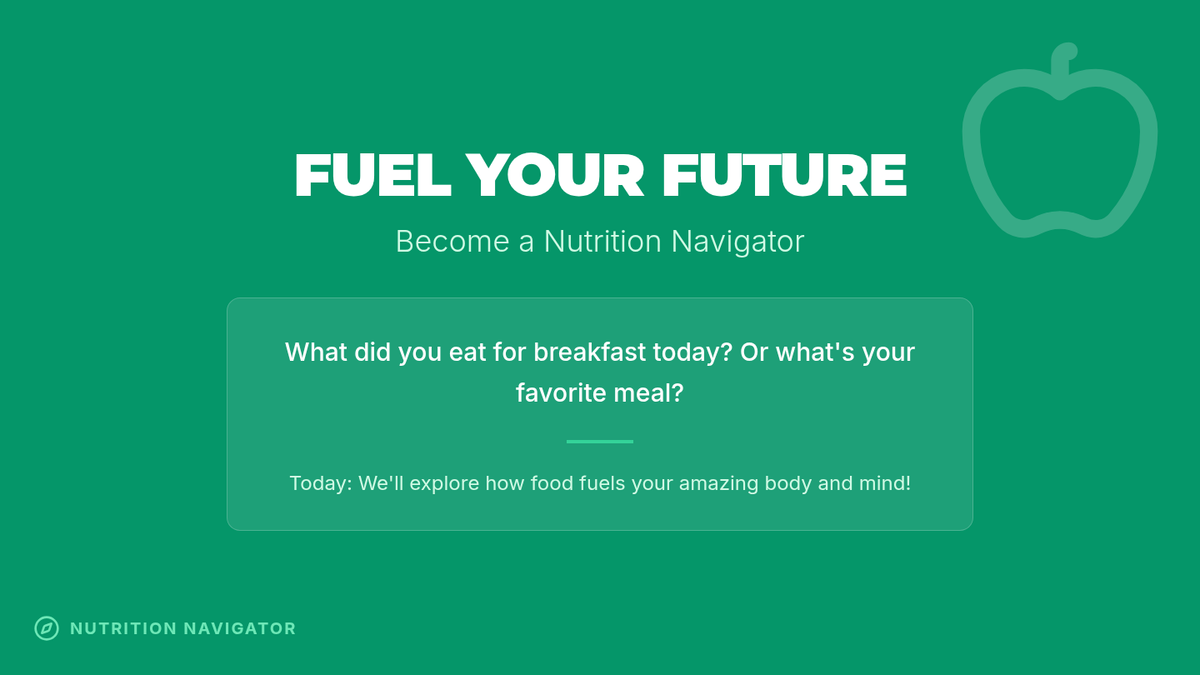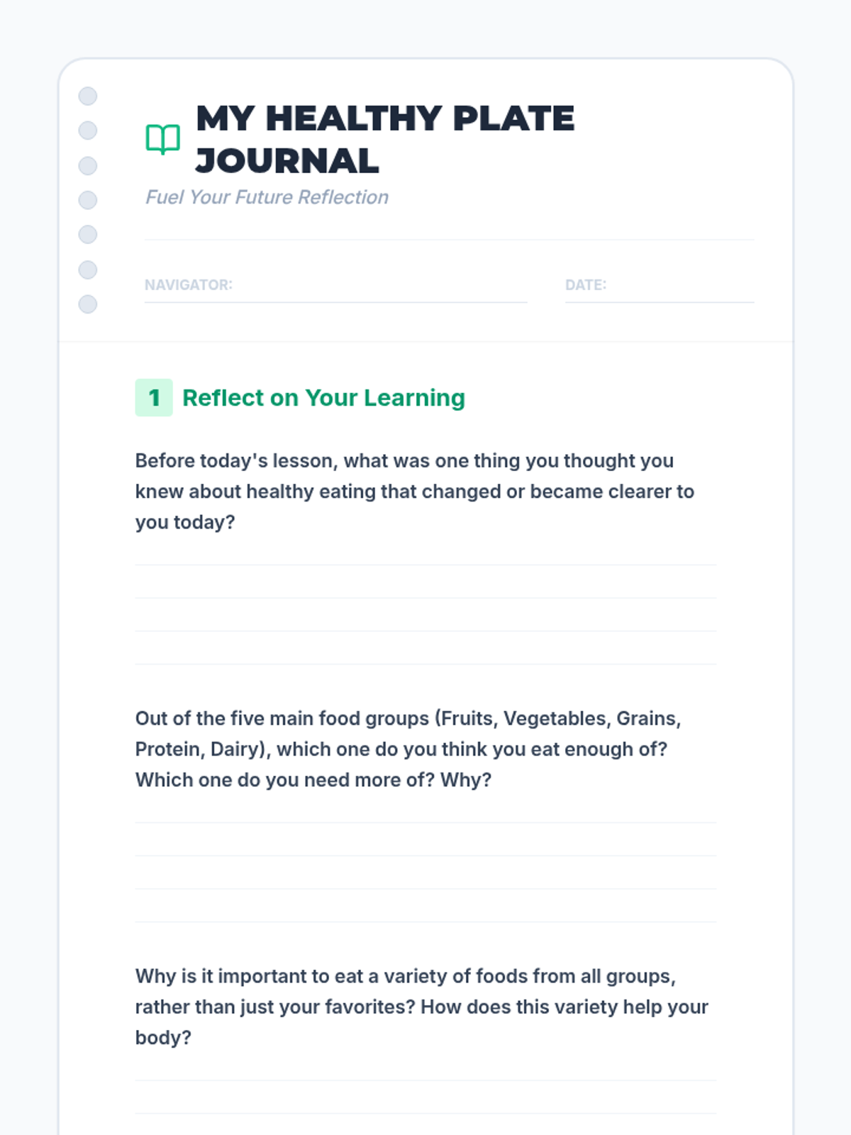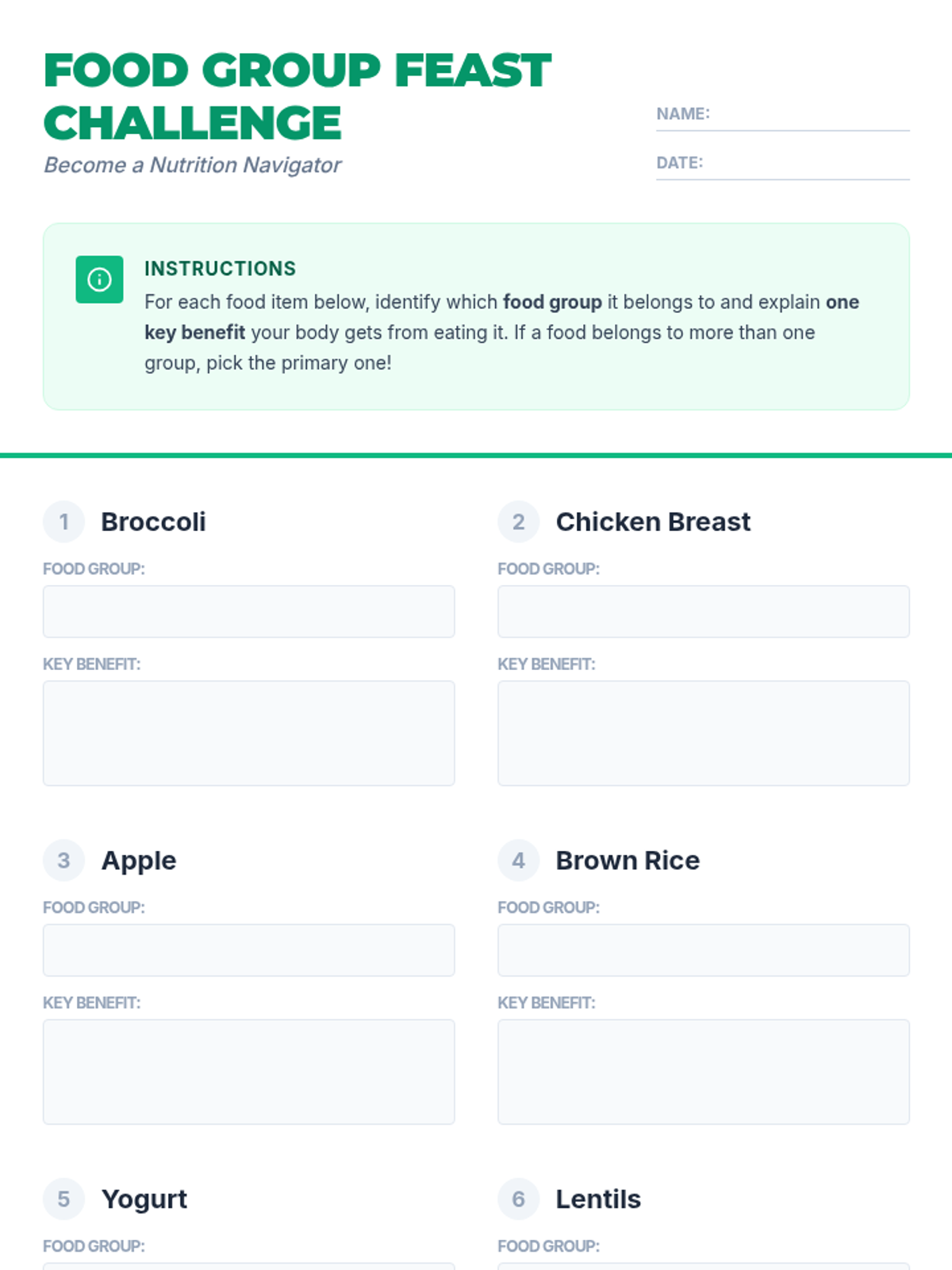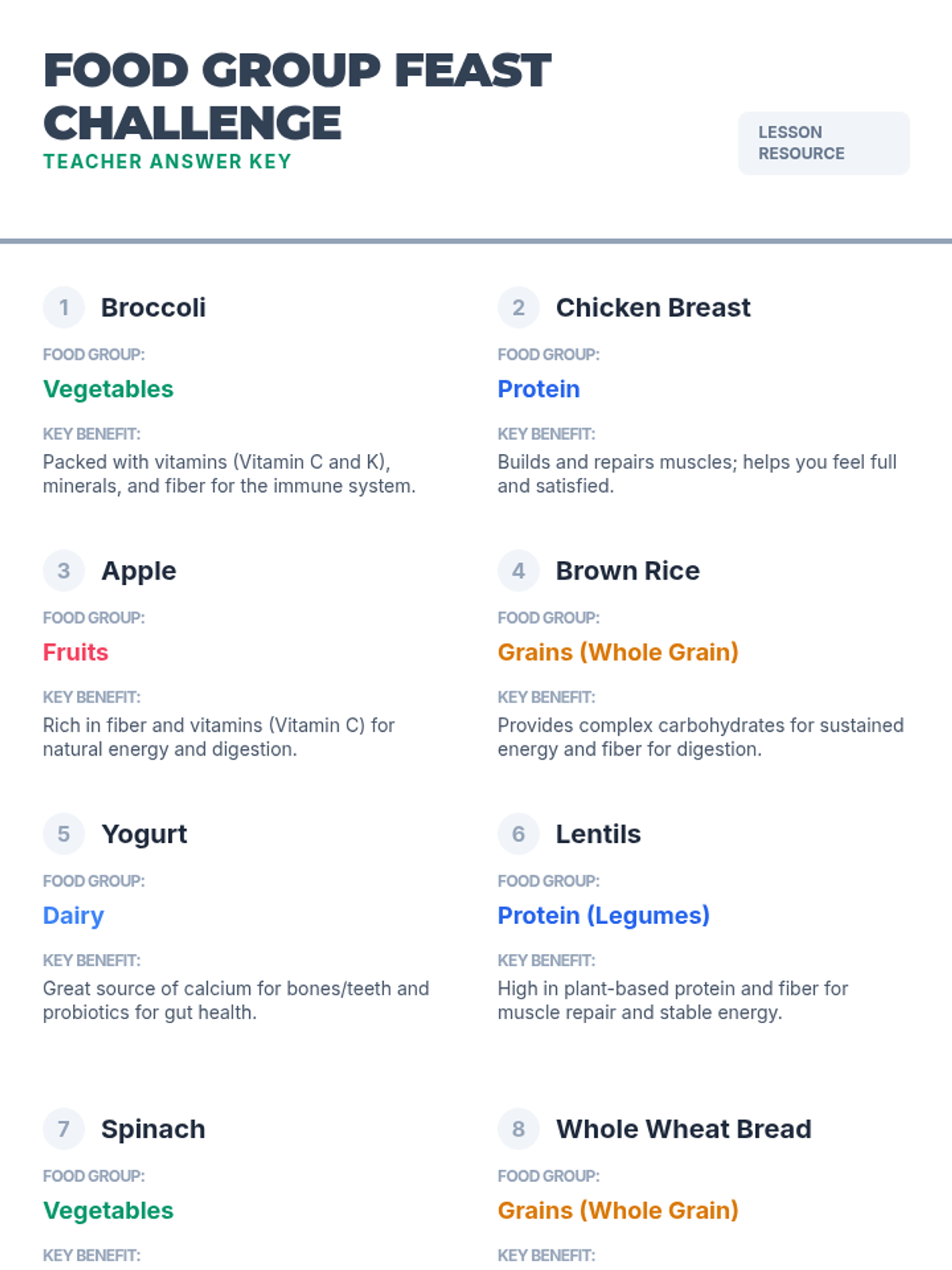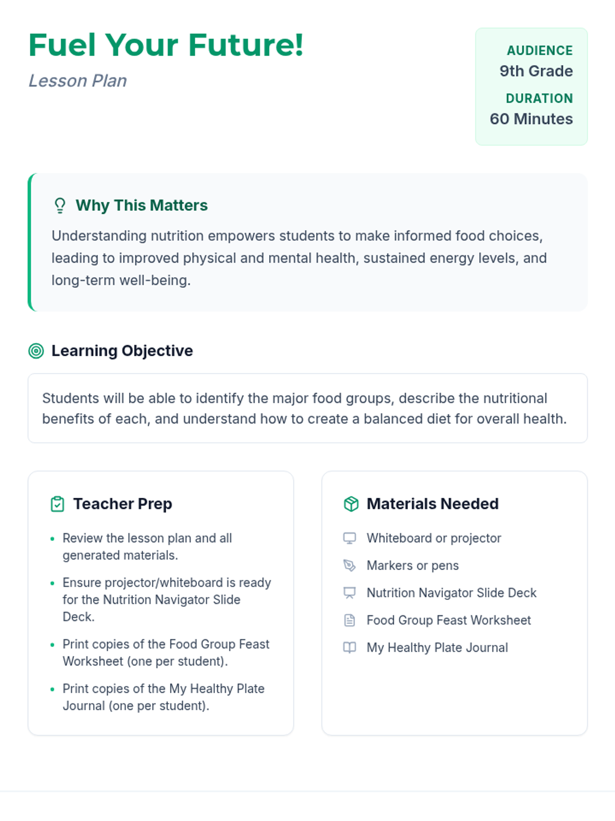 A 60-minute nutrition lesson for 9th graders focusing on the five main food groups, their benefits, and making informed dietary choices. Students engage through interactive slides, a categorization activity, and personal reflection.