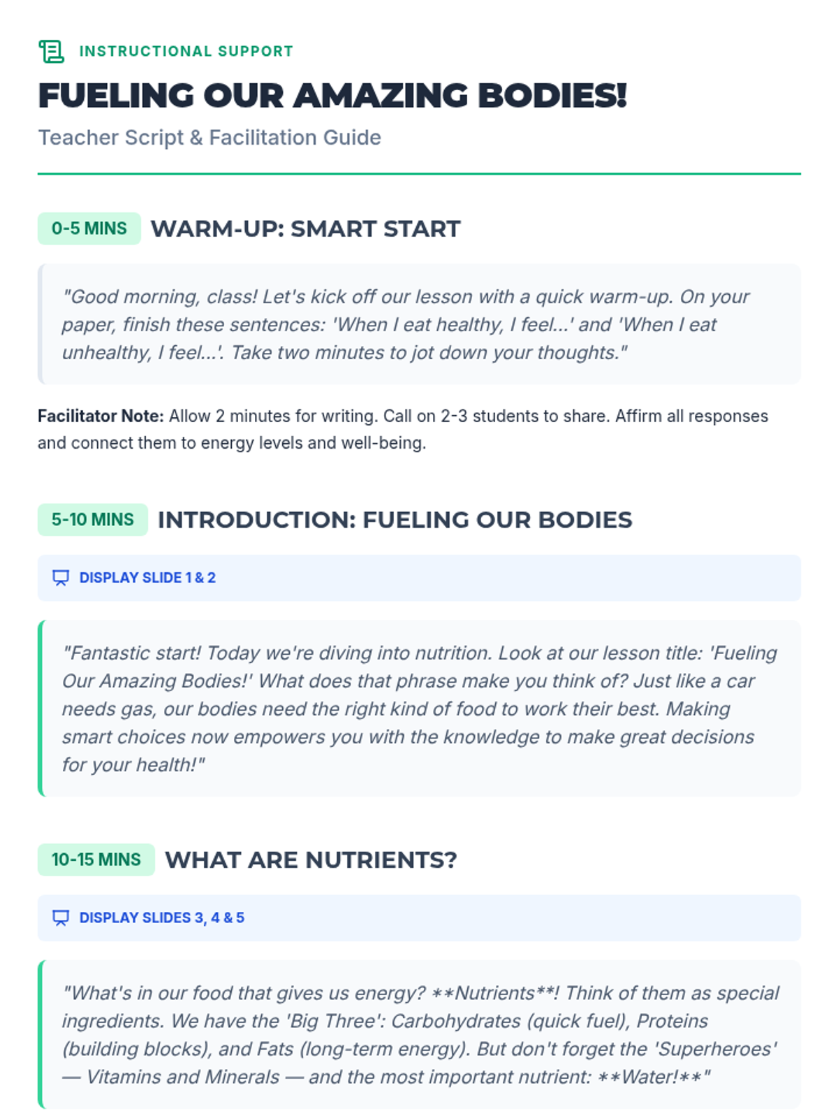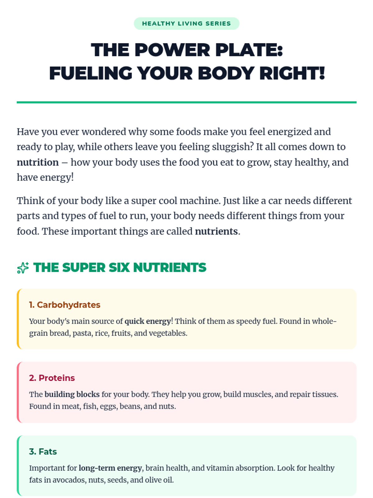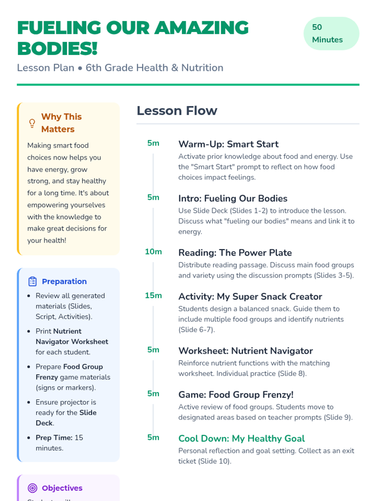 This interactive lesson introduces 6th-grade students to the fundamentals of nutrition, focusing on essential nutrients, balanced meals using the 'Power Plate' concept, and making healthy choices to energize their bodies.