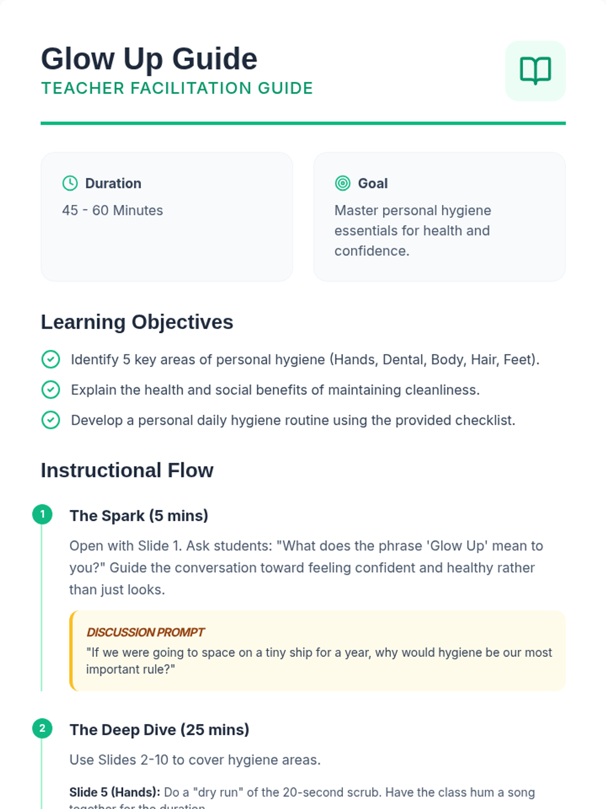 A comprehensive lesson on personal hygiene routines, the science of body odor, and the social-emotional benefits of self-care, designed specifically for upper elementary students.