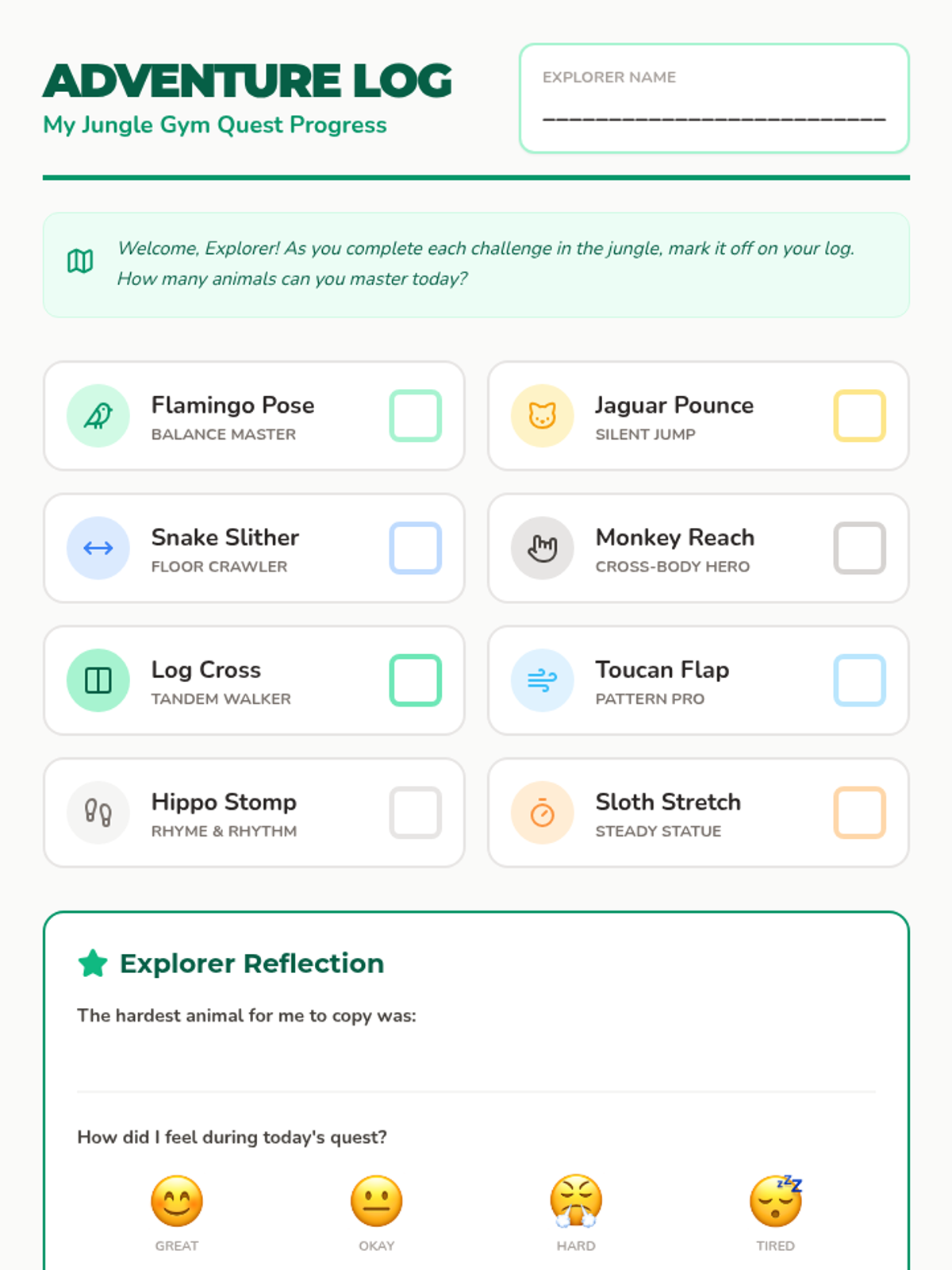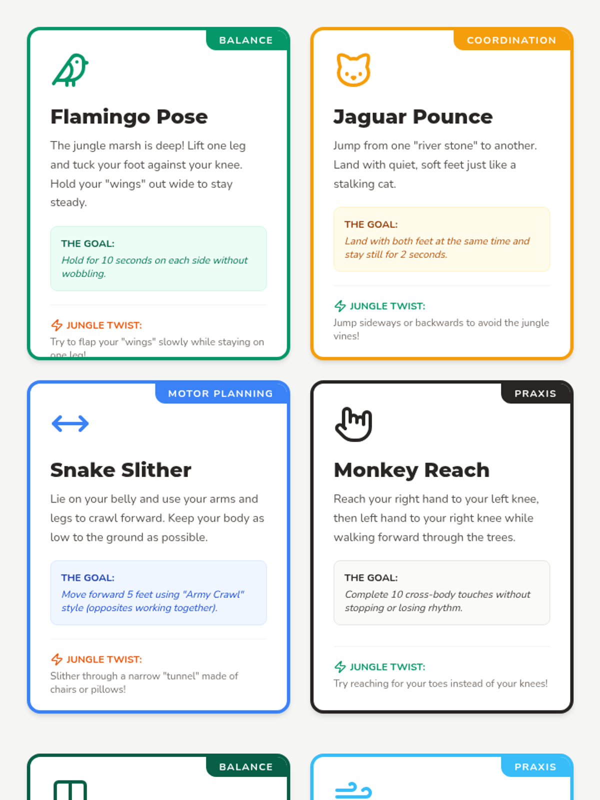 A series of engaging, jungle-themed gross motor activities designed to improve balance, coordination, and motor planning for pediatric occupational therapy.