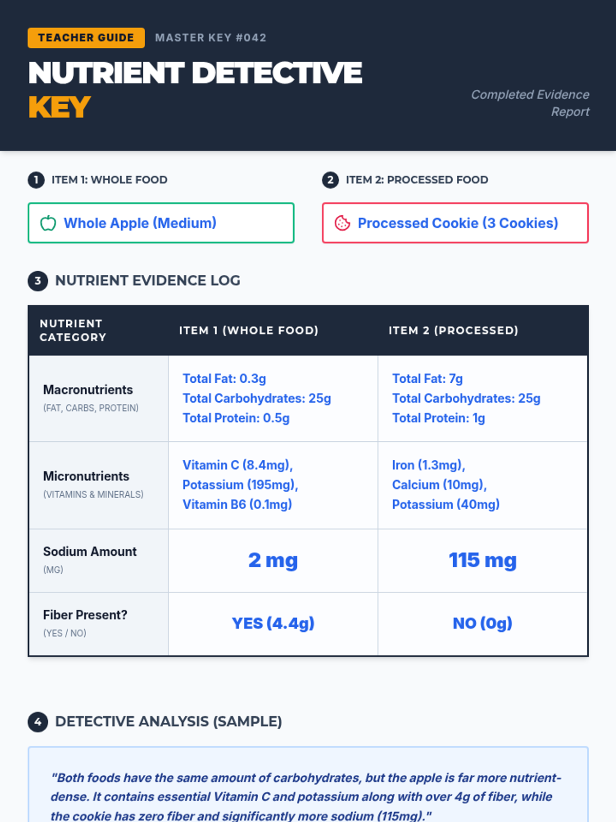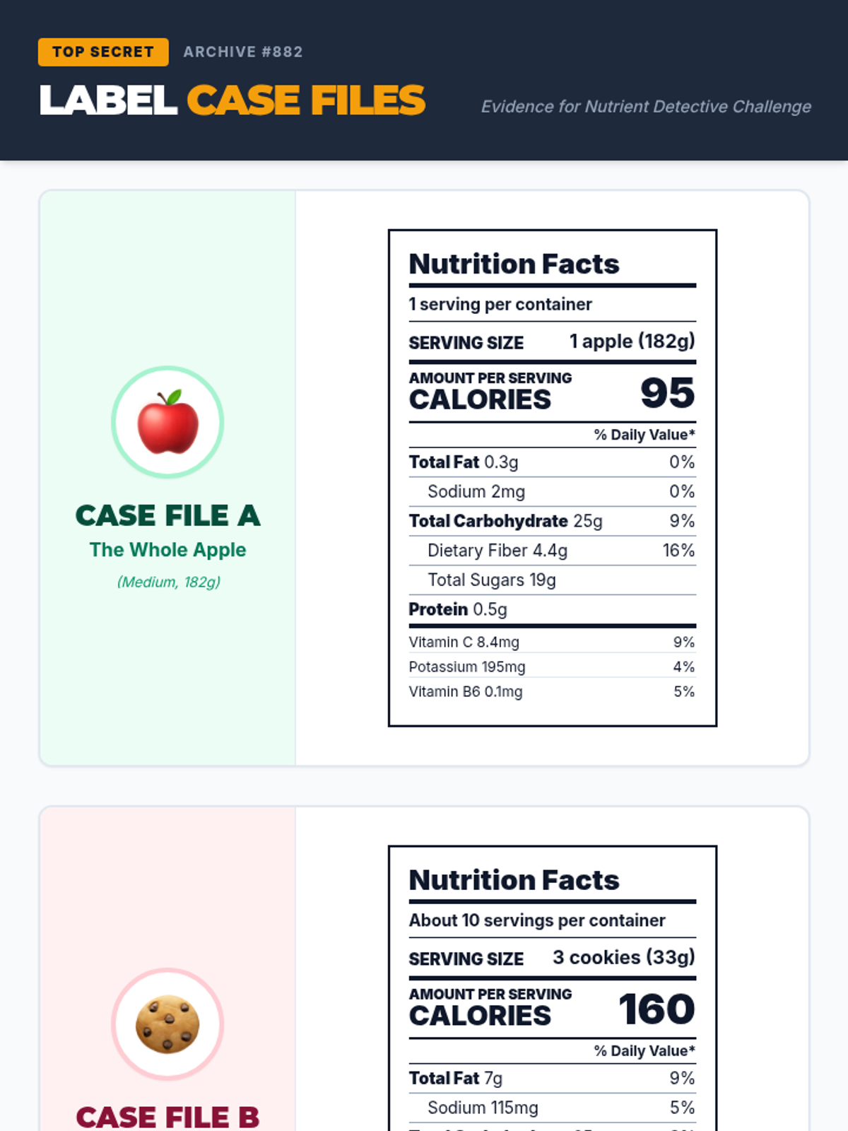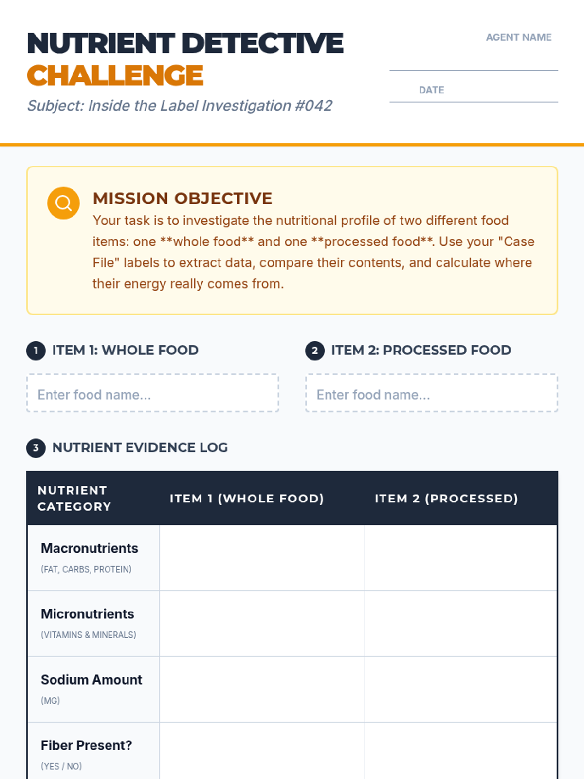 A hands-on investigation into nutrition labels where students compare whole and processed foods to understand nutrient density and calorie composition.