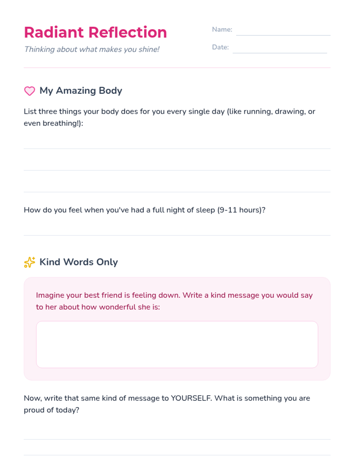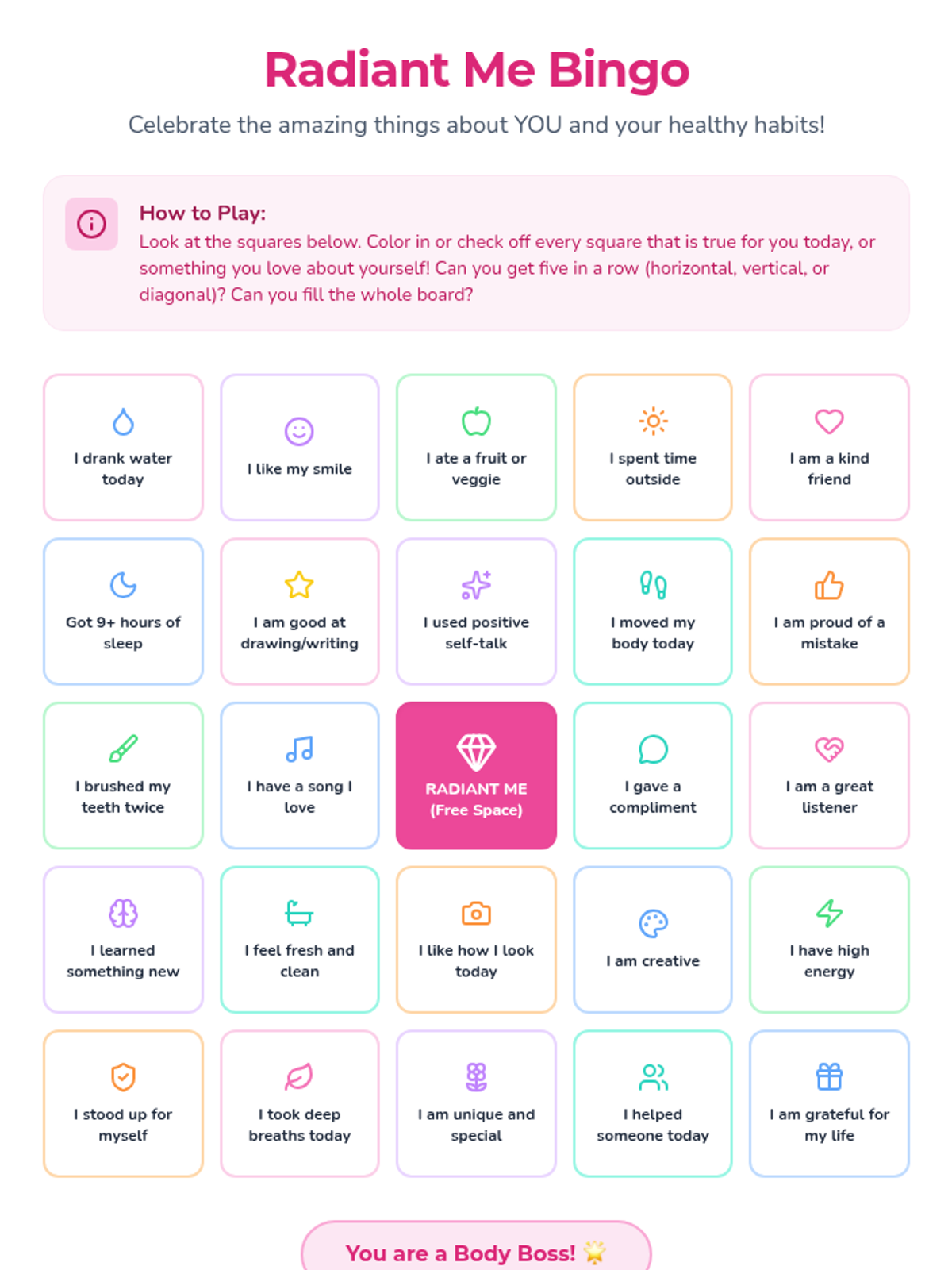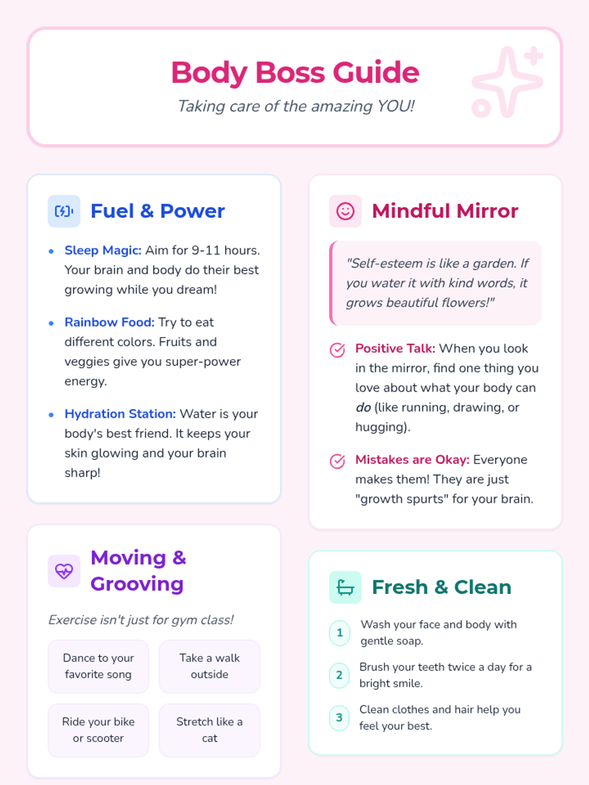 A nurturing lesson for 4th-grade girls focused on developing healthy physical habits and a positive self-image through reflection and interactive play.