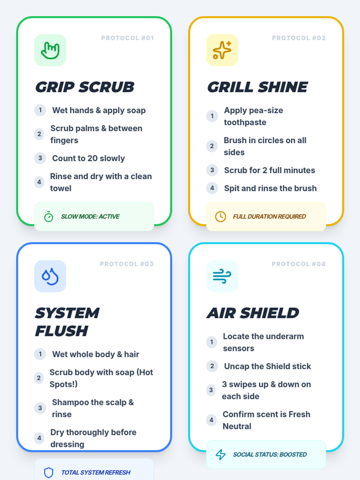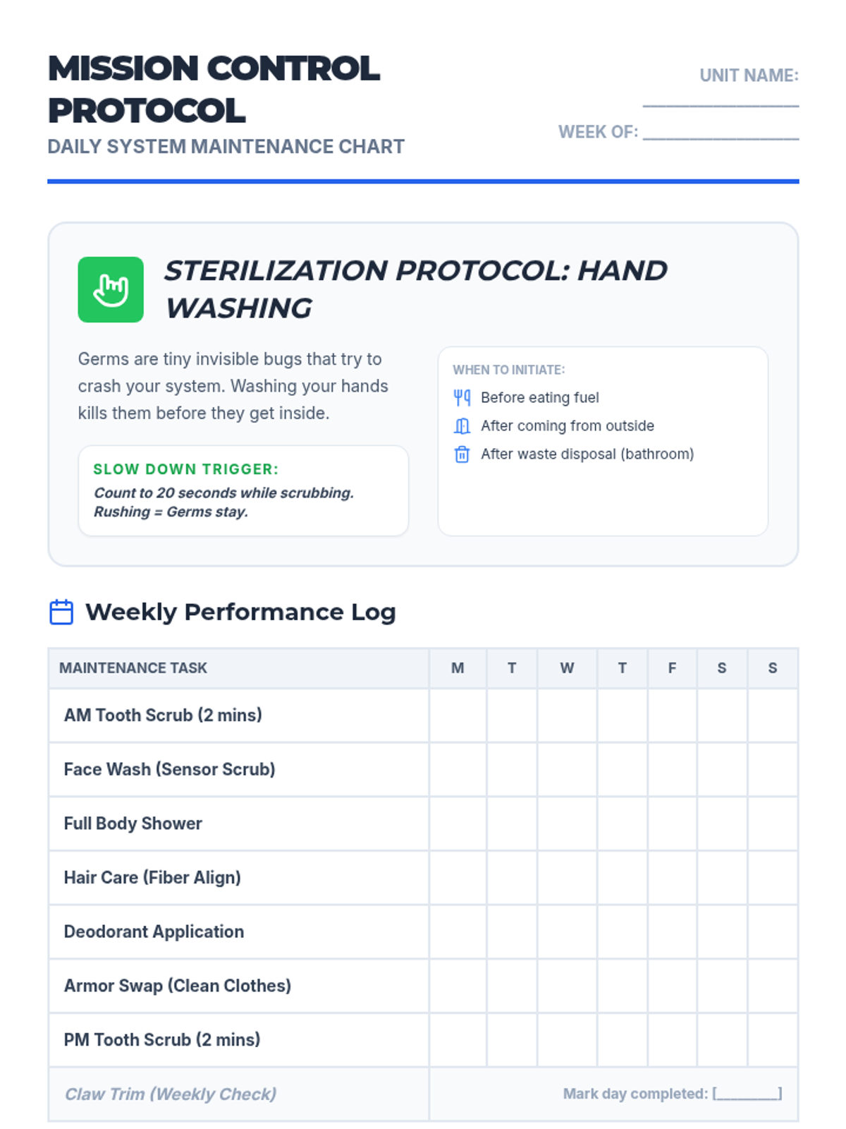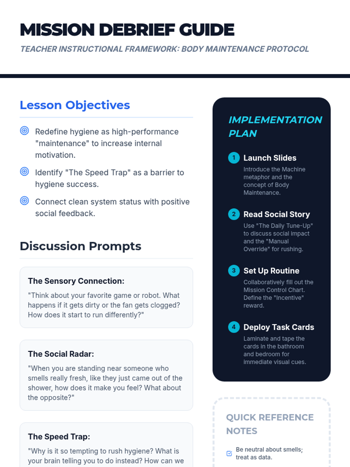 A comprehensive hygiene lesson for older children (ages 9-12) framed through a high-performance machine theme to address reluctance and impulsivity. Includes a visual schedule, social narrative, task cards, and teacher guidance.