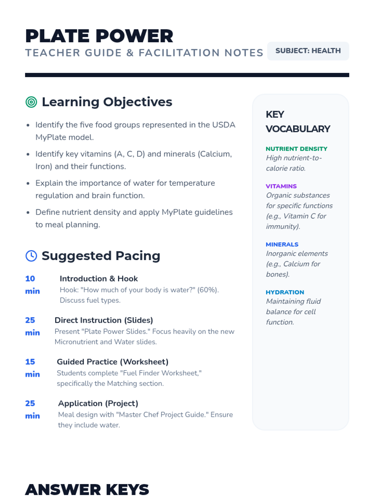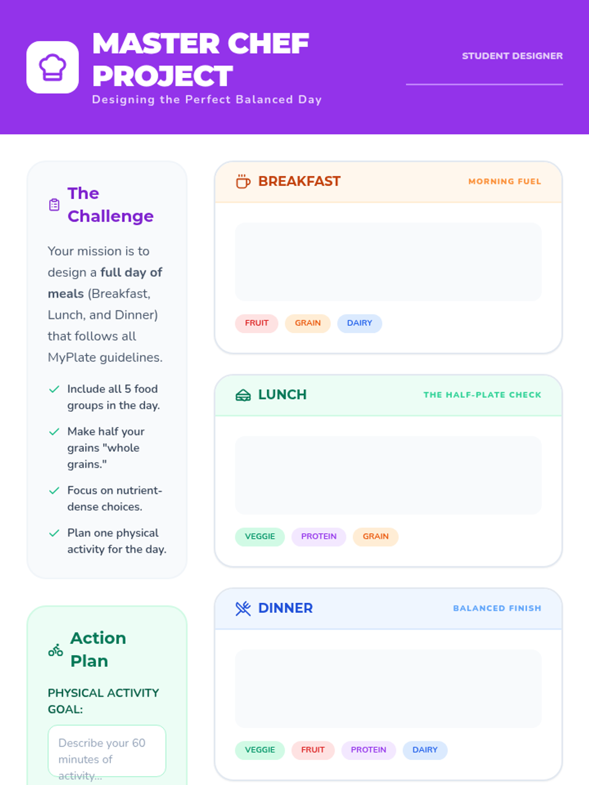 A comprehensive lesson on the USDA MyPlate guidelines, focusing on the five food groups, nutrient density, and planning balanced meals for a healthy lifestyle.