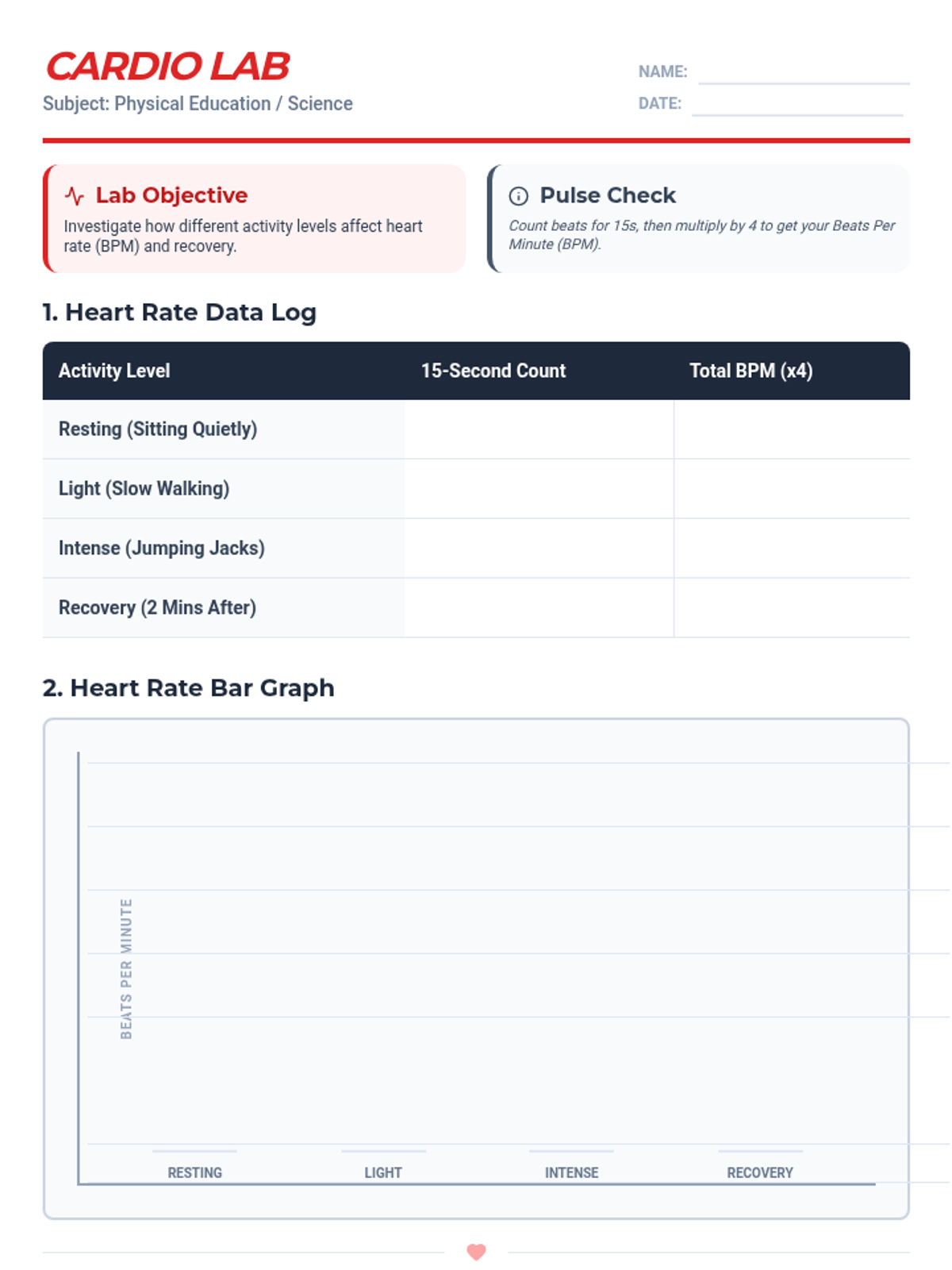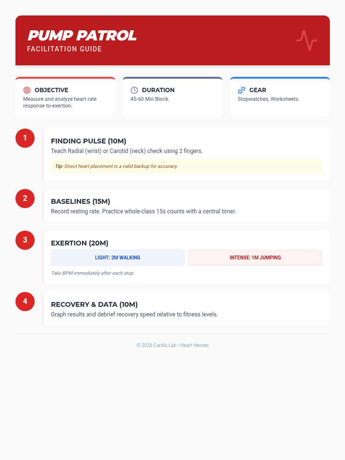 Students learn how to find their pulse and track their heart rate before, during, and after a physical activity challenge.