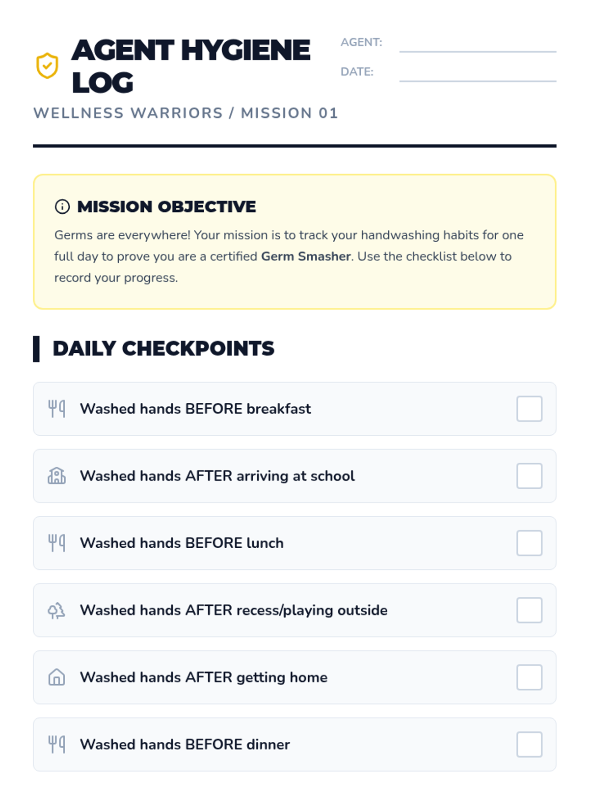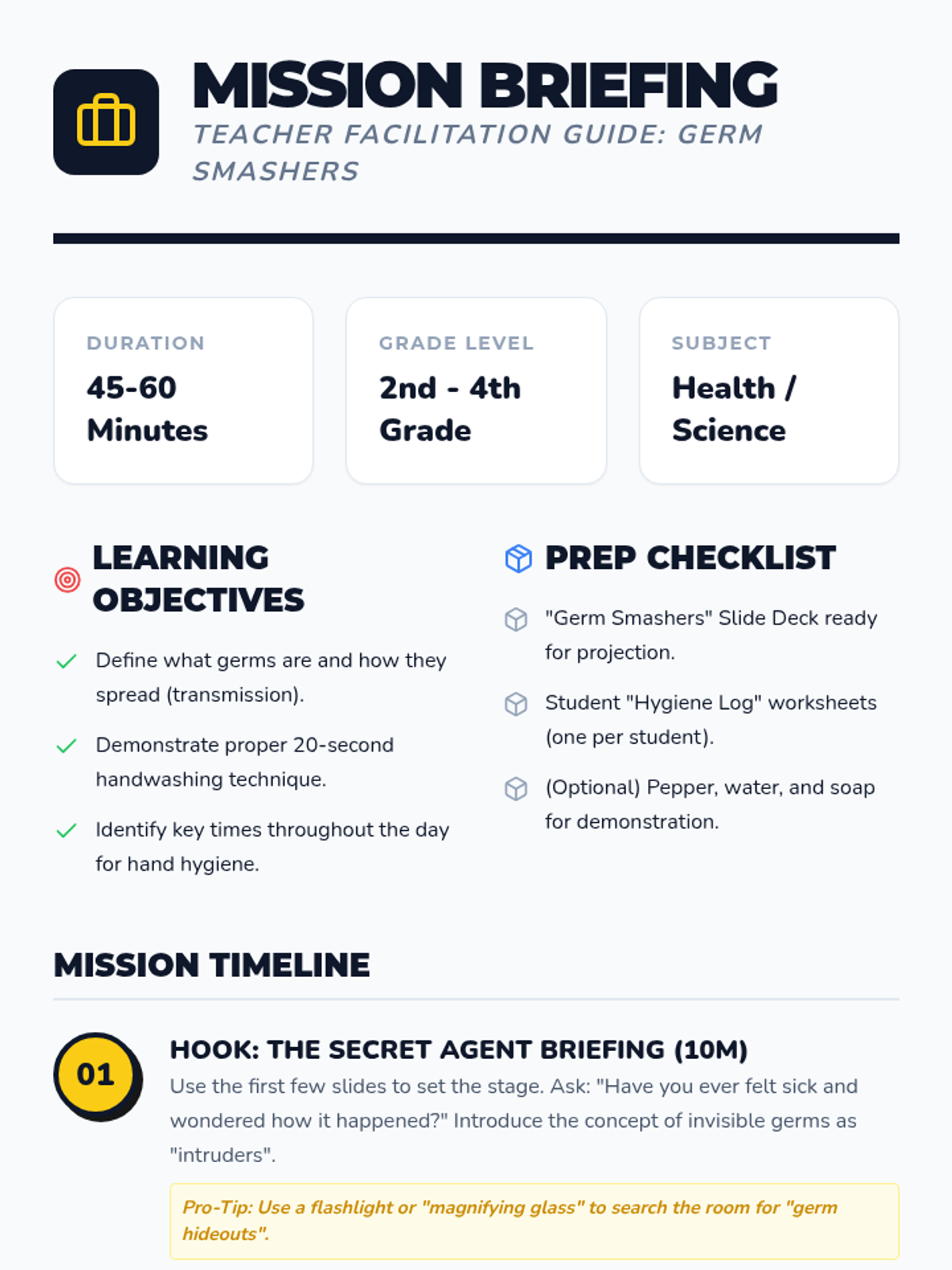 Students become 'Health Agents' to learn about how germs spread and the science of handwashing through interactive demonstrations and mission-based logs. They will identify common germ 'hideouts' and master the 20-second handwashing technique.