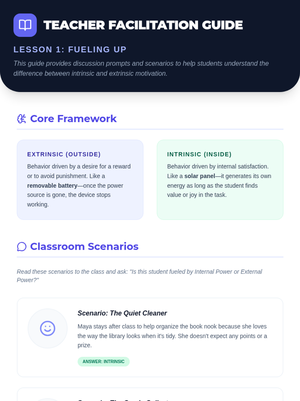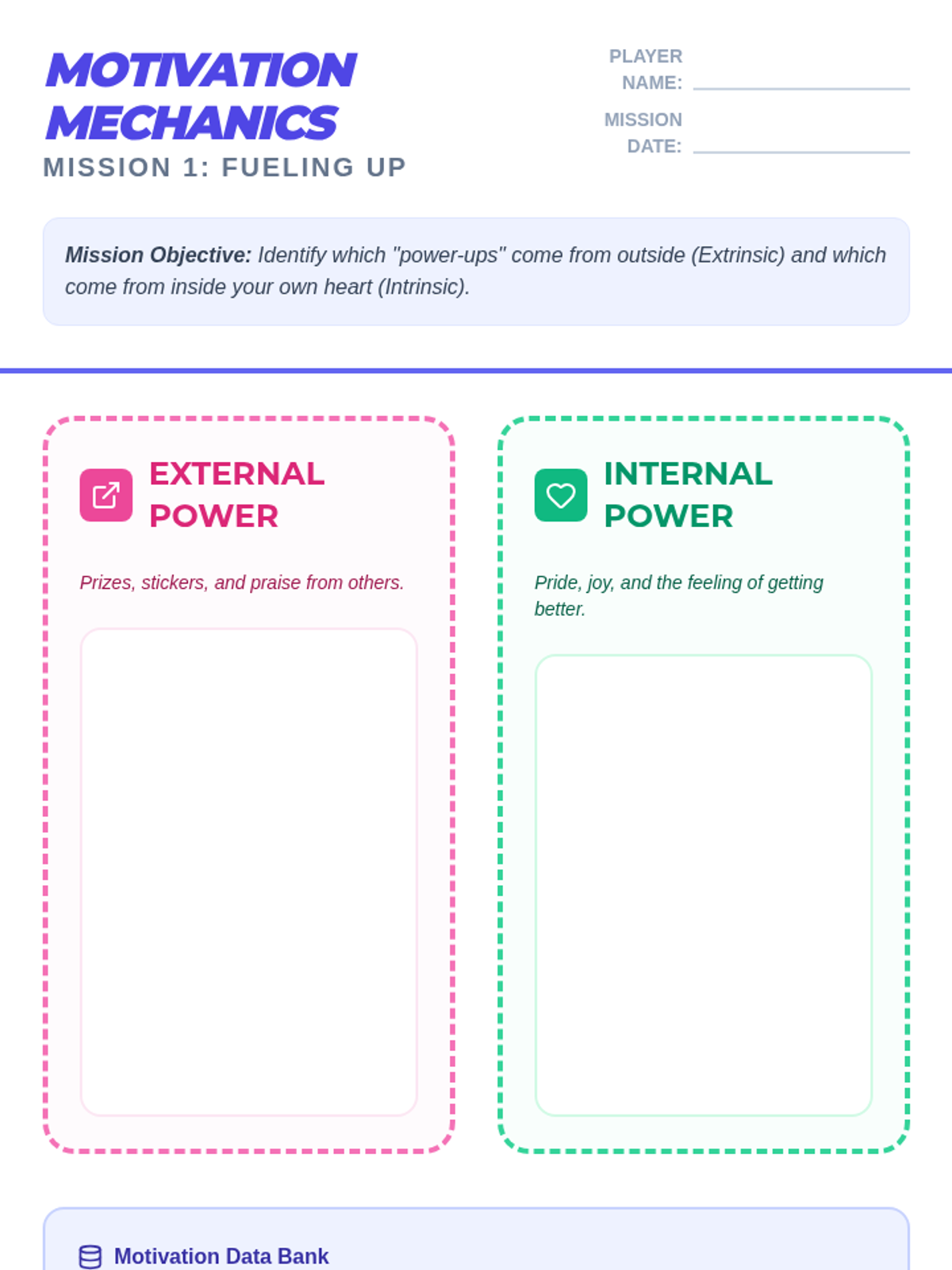 Students categorize different motivators into internal and external categories and discuss which types of motivation are more sustainable.