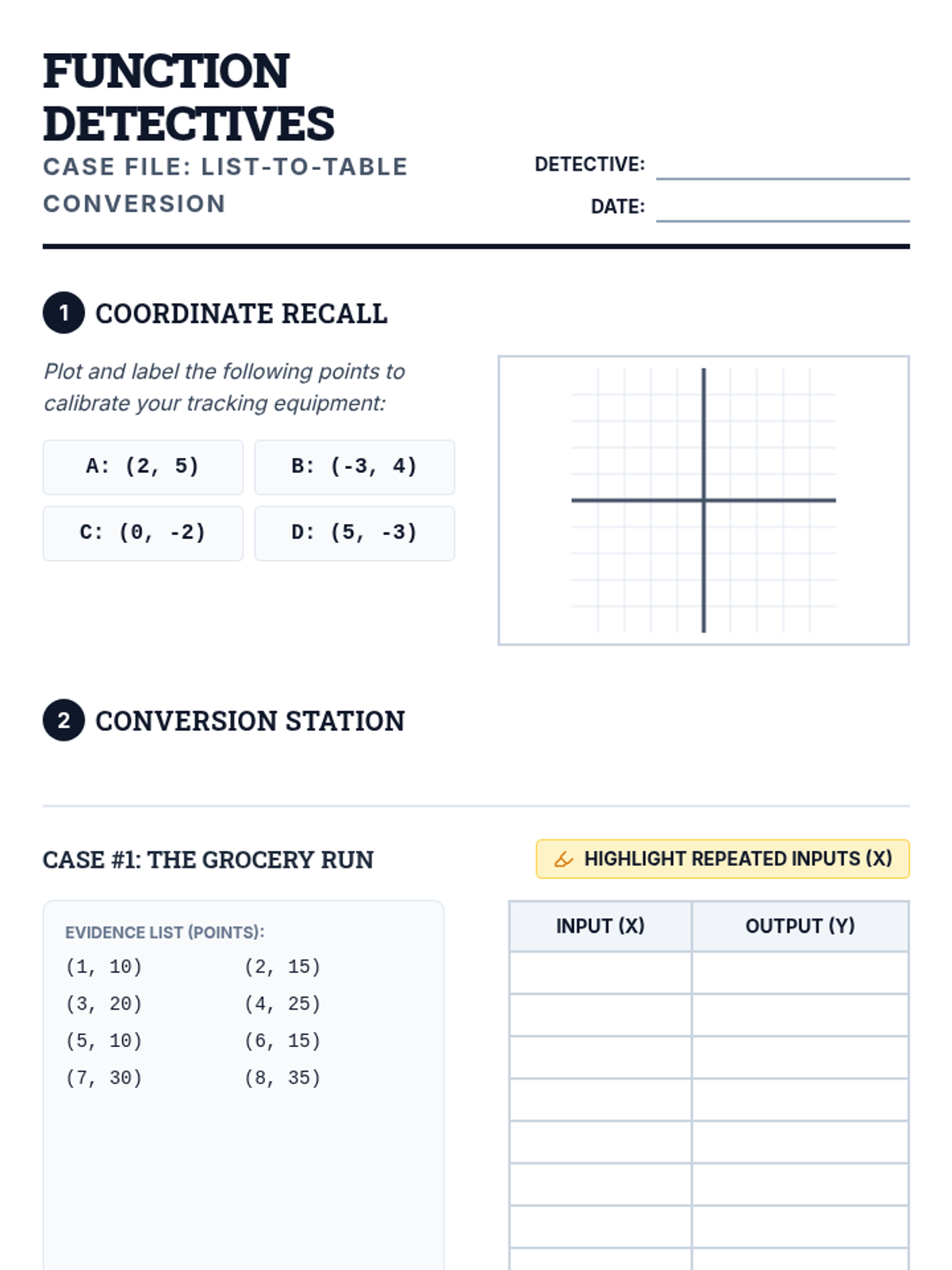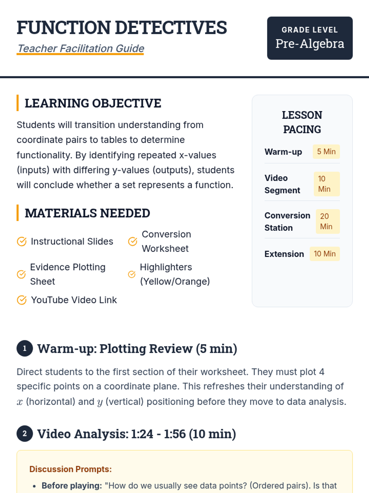 Students transition from coordinate pairs to tables, identifying repeated inputs to determine if a set of data represents a function. The lesson includes a plotting warm-up, a video analysis of list-to-table conversion, and a hands-on 'Conversion Station' activity.