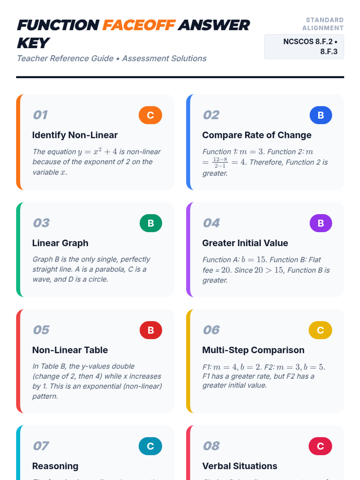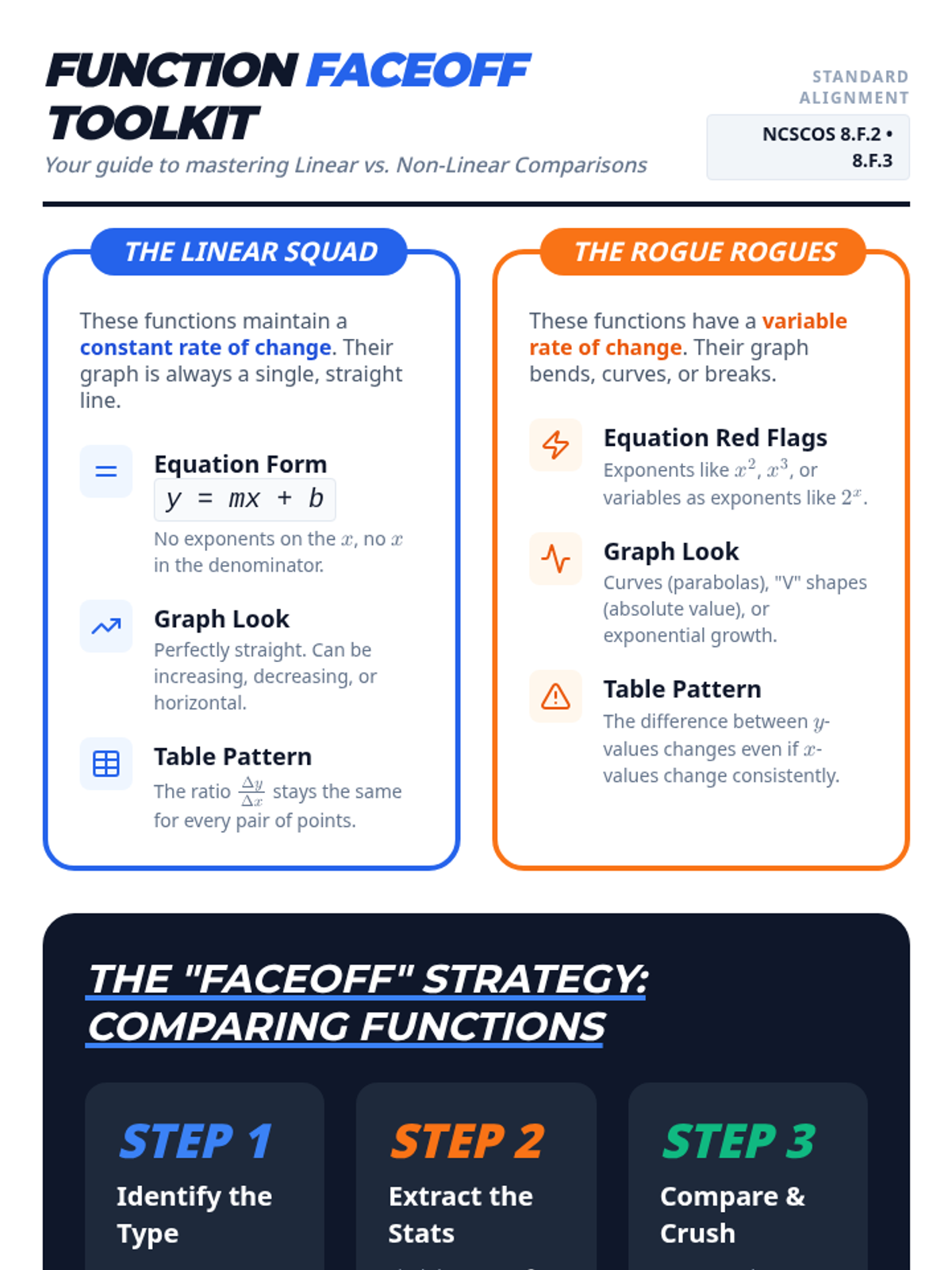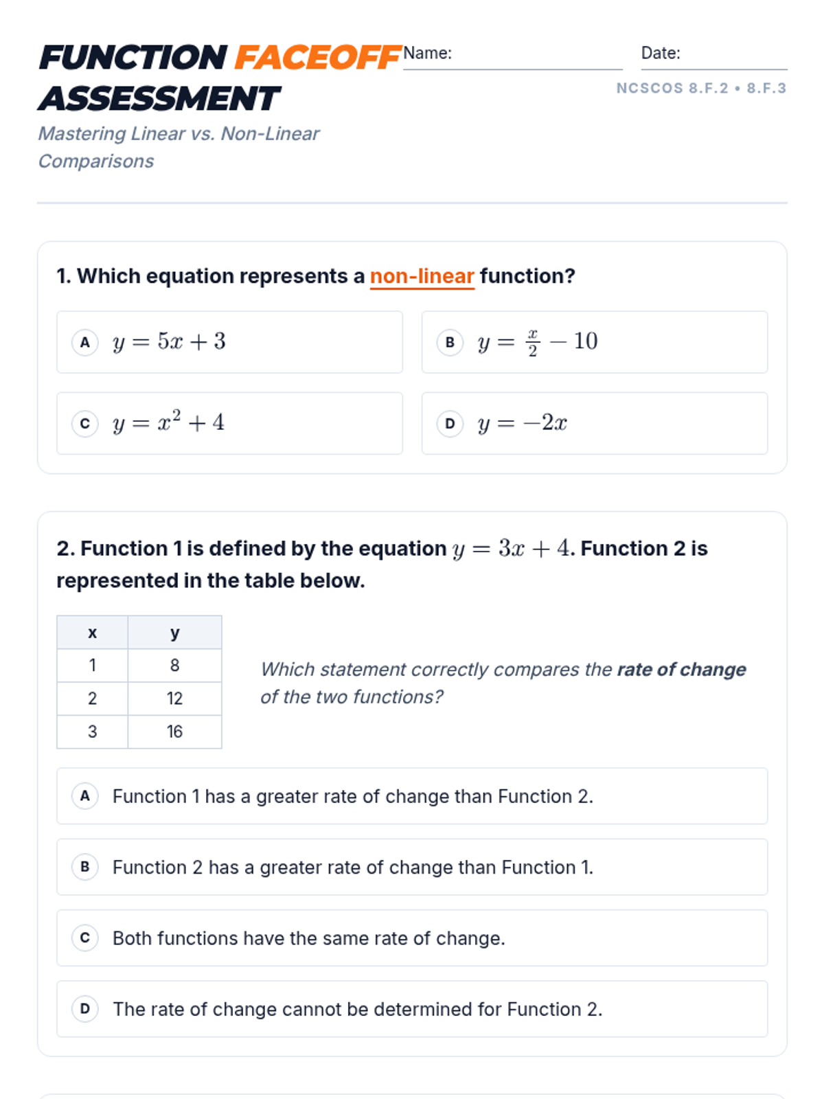 In this lesson, students master the ability to compare linear and non-linear functions across multiple representations: tables, graphs, equations, and verbal descriptions. Aligned to NCSCOS 8.F.2 and 8.F.3, students will identify key characteristics like constant rates of change and initial values to distinguish between different types of functional relationships.