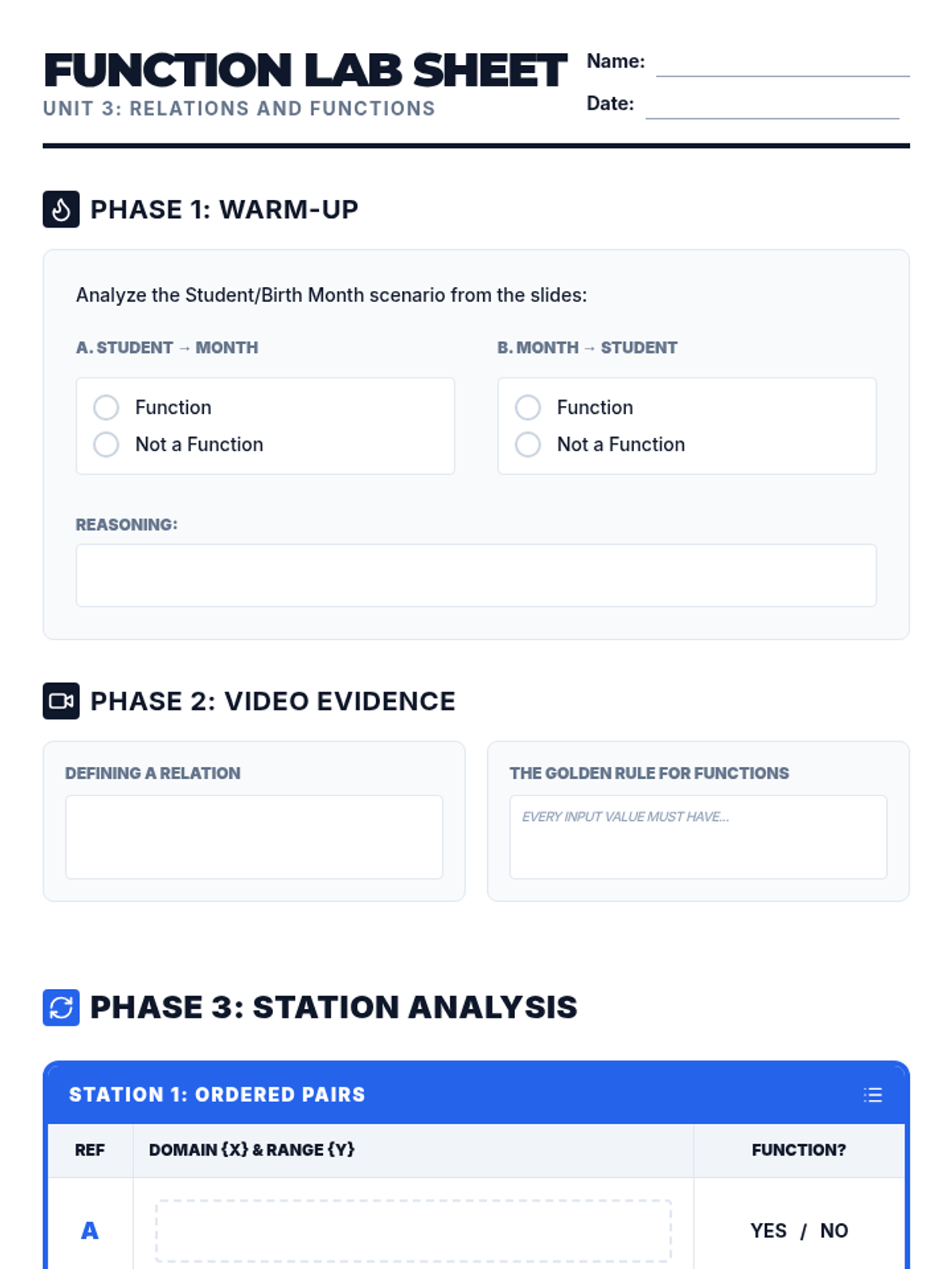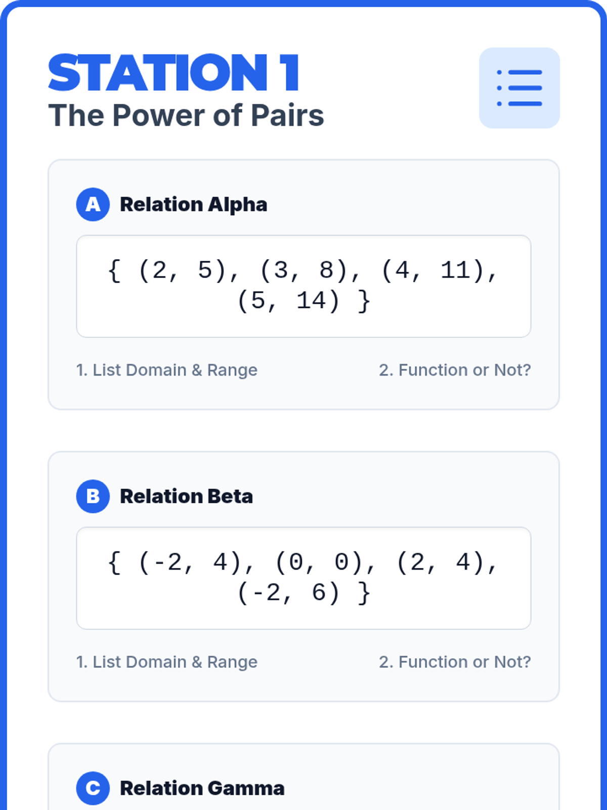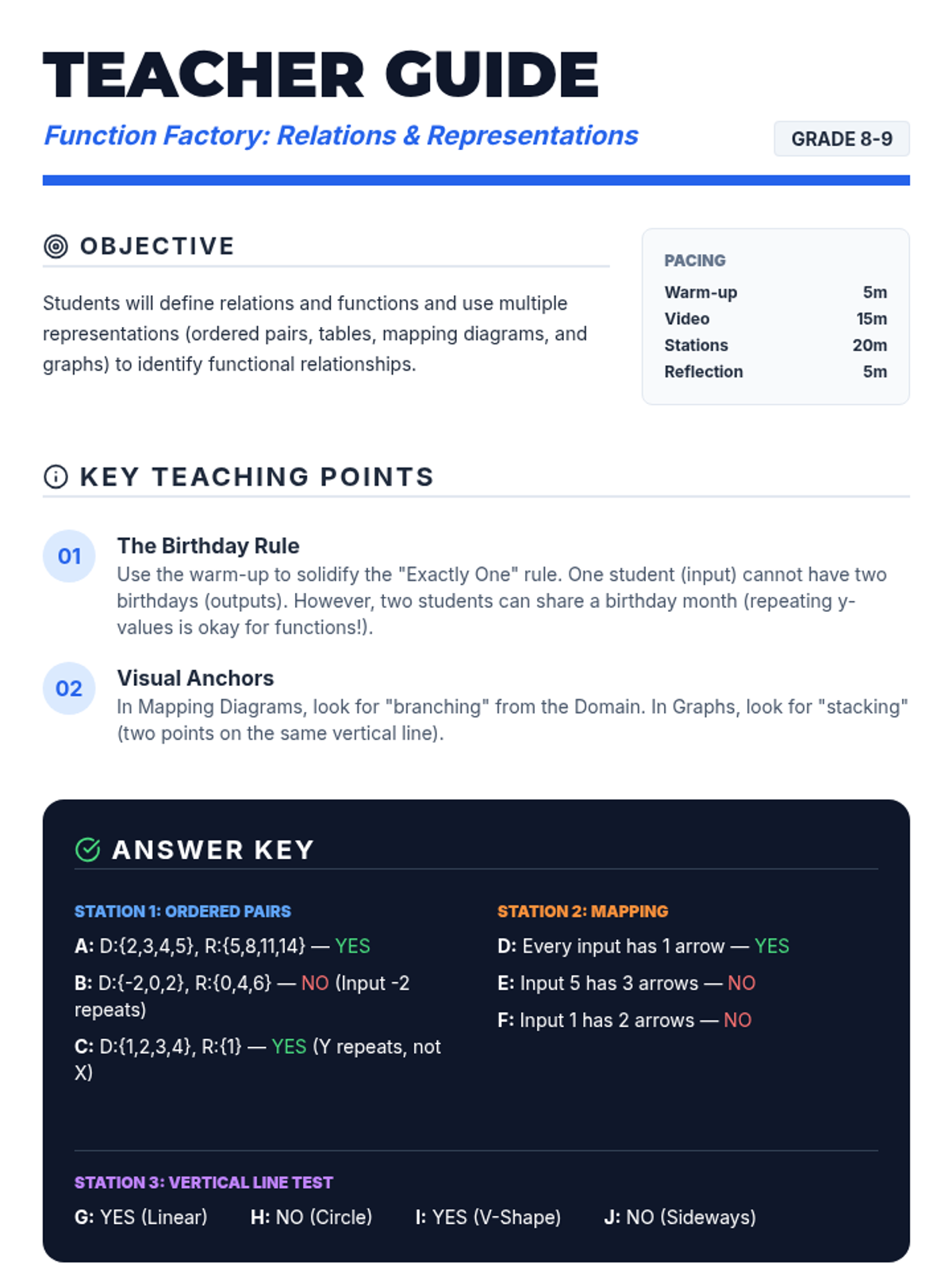 Students will learn to identify functions by translating between ordered pairs, mapping diagrams, tables, and graphs. The lesson features a hands-on station rotation and a graphical vertical line test analysis.