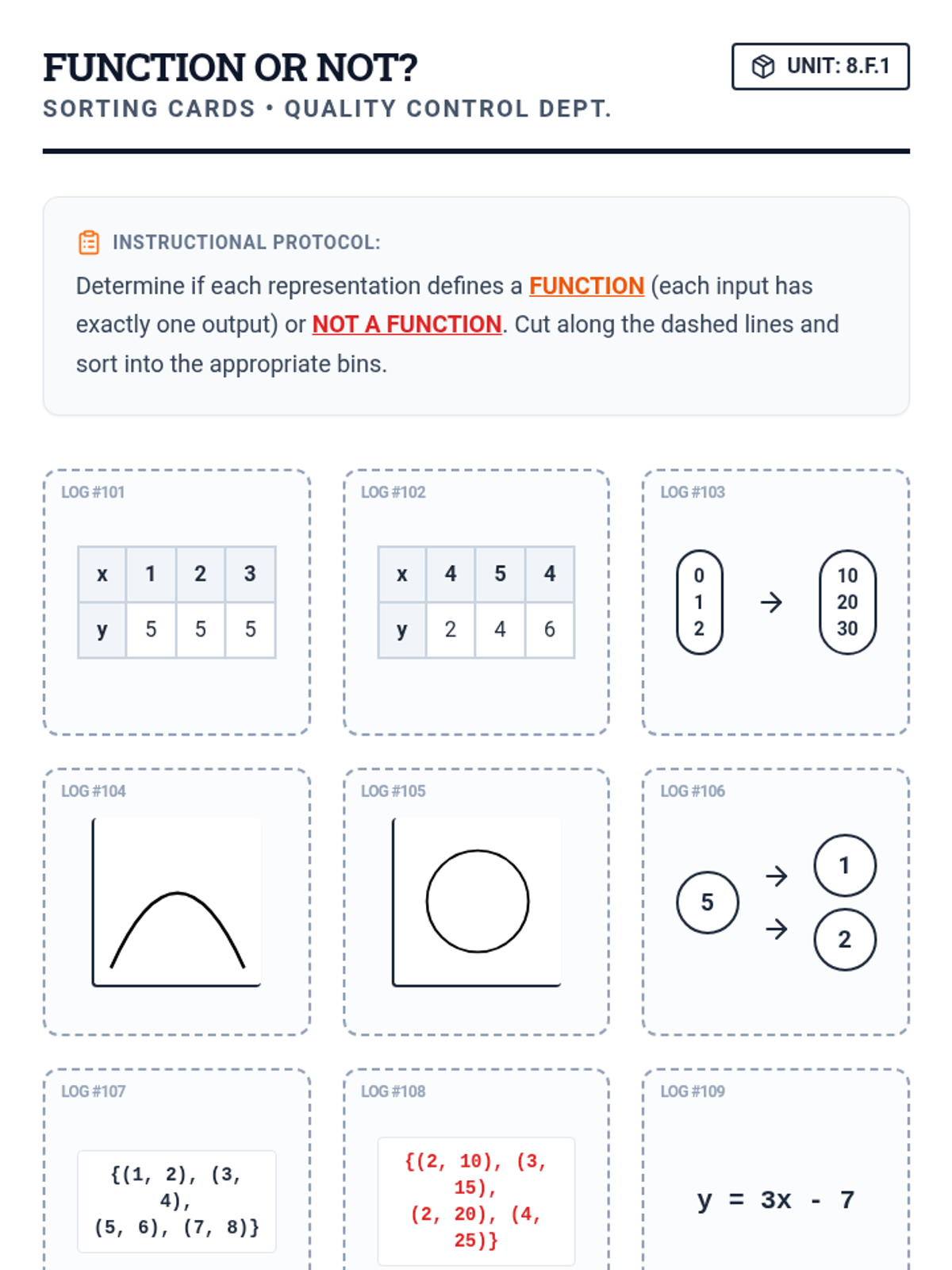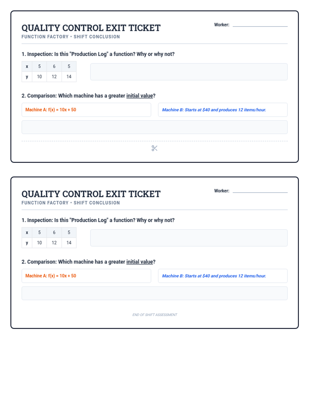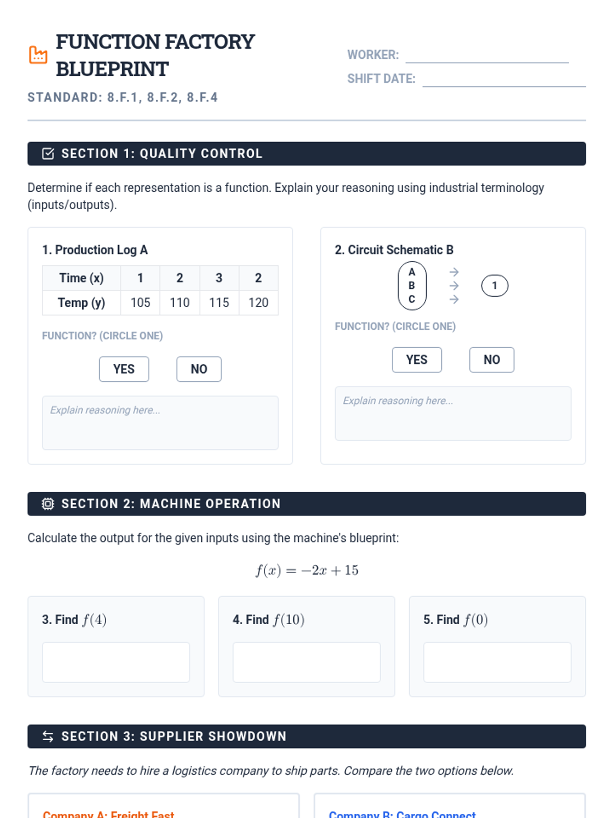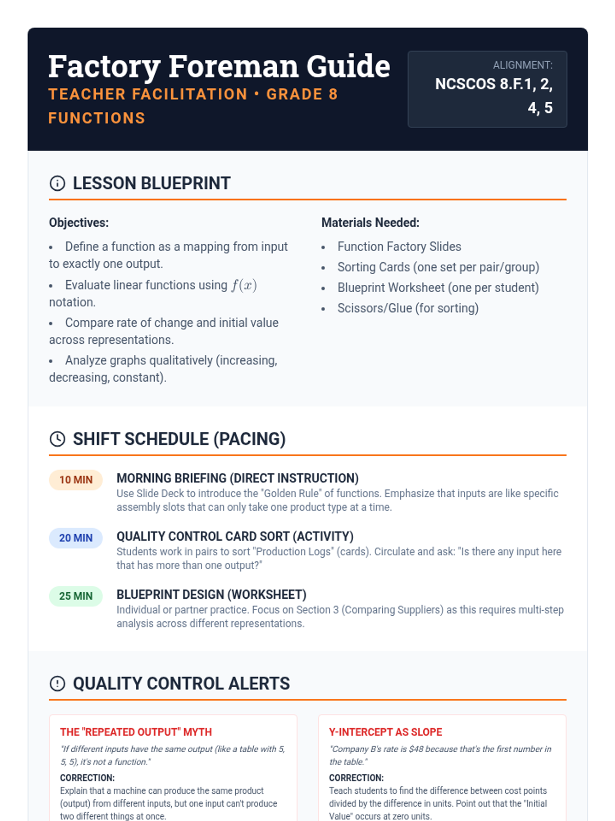 A comprehensive Grade 8 math lesson on functions, focusing on defining, evaluating, and comparing different representations through an industrial 'Function Factory' theme. Students explore the concept of one-to-one mapping, rate of change, and initial value in real-world contexts.