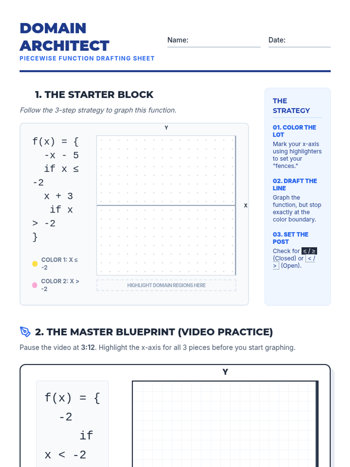 A remedial high school math lesson focused on visual strategies for graphing piecewise functions. Students use a 'Domain First' approach with highlighters to define valid regions before drawing function segments.
