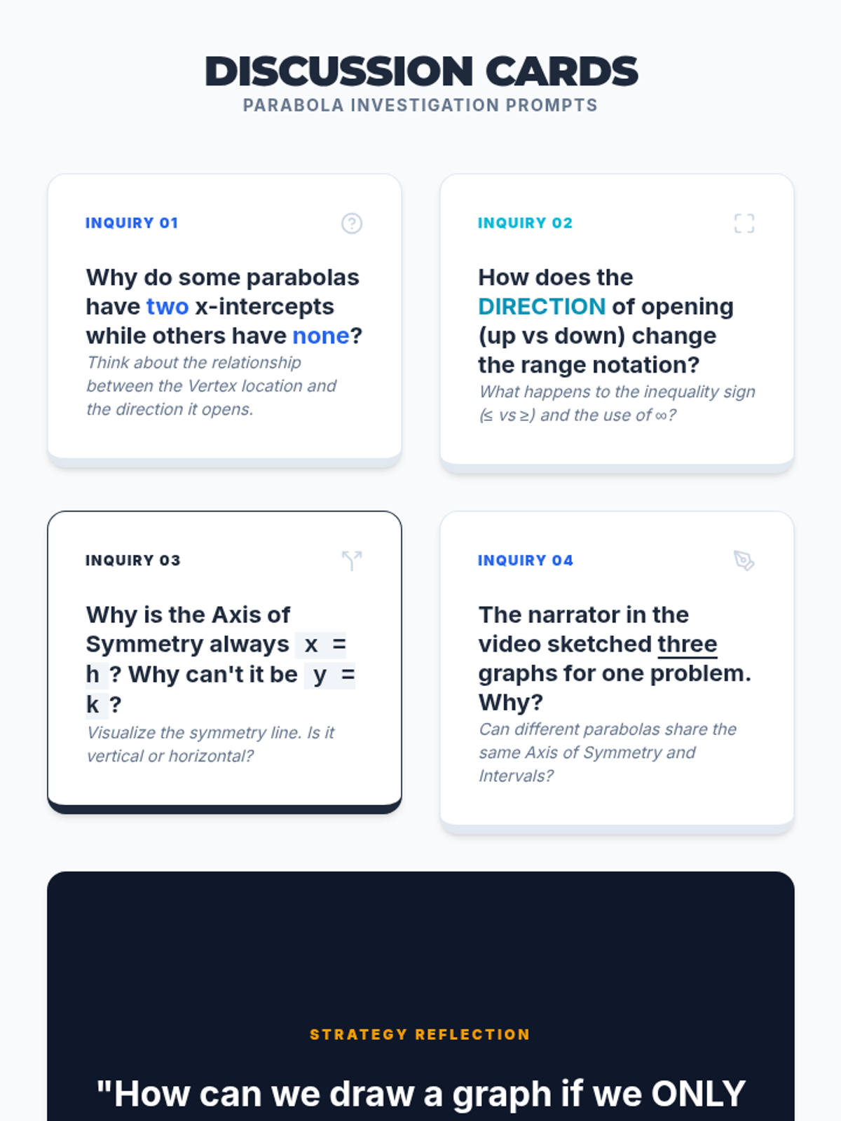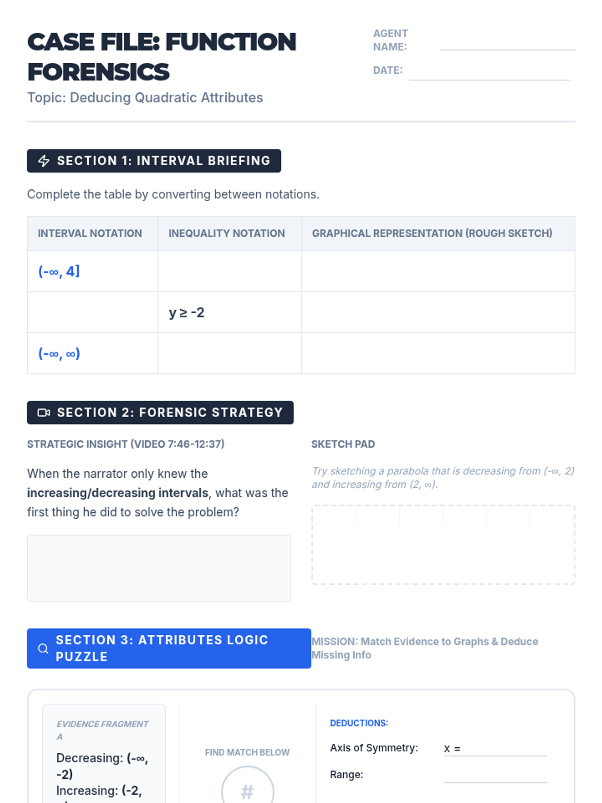 A 10th-grade Algebra 2 review lesson focused on deducing quadratic function properties (domain, range, symmetry, vertex) from partial information using logic-based puzzles and visual sketching strategies.
