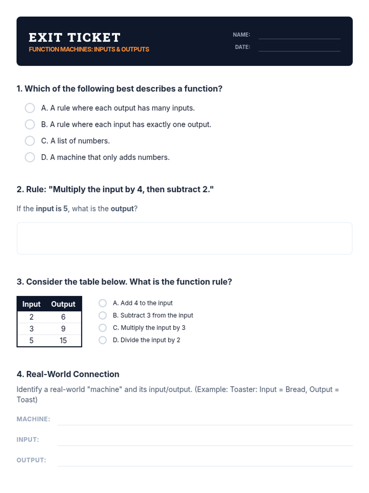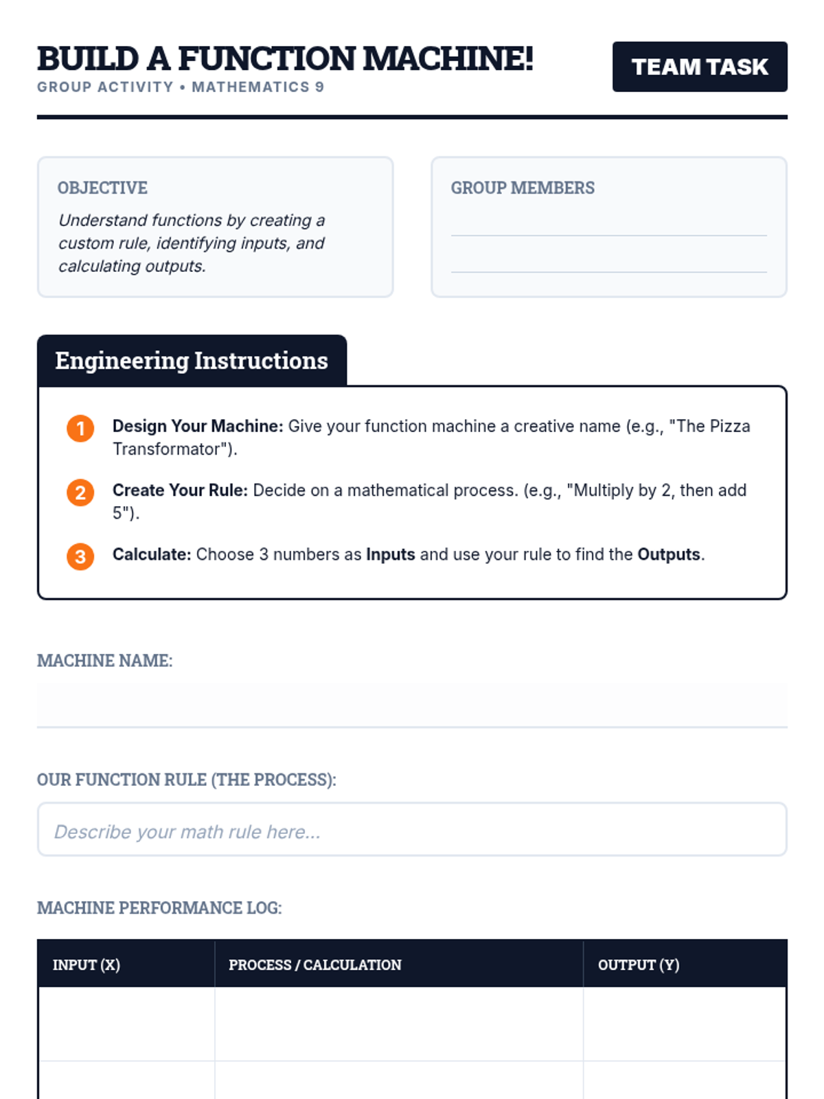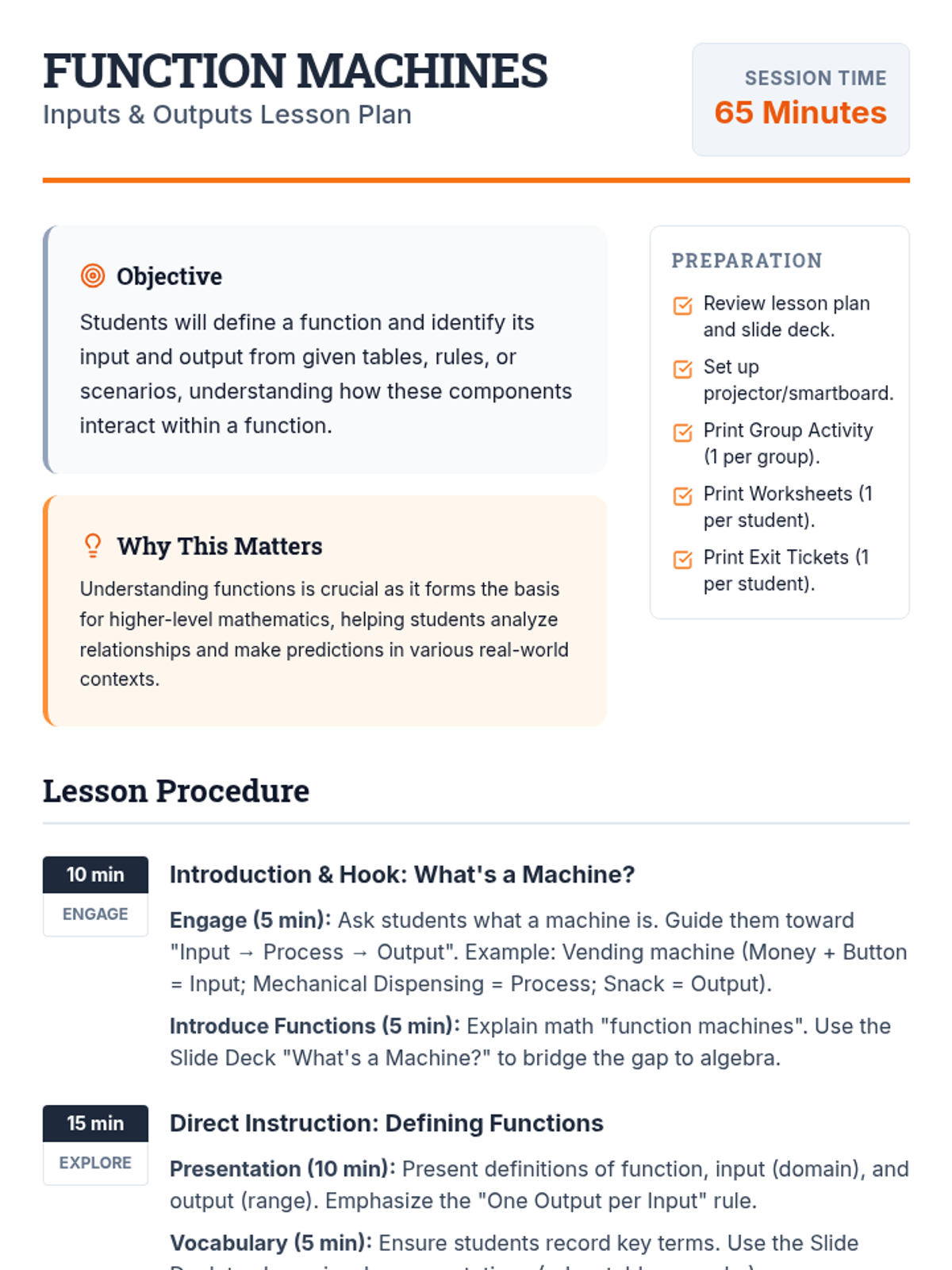 A 65-minute introductory lesson for 9th graders on the concept of functions, using the 'function machine' metaphor to define inputs, outputs, domain, and range.