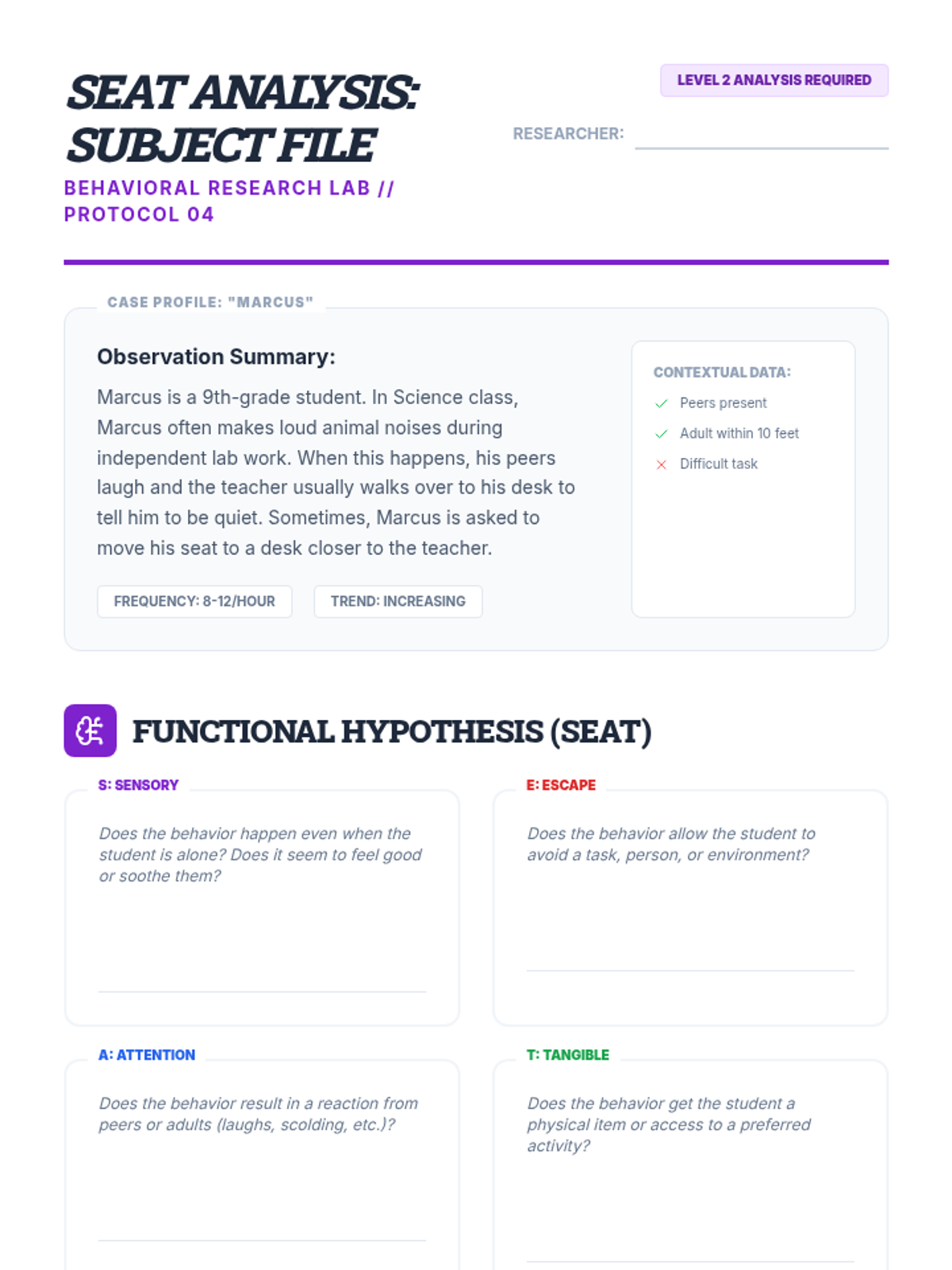 Students explore the four functions of behavior (SEAT) and use their analyzed data to hypothesize the purpose behind specific actions.