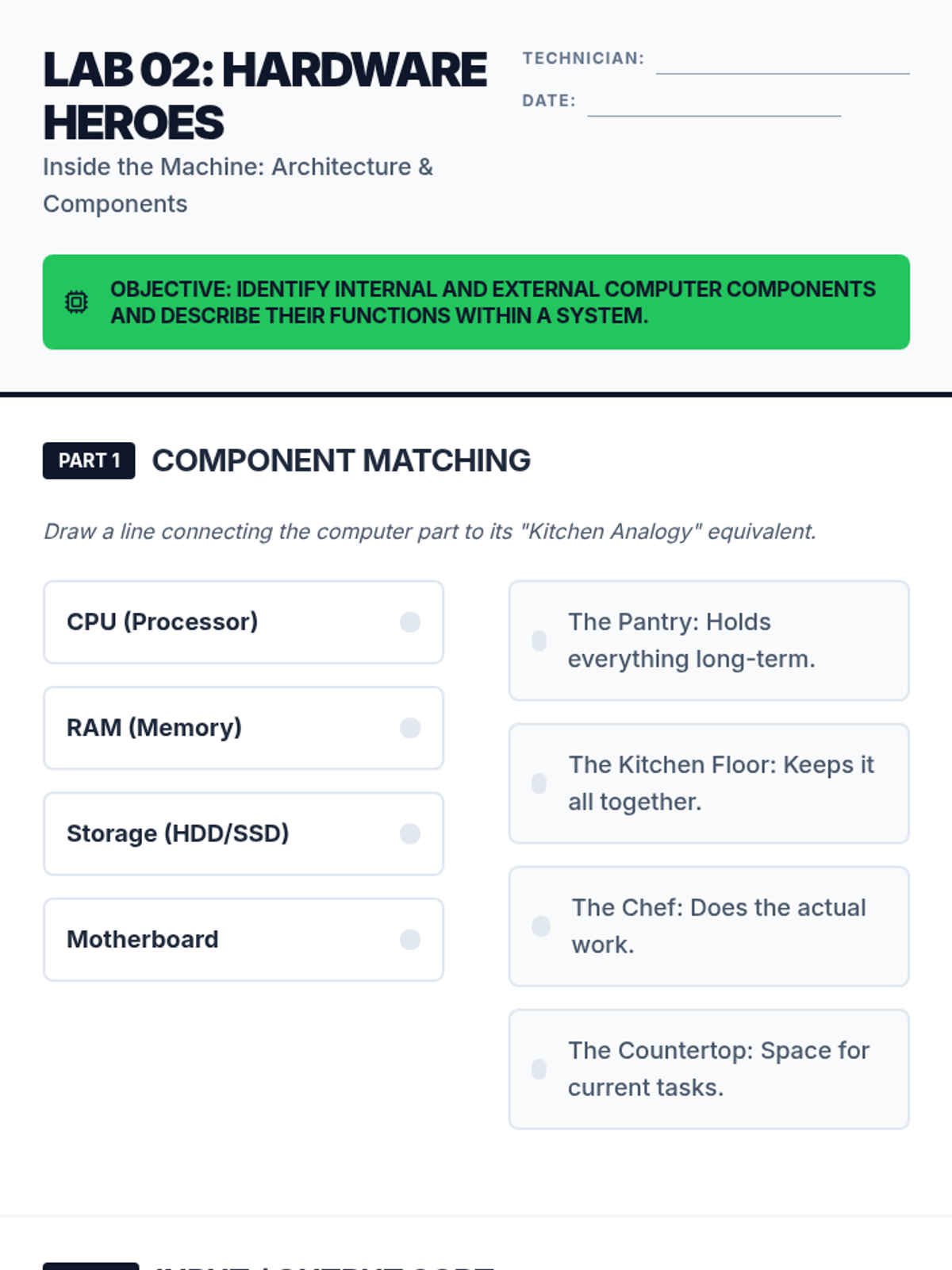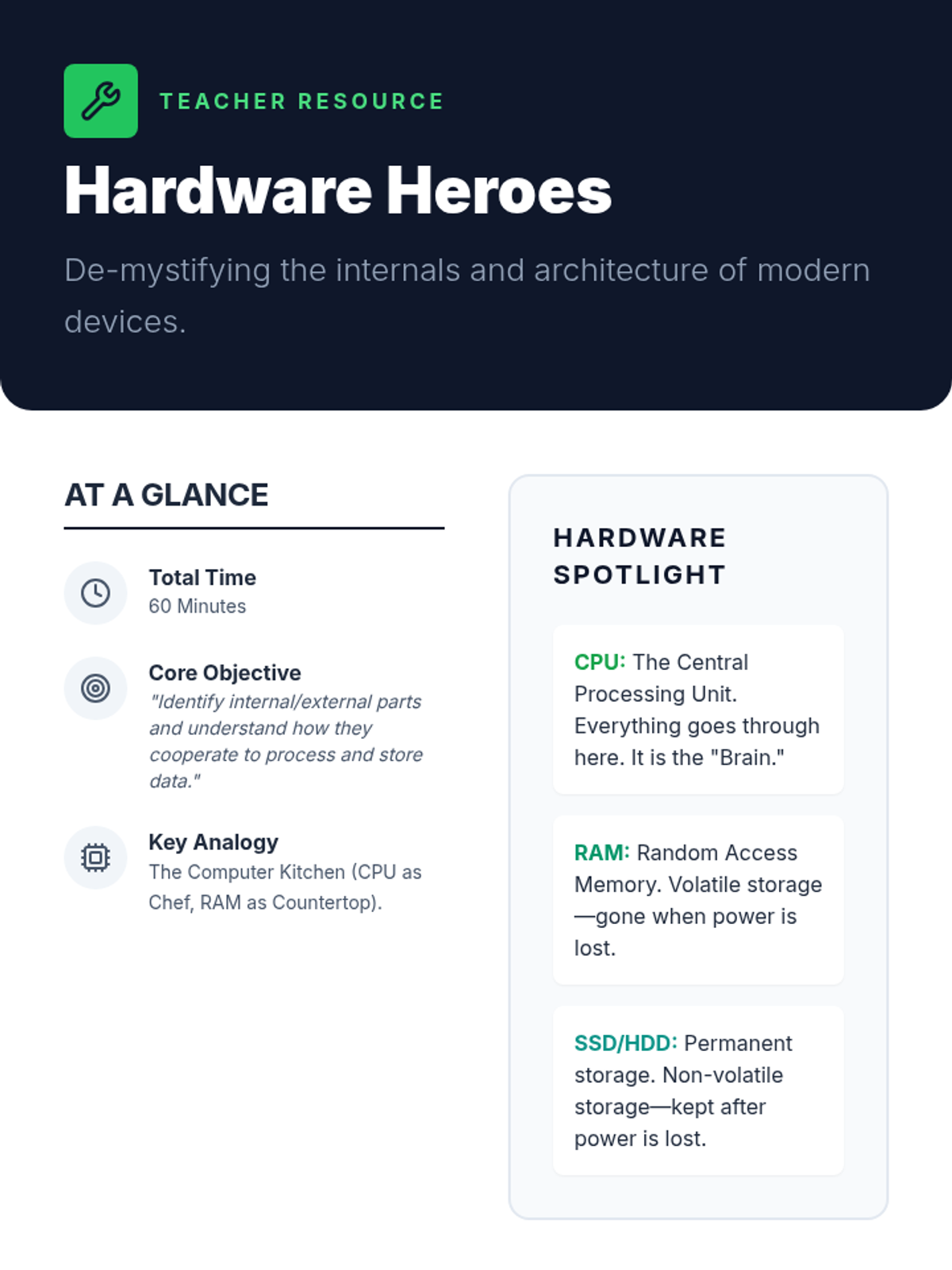 Explore the inner workings of a computer. Students will identify key internal components like the CPU, RAM, and storage, and understand how they work together to process data.