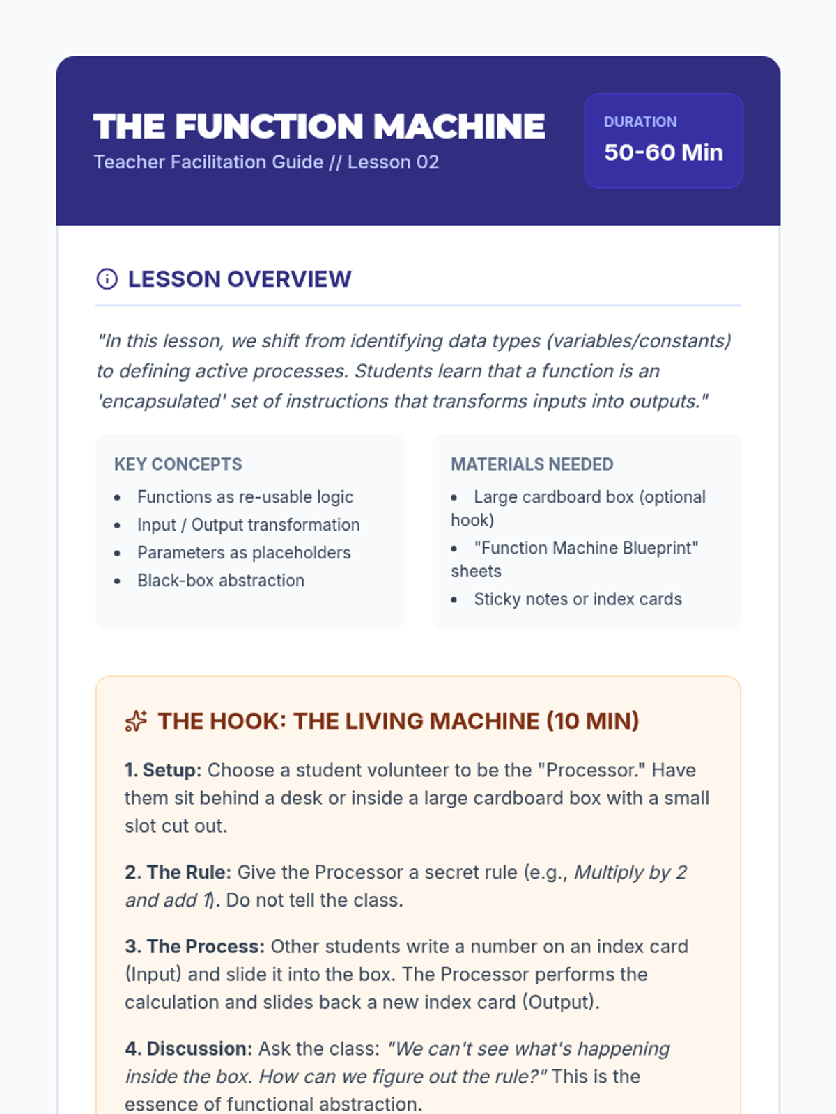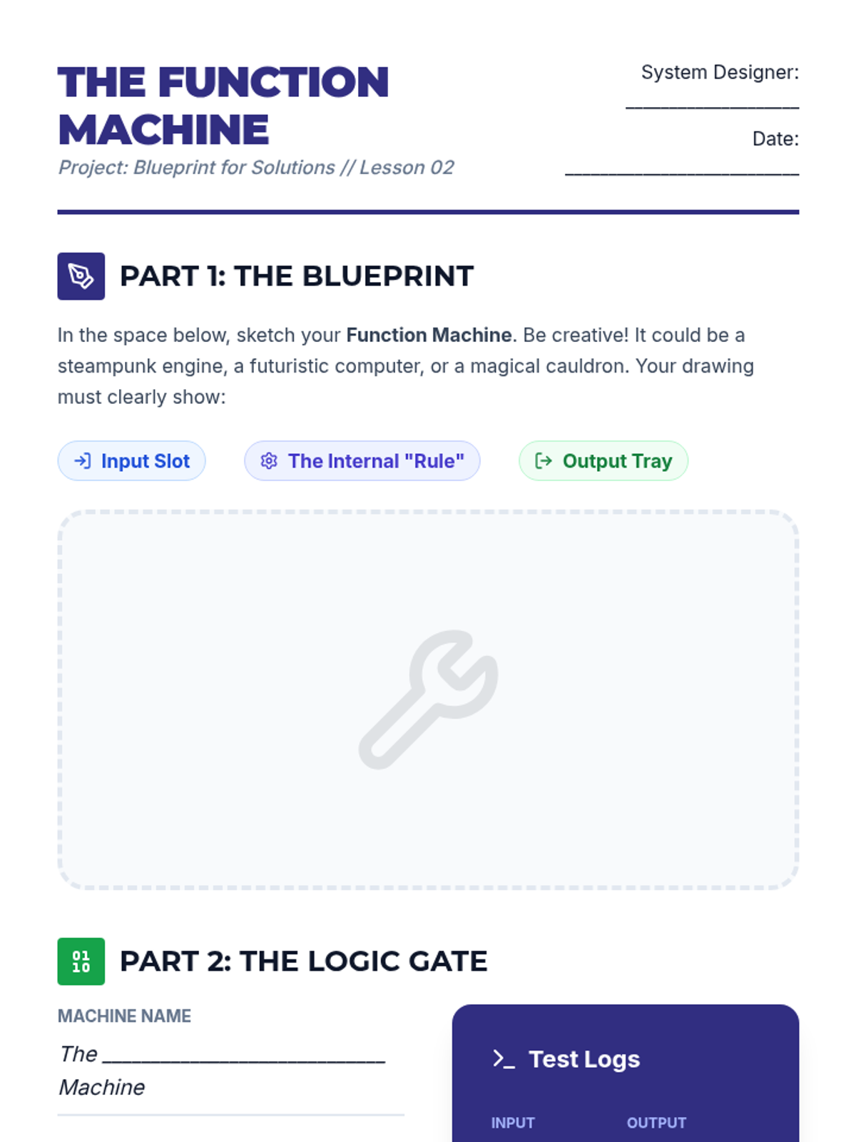 Students learn the concept of a 'function' as a machine that takes input. They design physical machines (drawings or cardboard) that accept an input, apply a rule, and output a result.