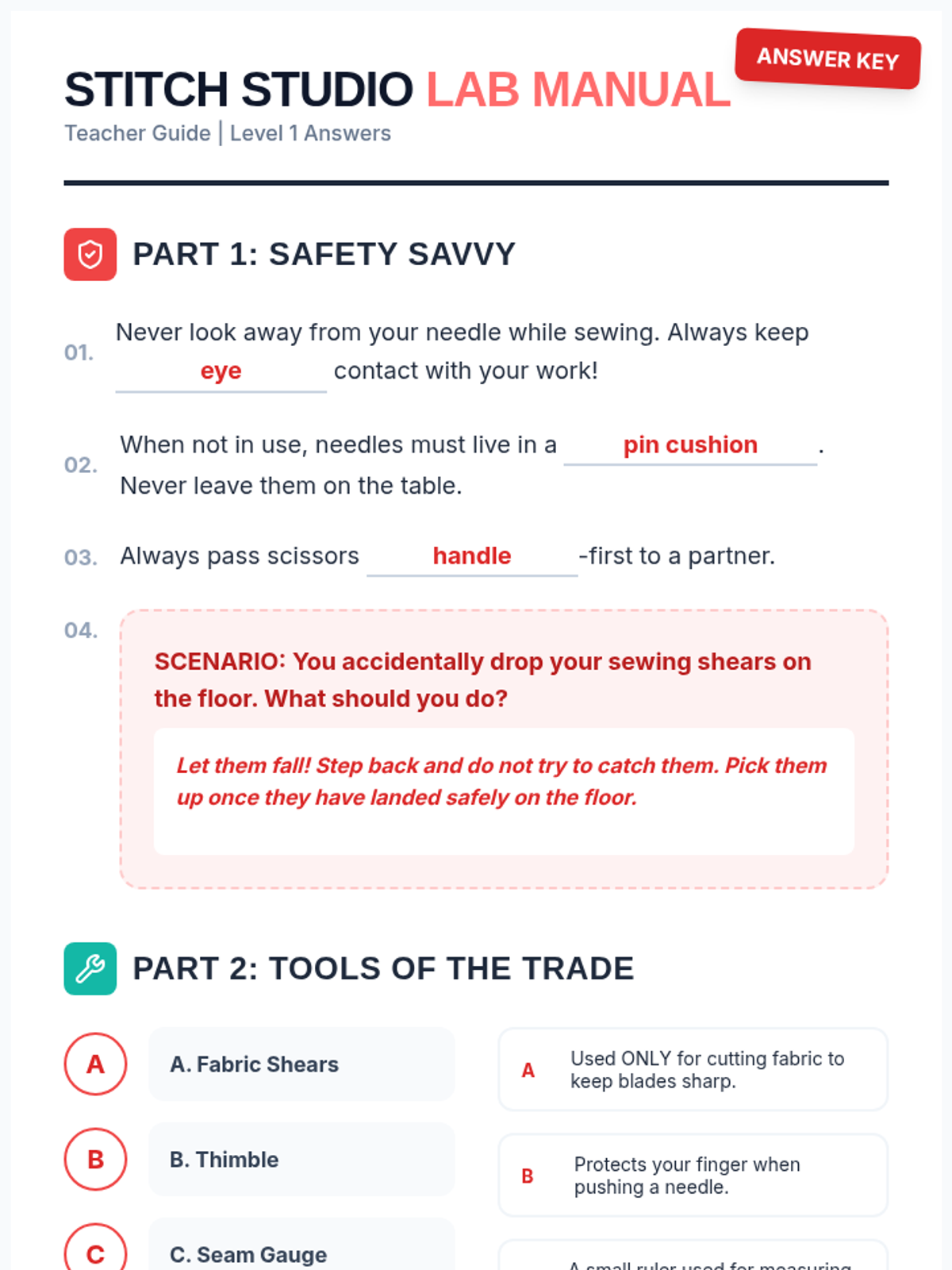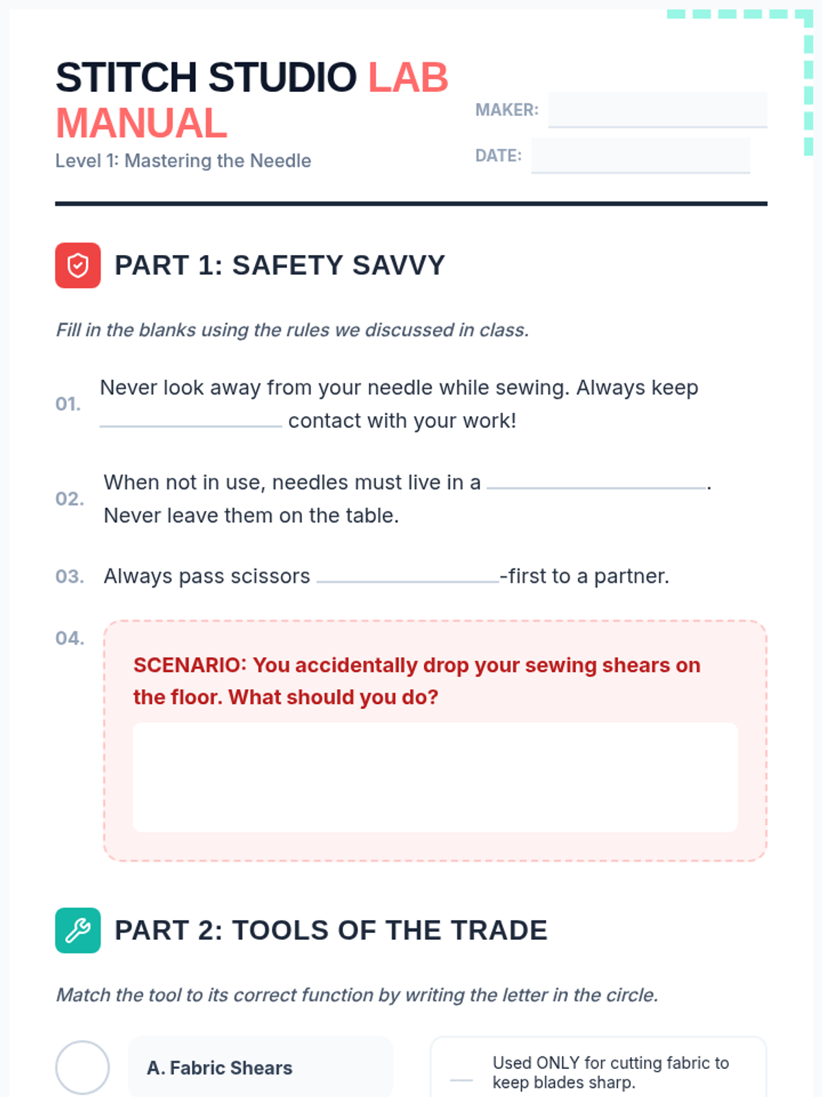 A comprehensive introduction to hand sewing for 6th graders, covering essential safety rules, tool usage, and five fundamental hand stitches: running, basting, backstitch, blanket, and tailor's stitch.