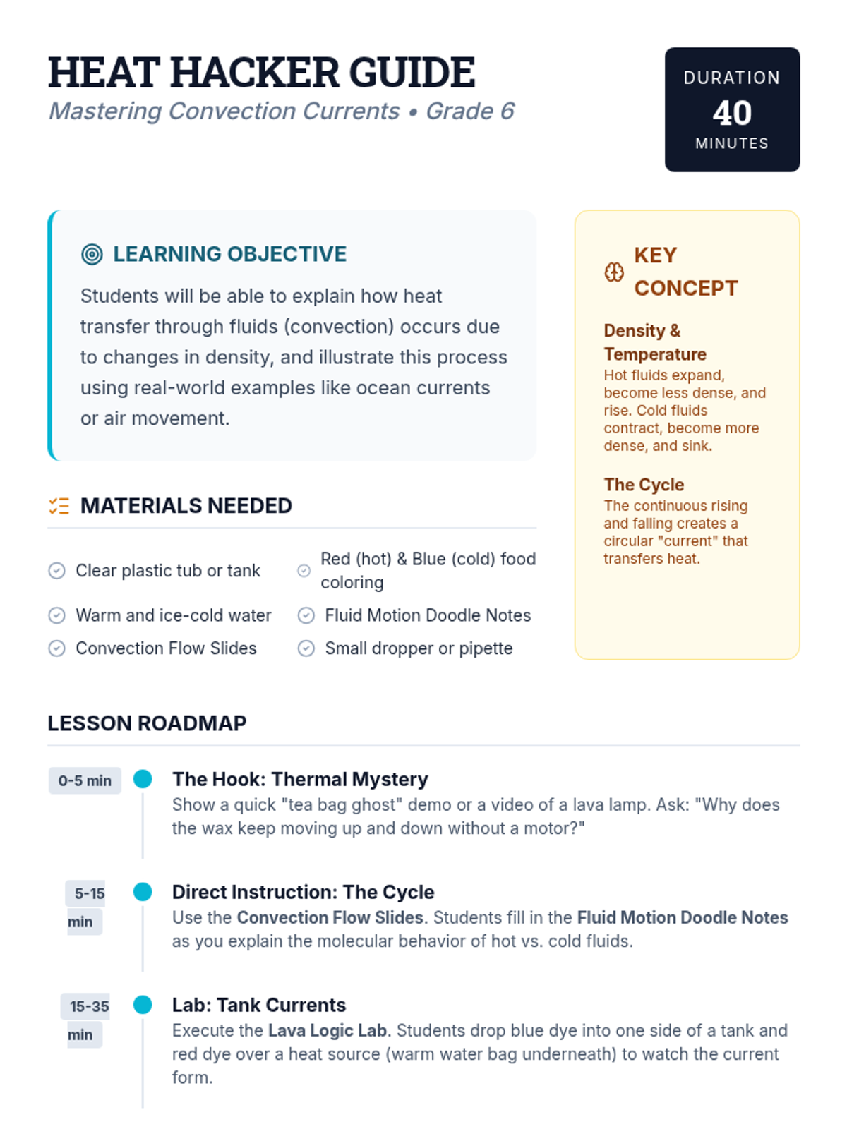 A 40-minute introductory lesson on convection currents for 6th grade, featuring a hands-on activity and creative doodle notes. Students will explore how heat moves through fluids via density changes.
