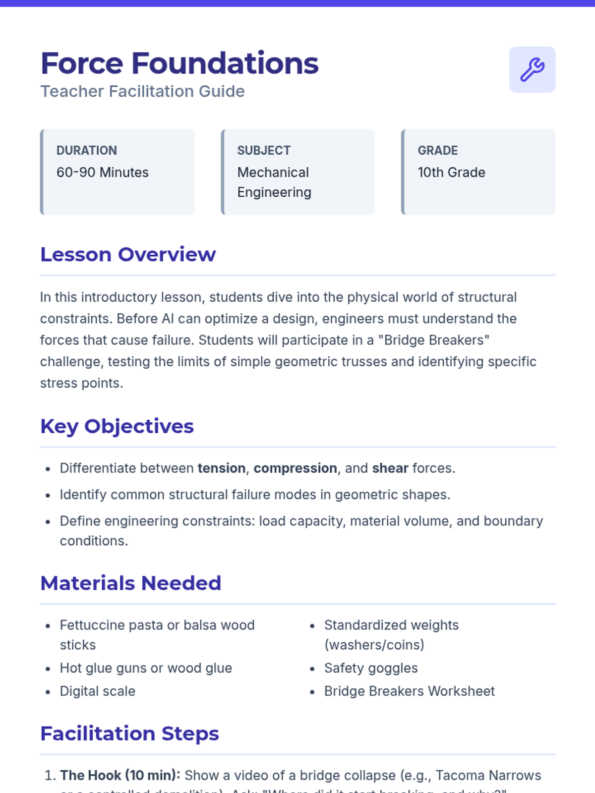 Students explore core mechanical forces—tension, compression, and shear—through a manual design challenge to understand the limitations of traditional geometric structural solutions.