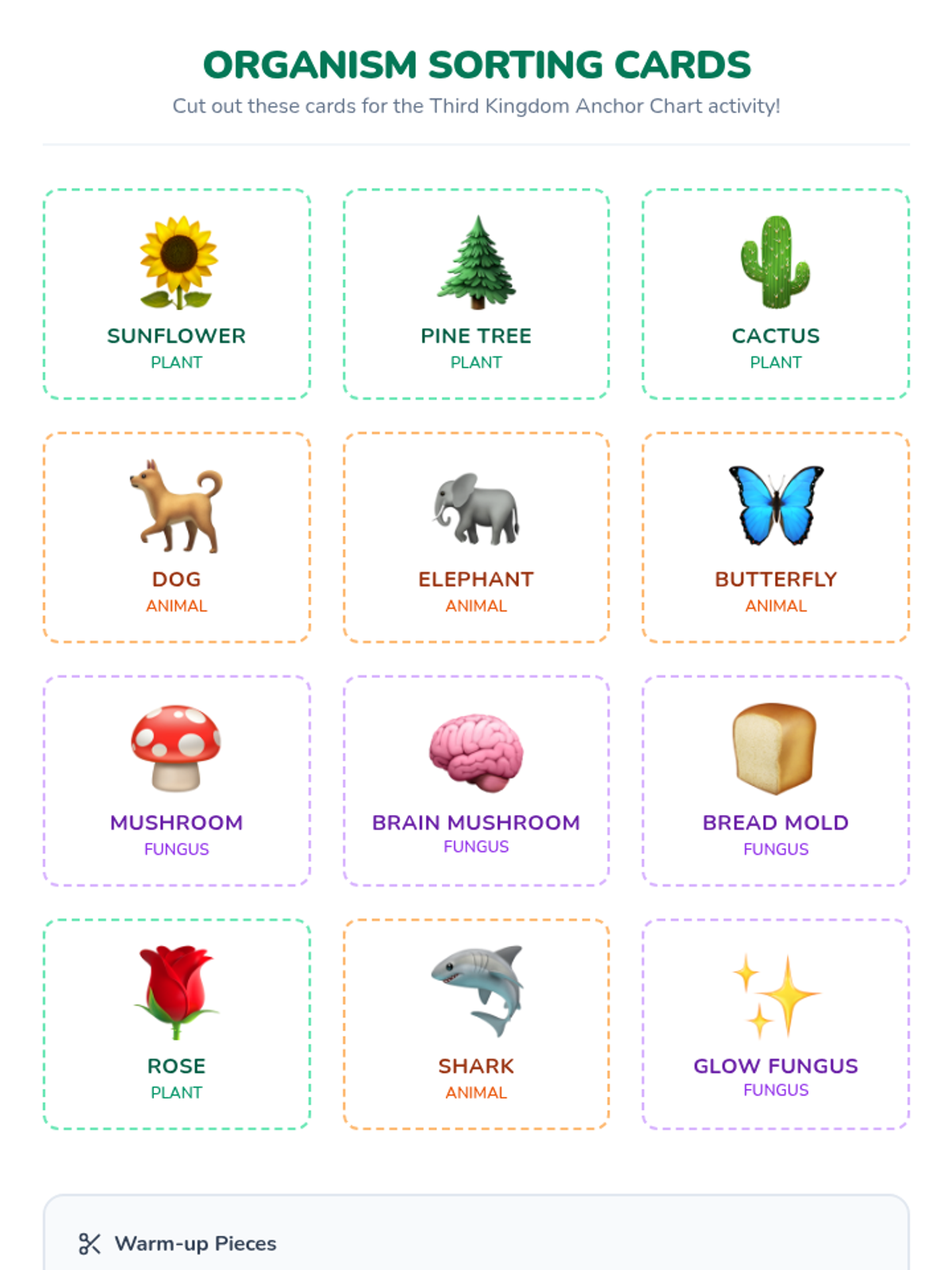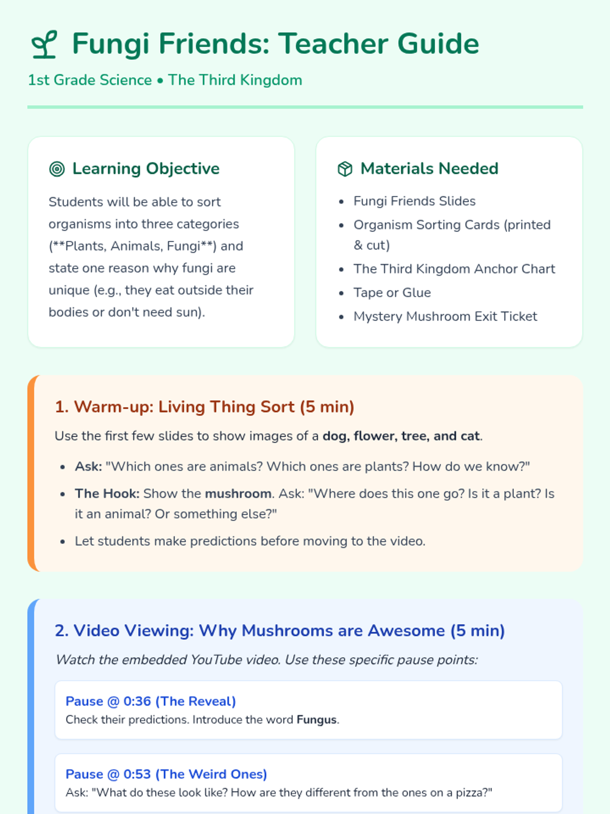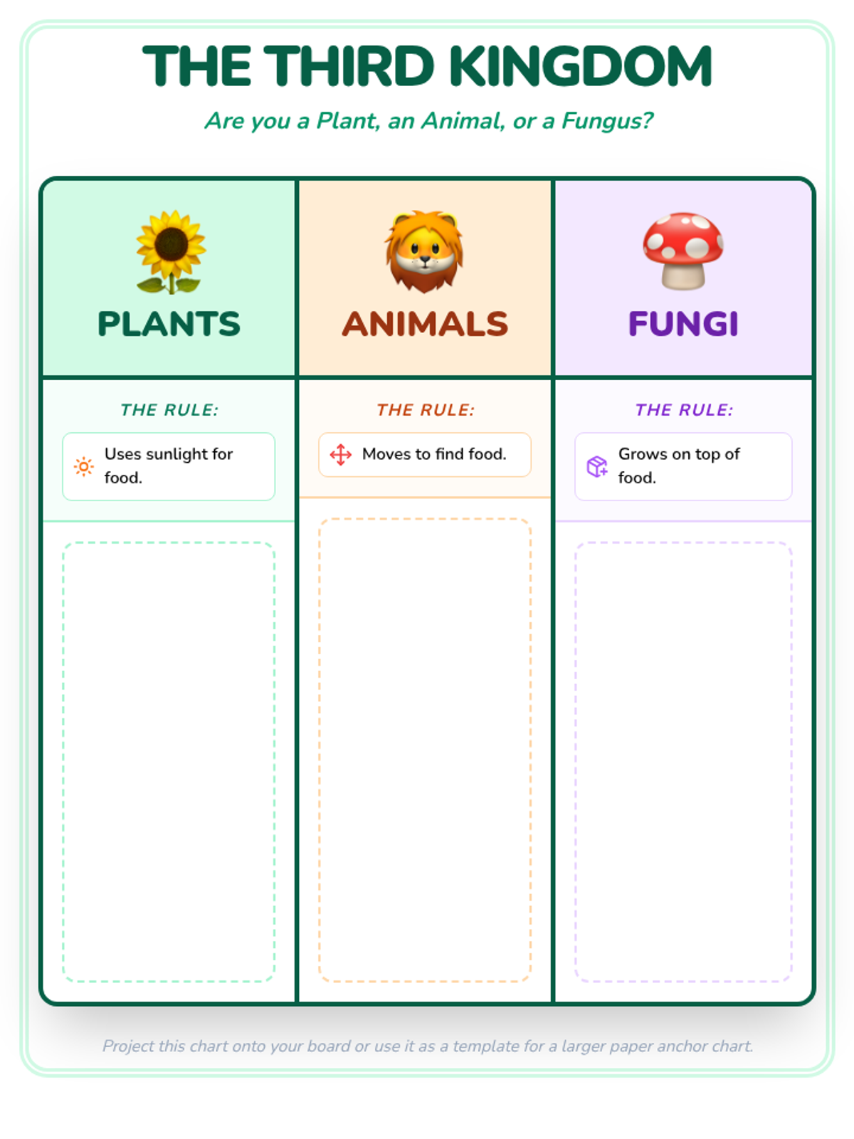 A 1st Grade science lesson where students discover the third kingdom of living things: Fungi. Students learn to distinguish fungi from plants and animals through a video, an interactive anchor chart activity, and group discussion.