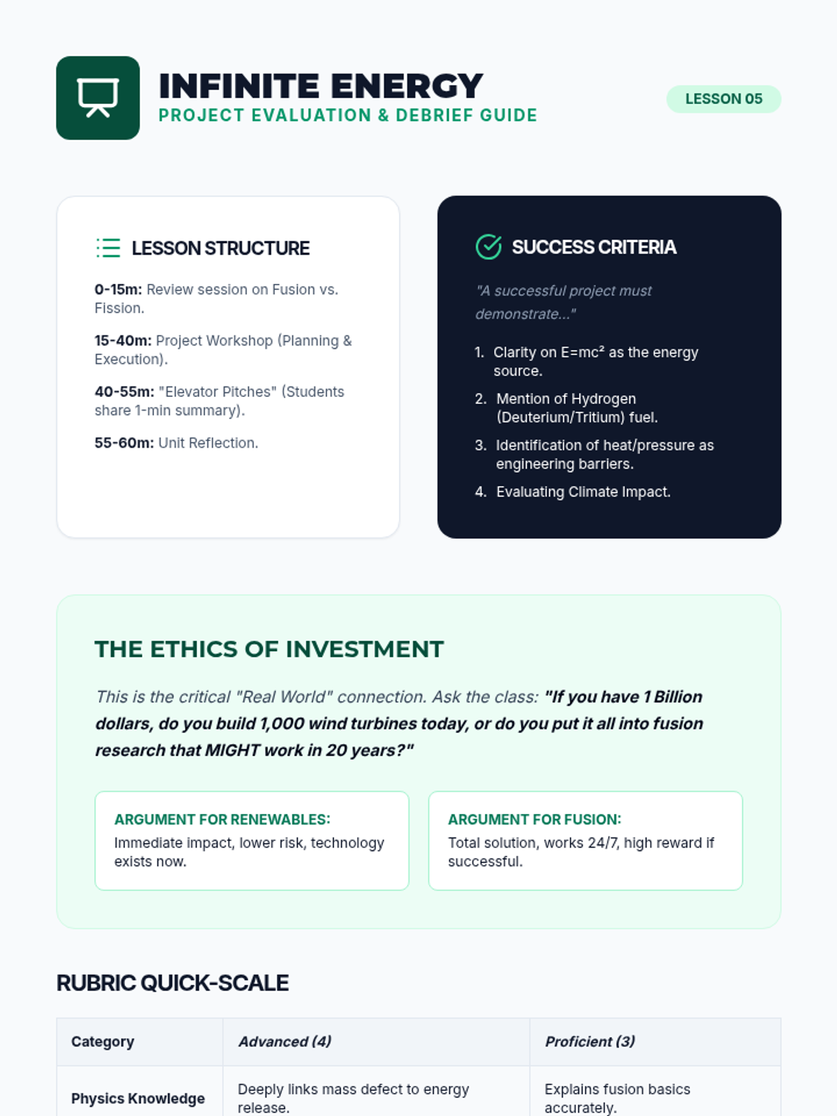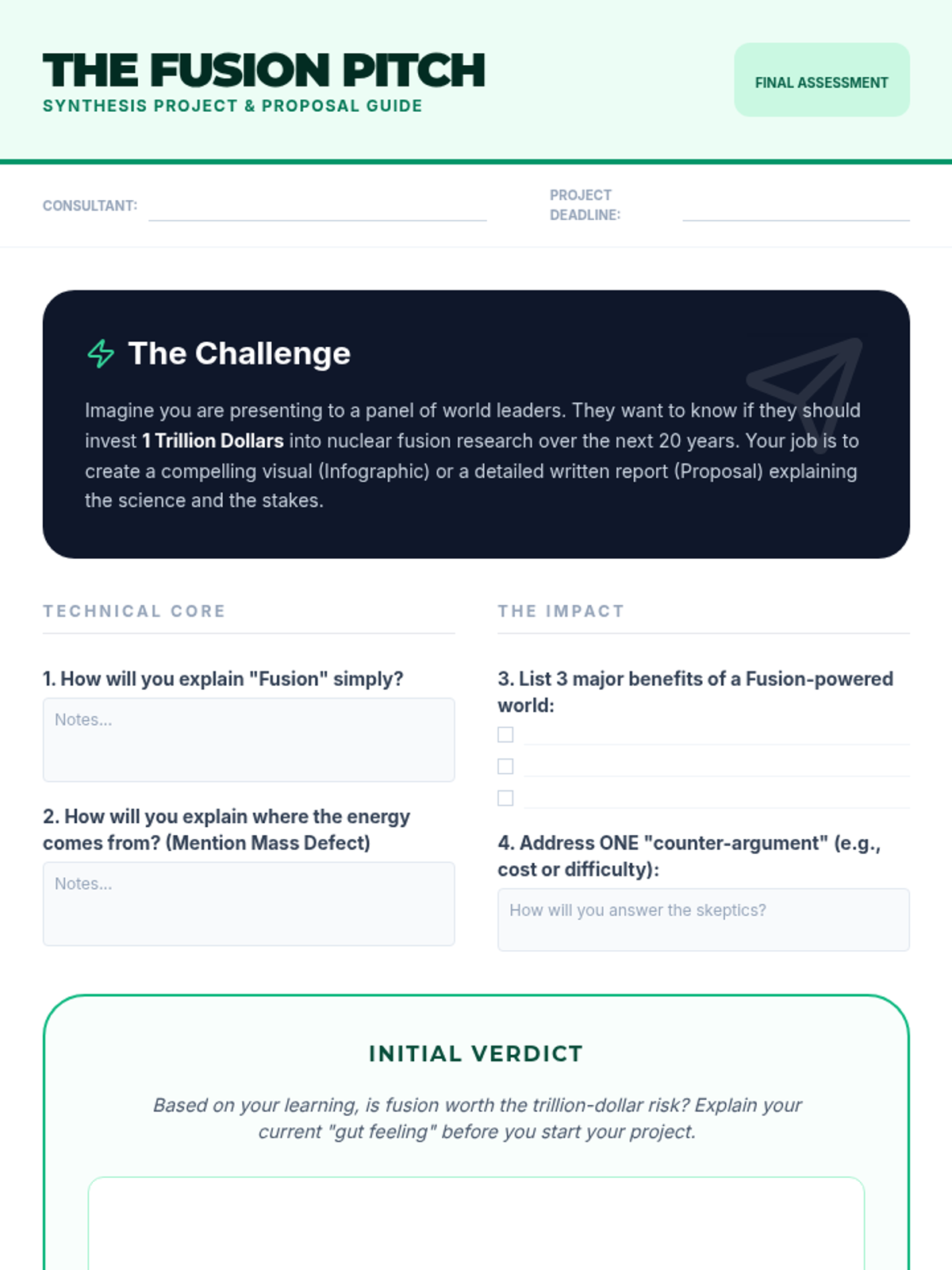 Students evaluate fusion as a future energy source, synthesizing its benefits and challenges in a final project proposal.