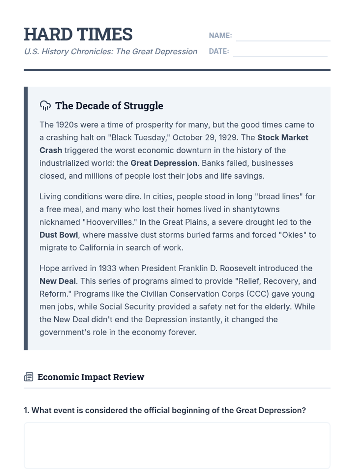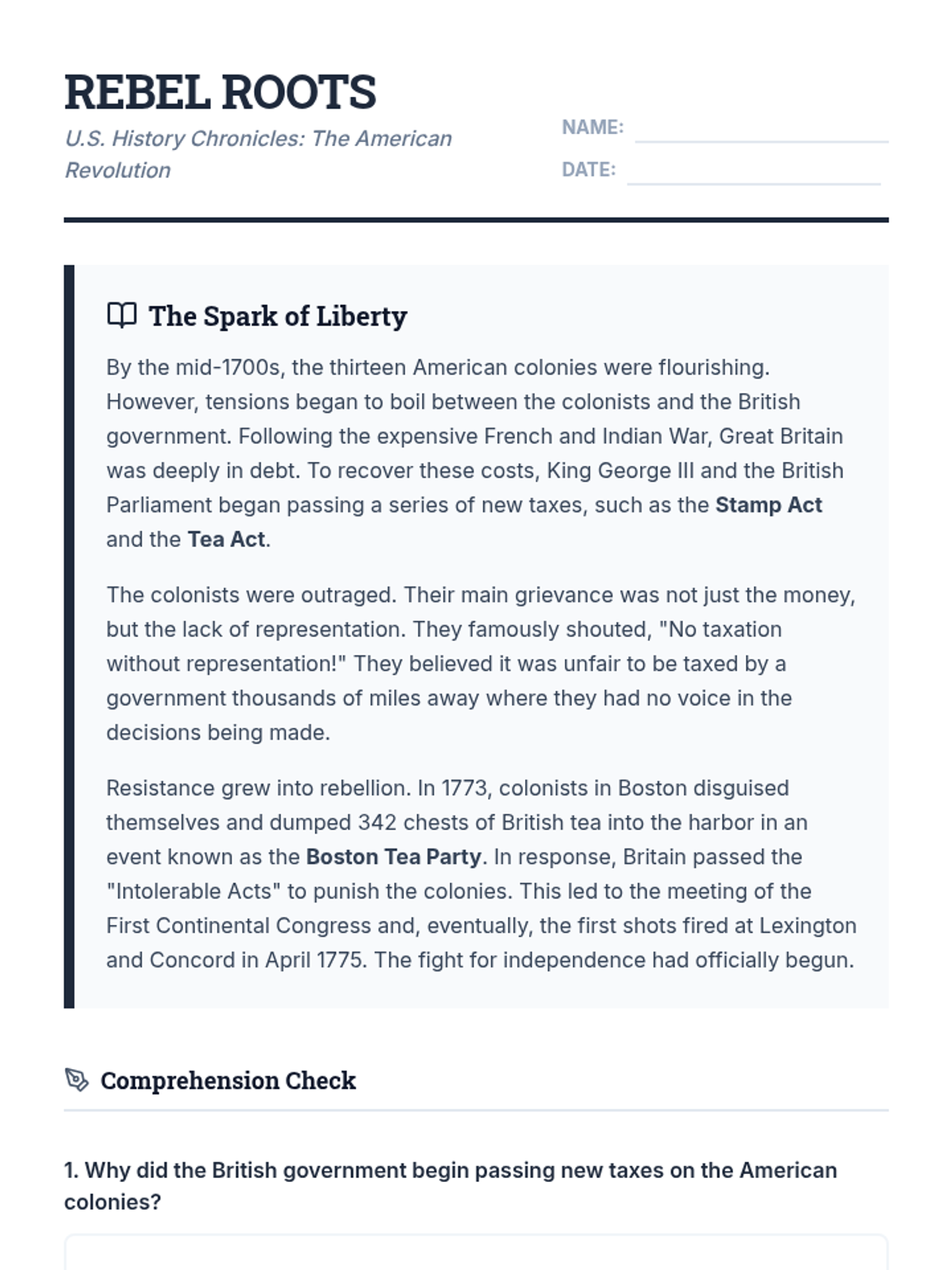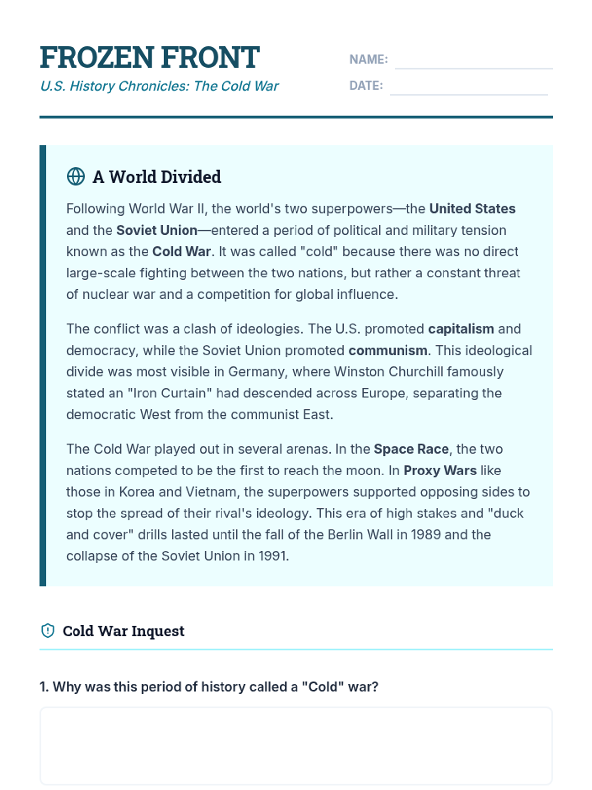 Exploration of key moments in U.S. History through focused reading comprehension passages covering the American Revolution, Westward Expansion, the Great Depression, and the Cold War.