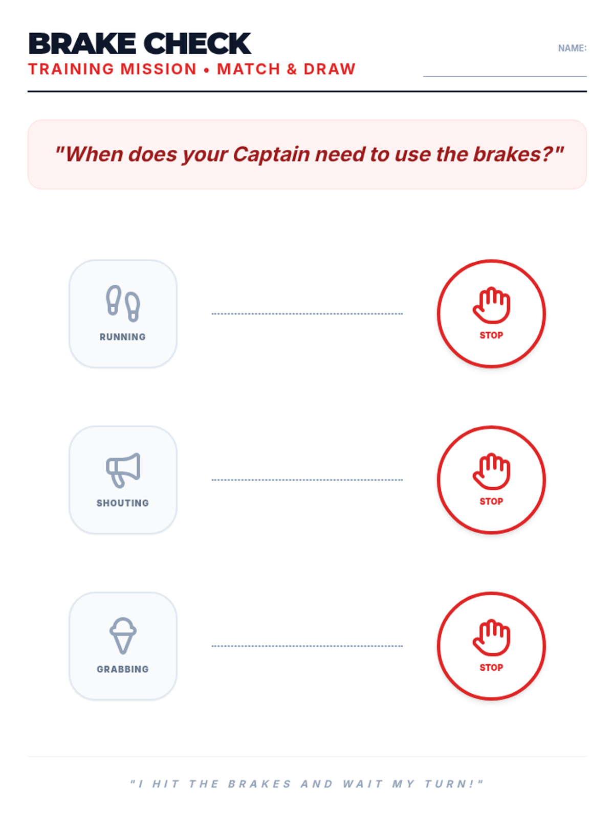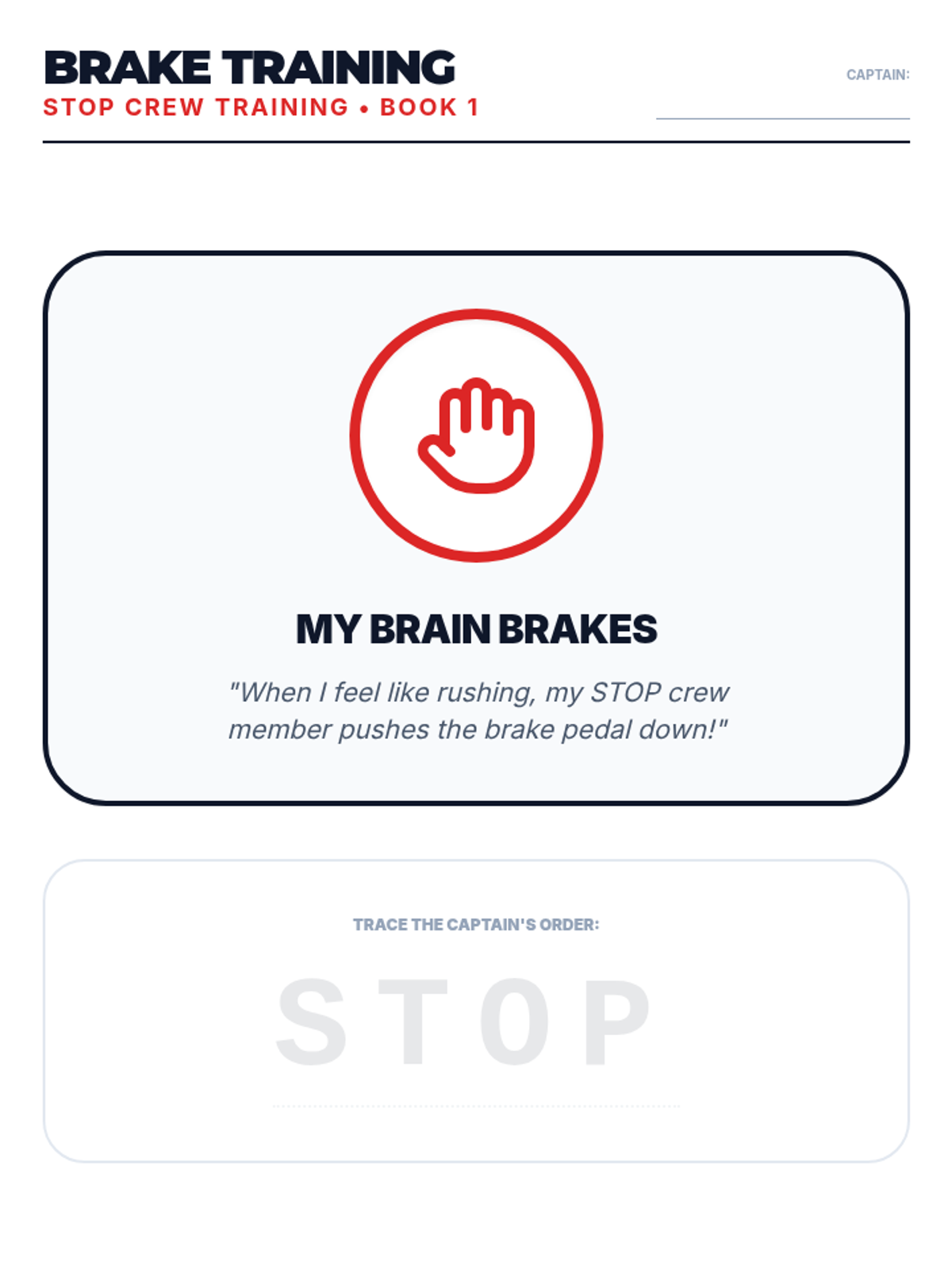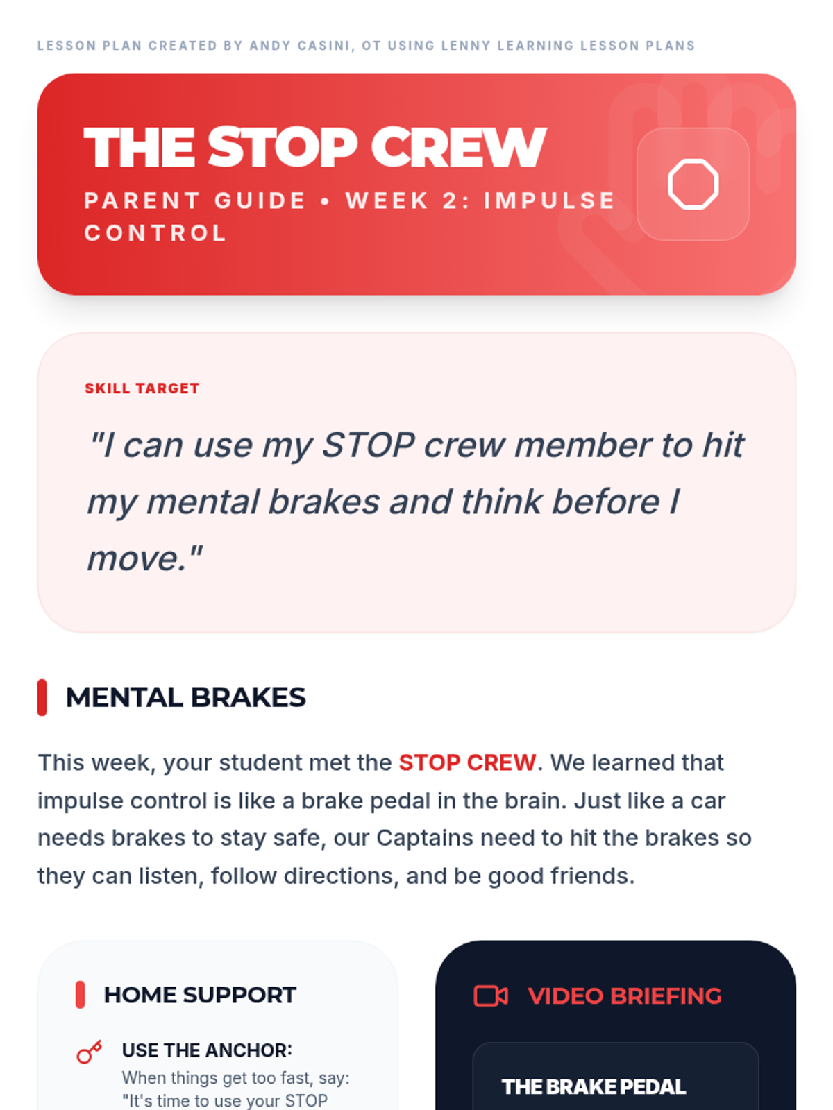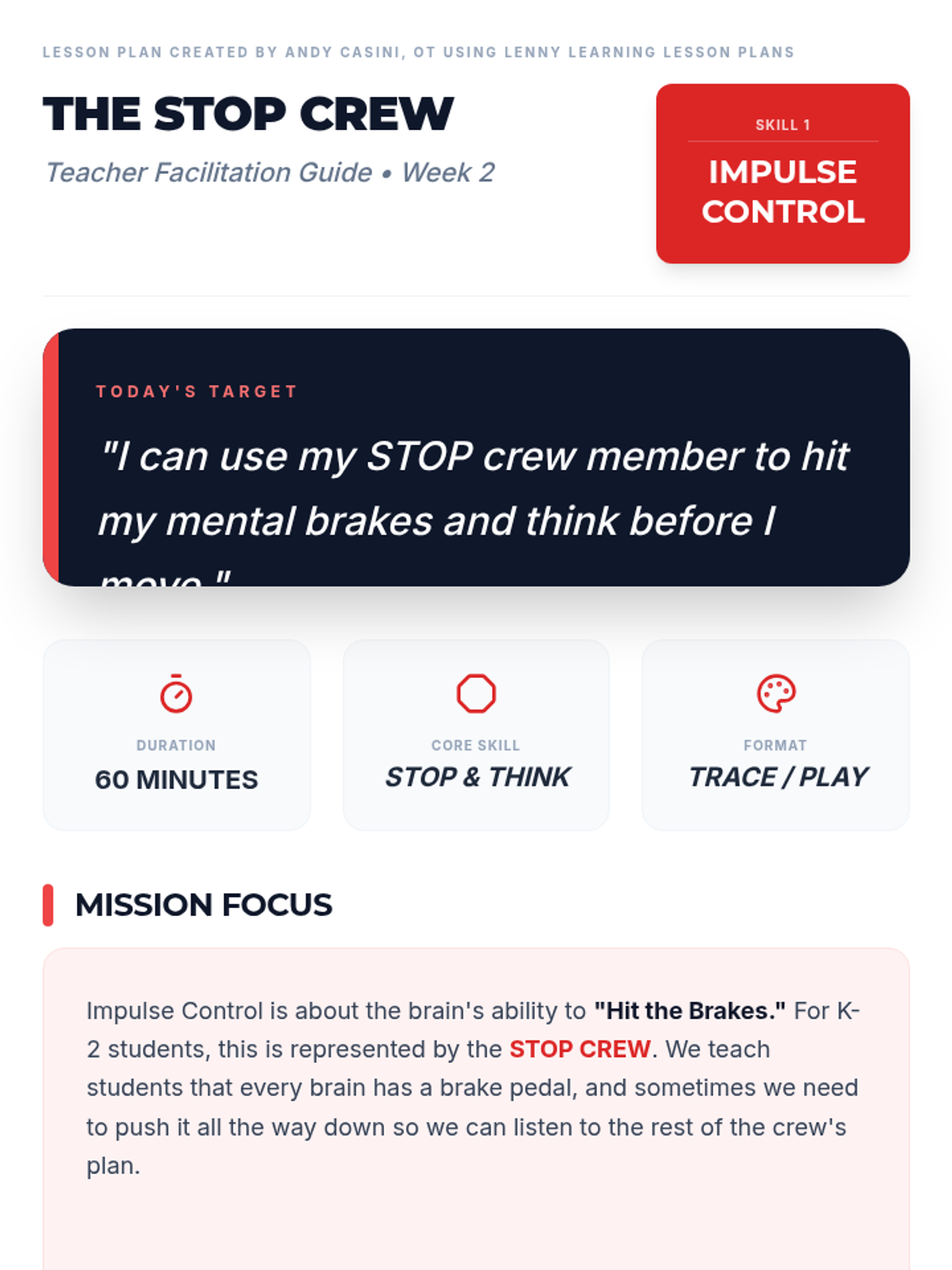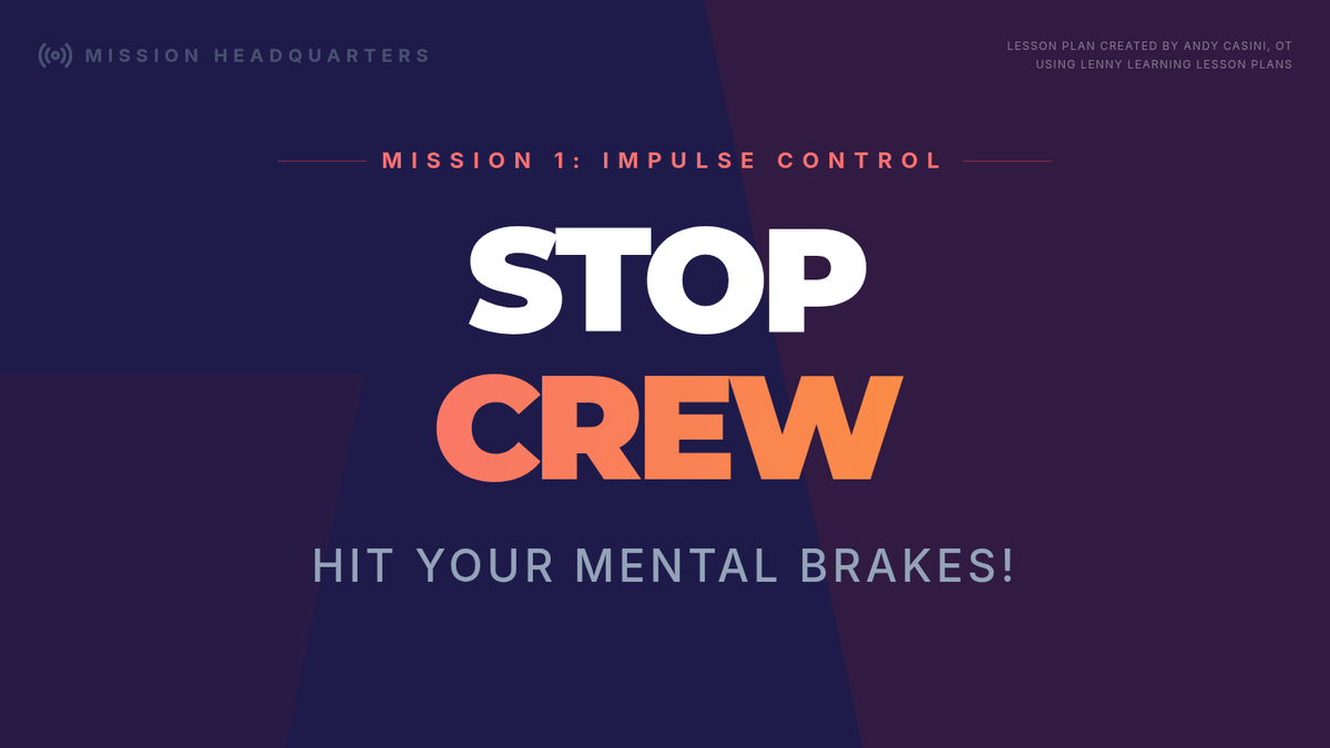 A 60-minute lesson teaching K-2 students Impulse Control using the 'STOP Crew' metaphor. Students learn to use their 'mental brakes' through physical freeze games and a coloring activity.