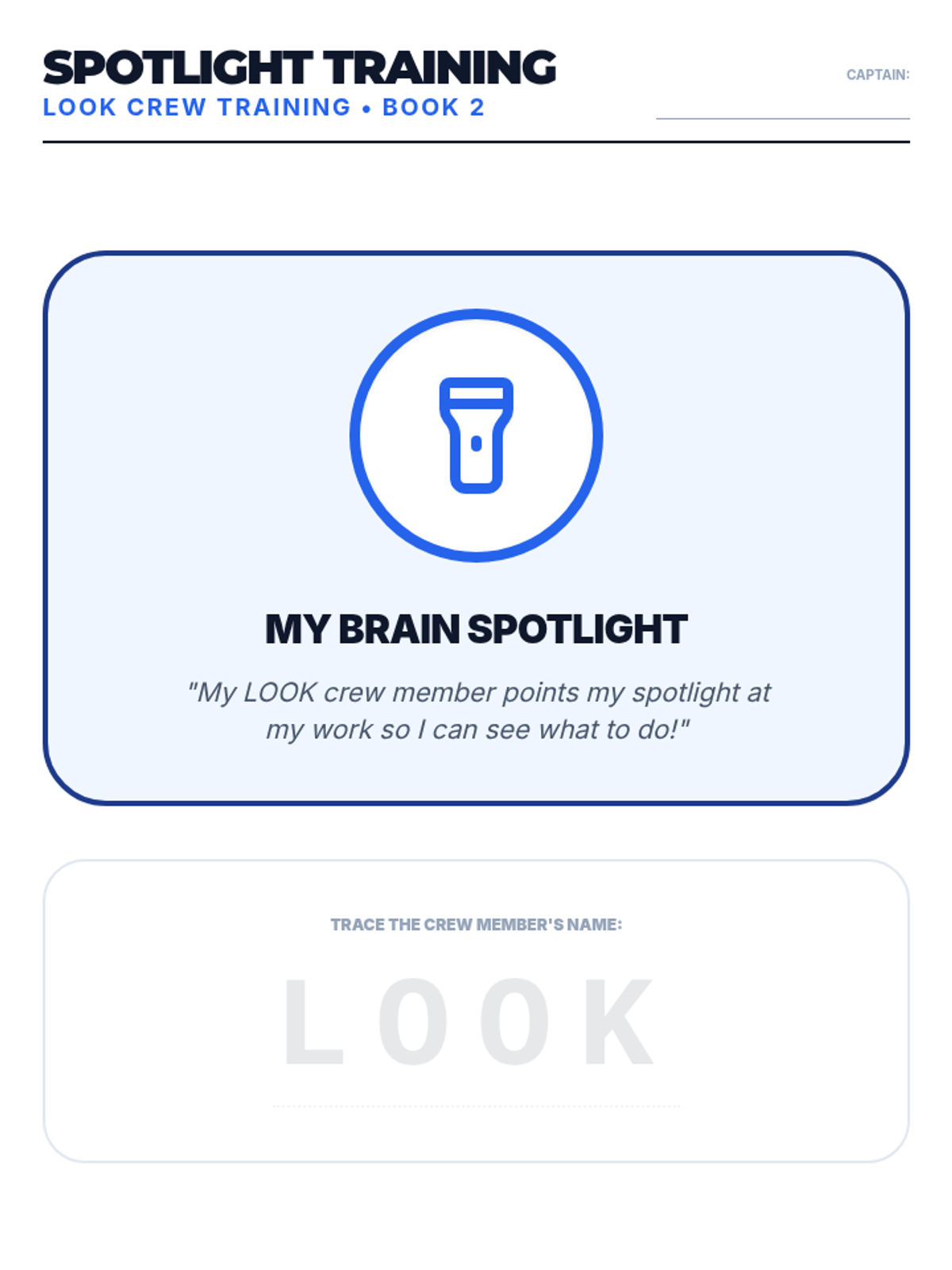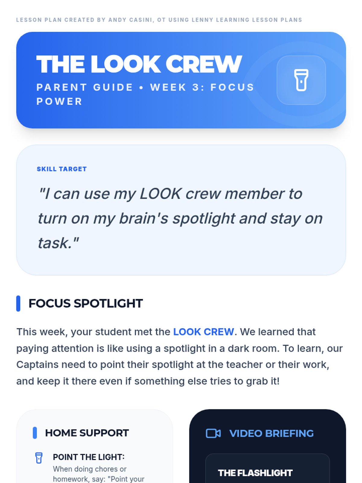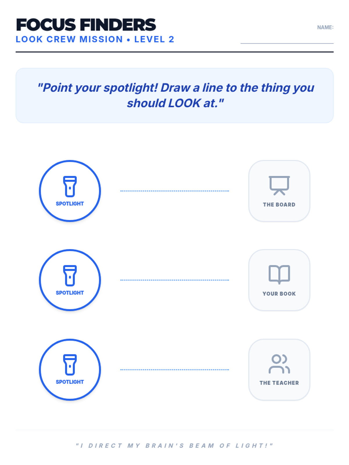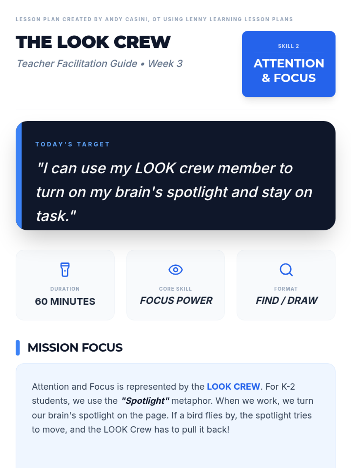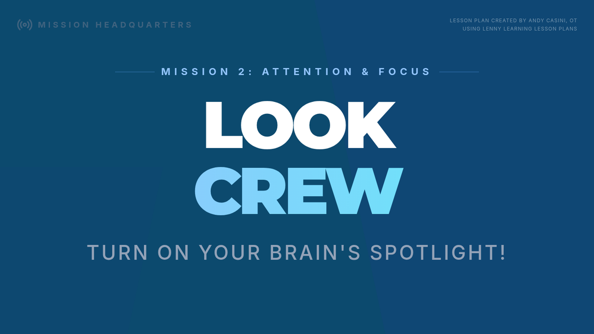 A 60-minute lesson on Attention and Focus for K-2 students. Students meet the 'LOOK Crew' and practice using their 'Spotlight' to stay on task through visual search games.