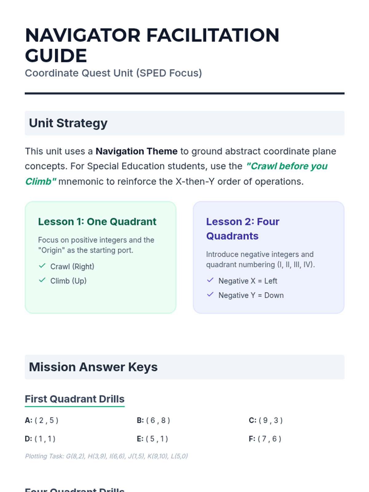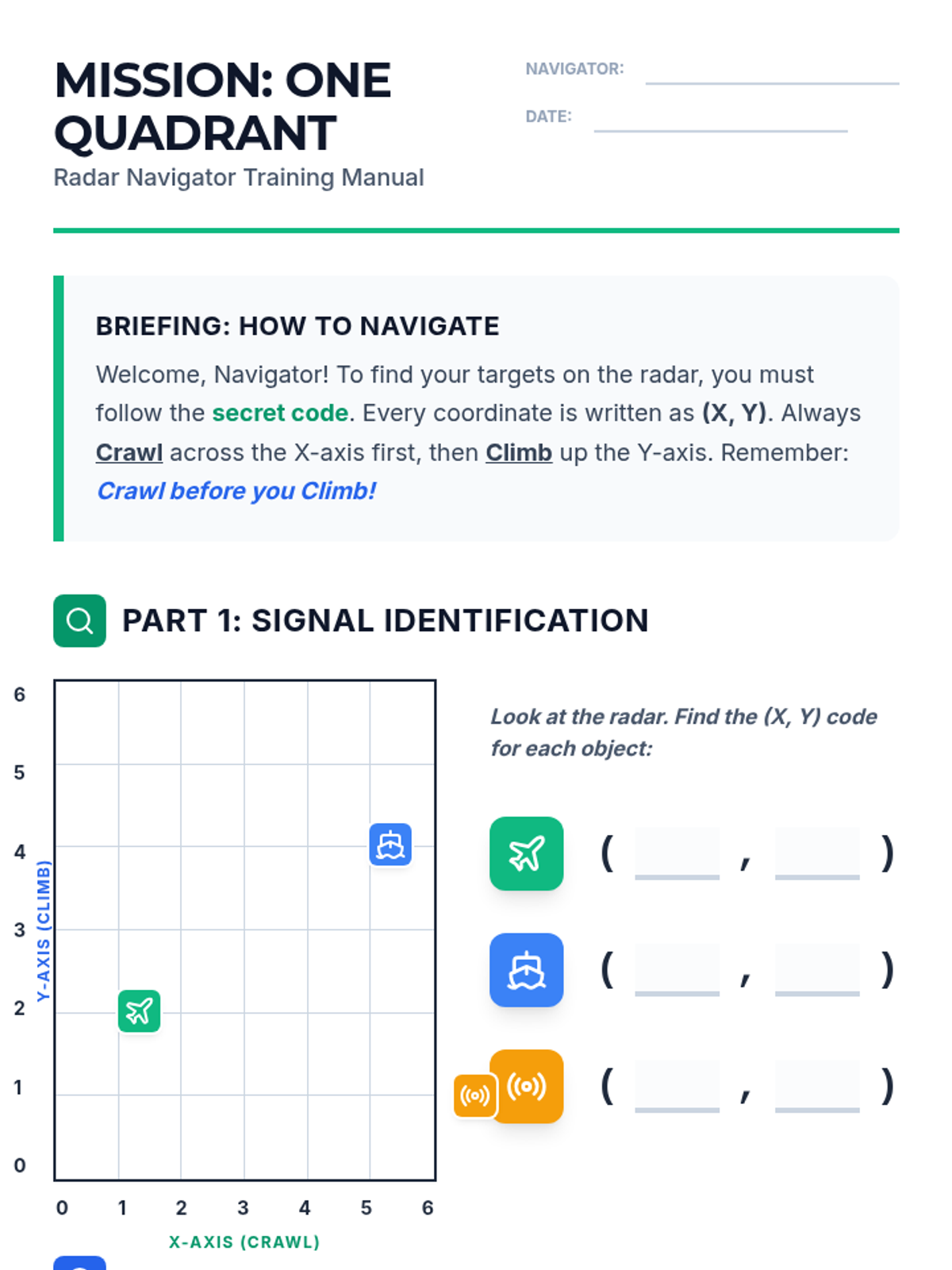 Introduction to the coordinate plane focusing exclusively on the first quadrant, emphasizing the (x, y) order and 'crawl then climb' analogy.