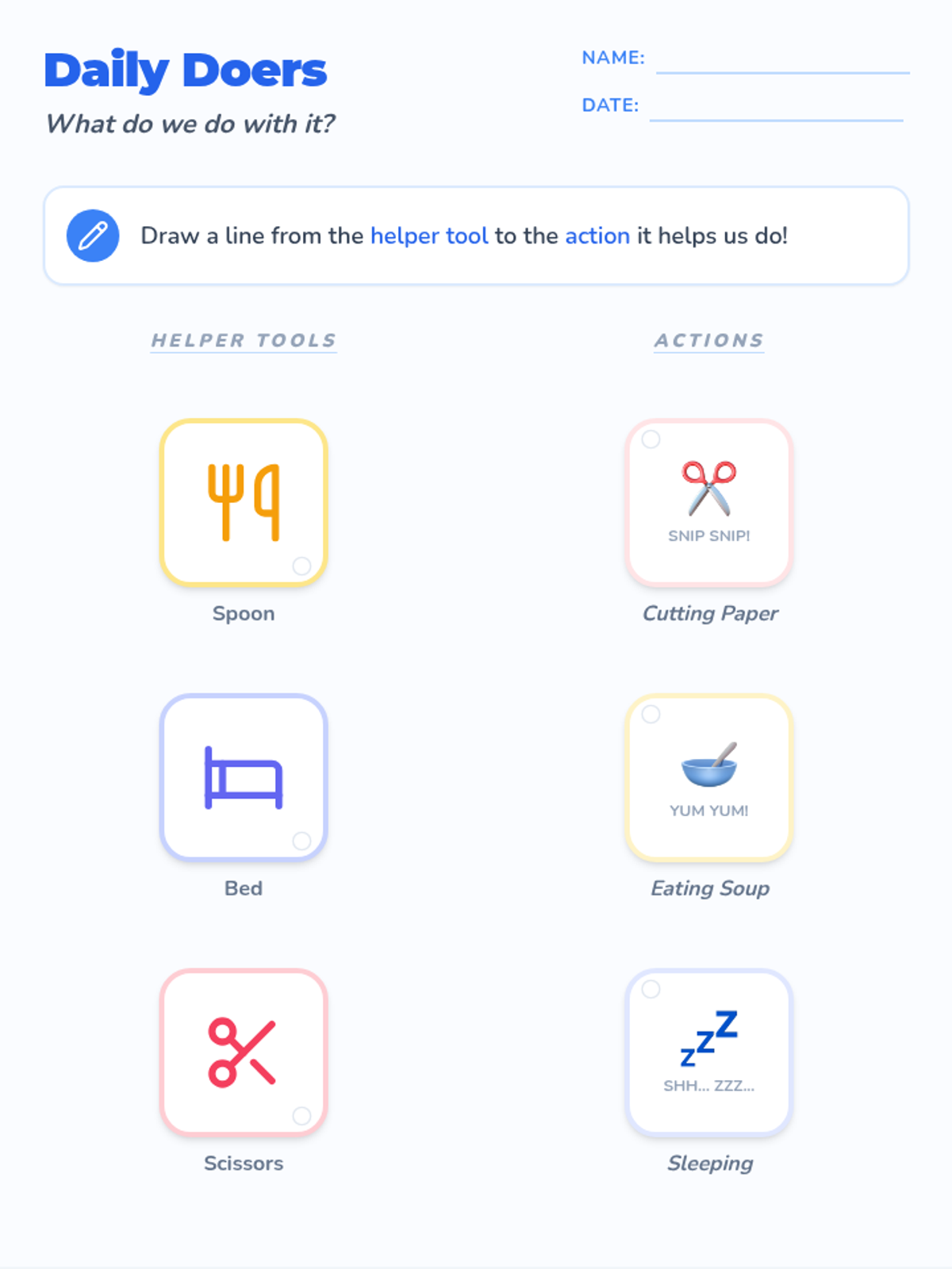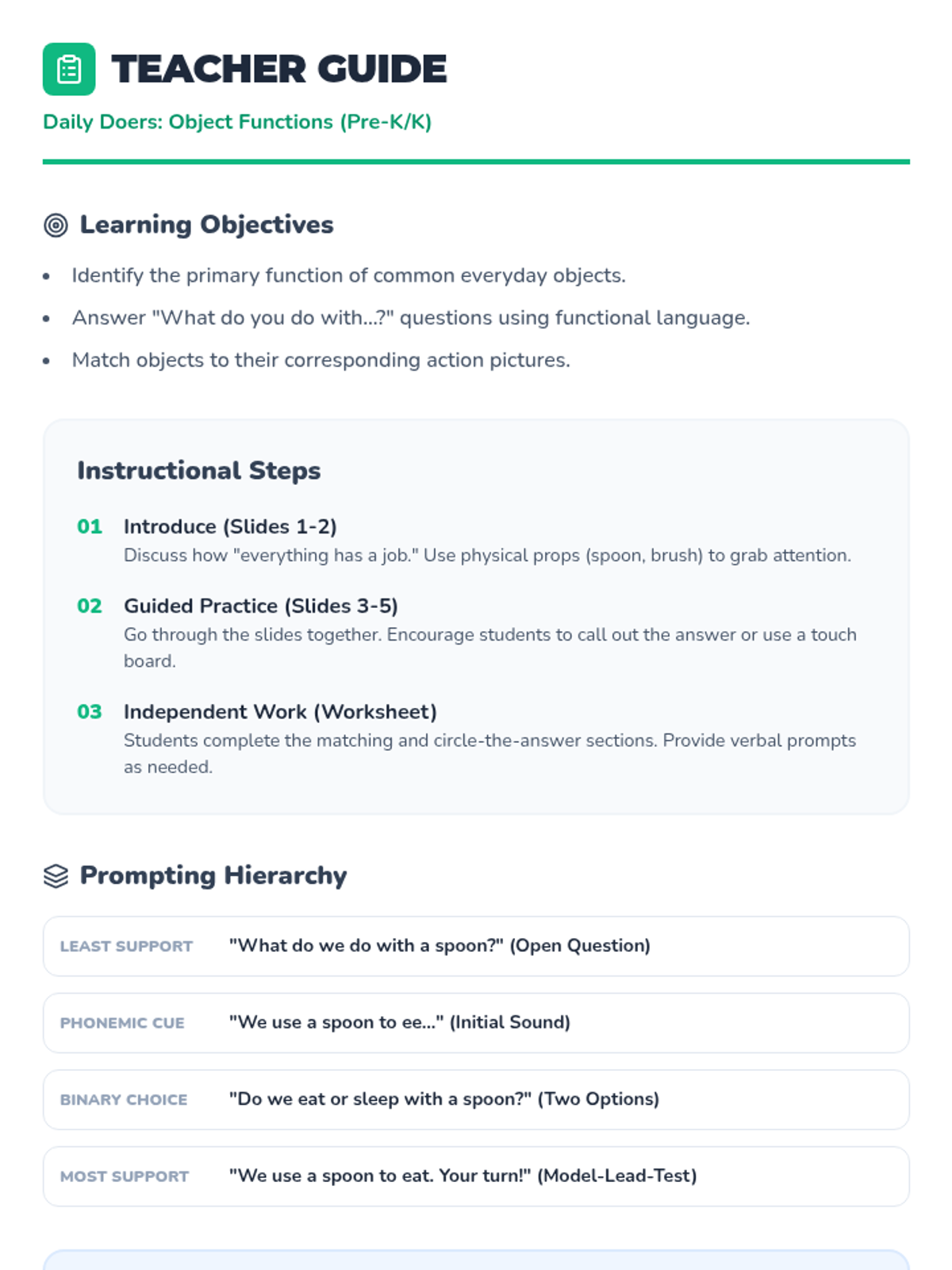 A speech-language therapy lesson focusing on identifying and labeling the functions of common everyday objects for early learners. Students will learn to associate objects like spoons, beds, and brushes with their primary actions.