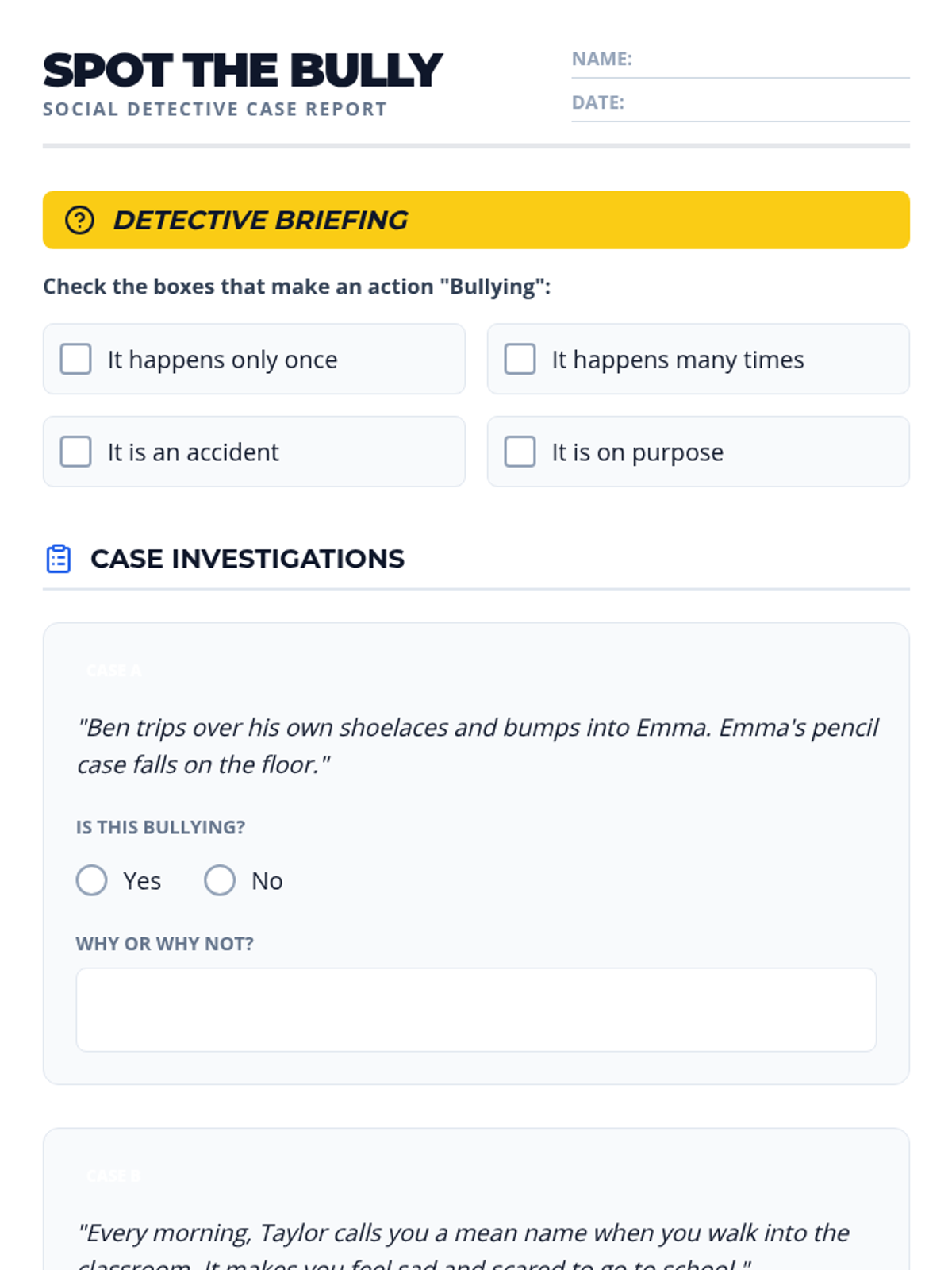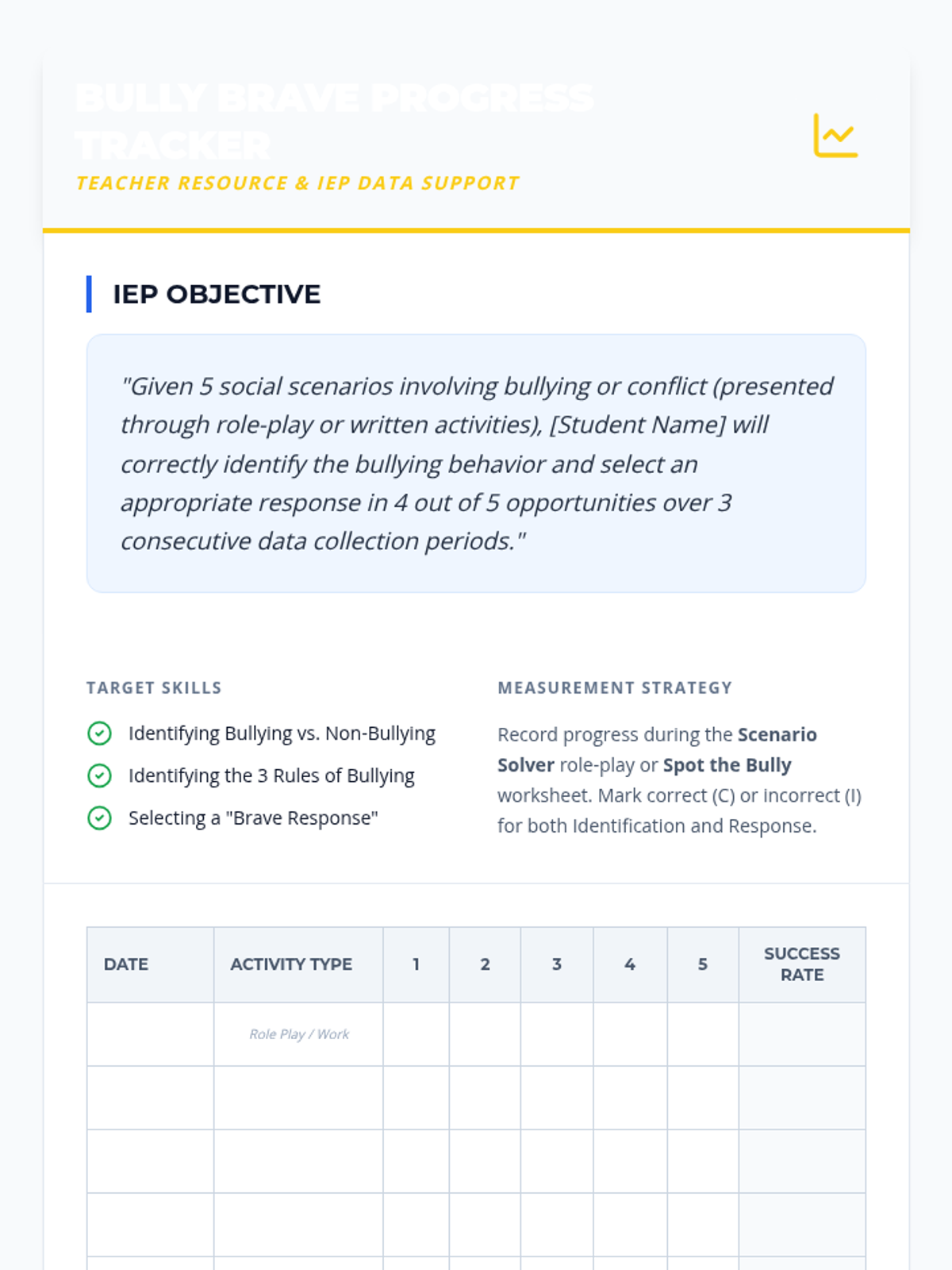 A lesson designed to help students identify bullying behaviors and practice appropriate responses through interactive scenarios and role-play activities. Includes a specific IEP objective and progress tracking tools.