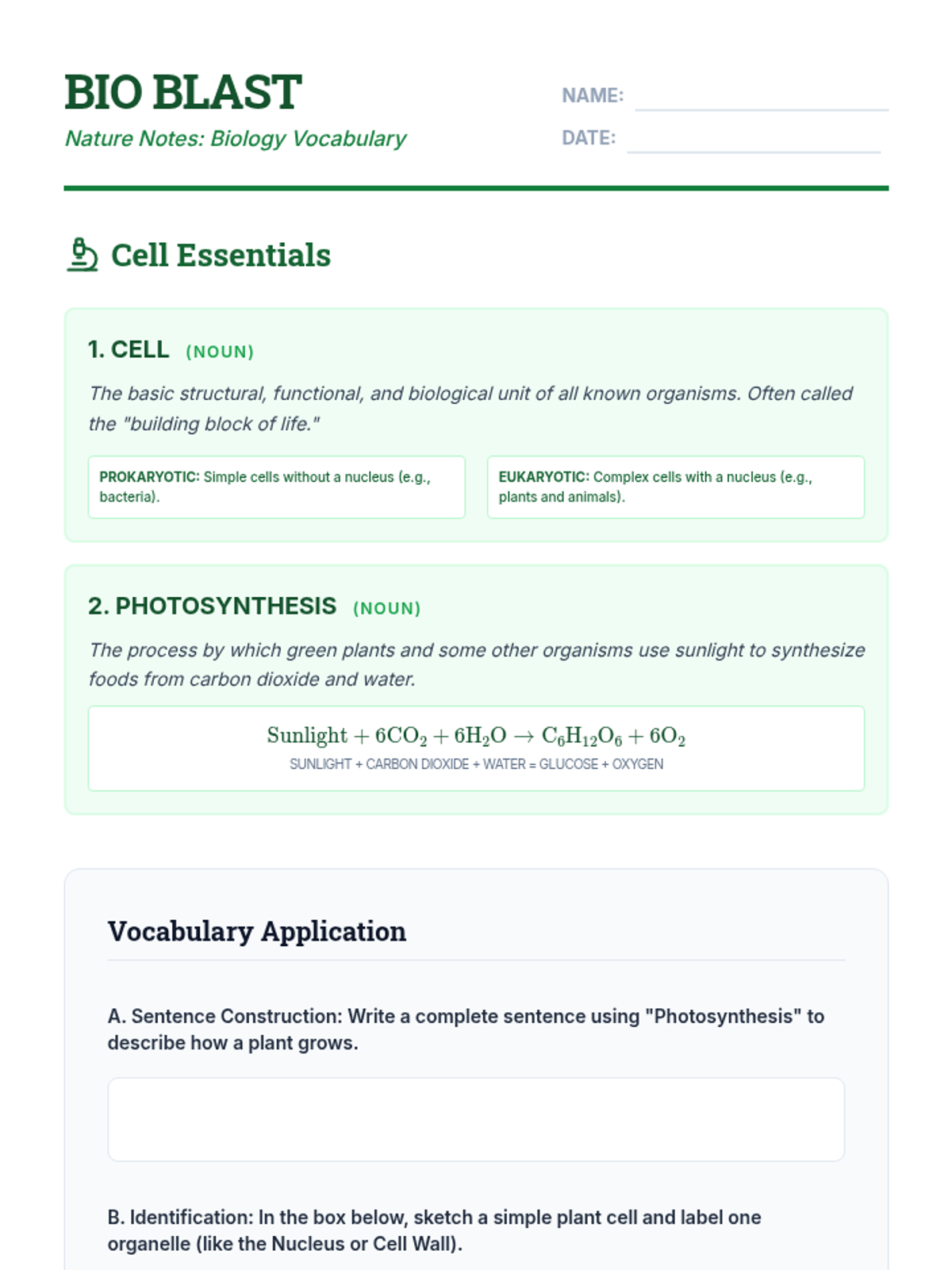 Vocabulary-rich resources focusing on essential biological concepts like cell structure and photosynthesis, alongside Earth science topics like plate tectonics and weather.
