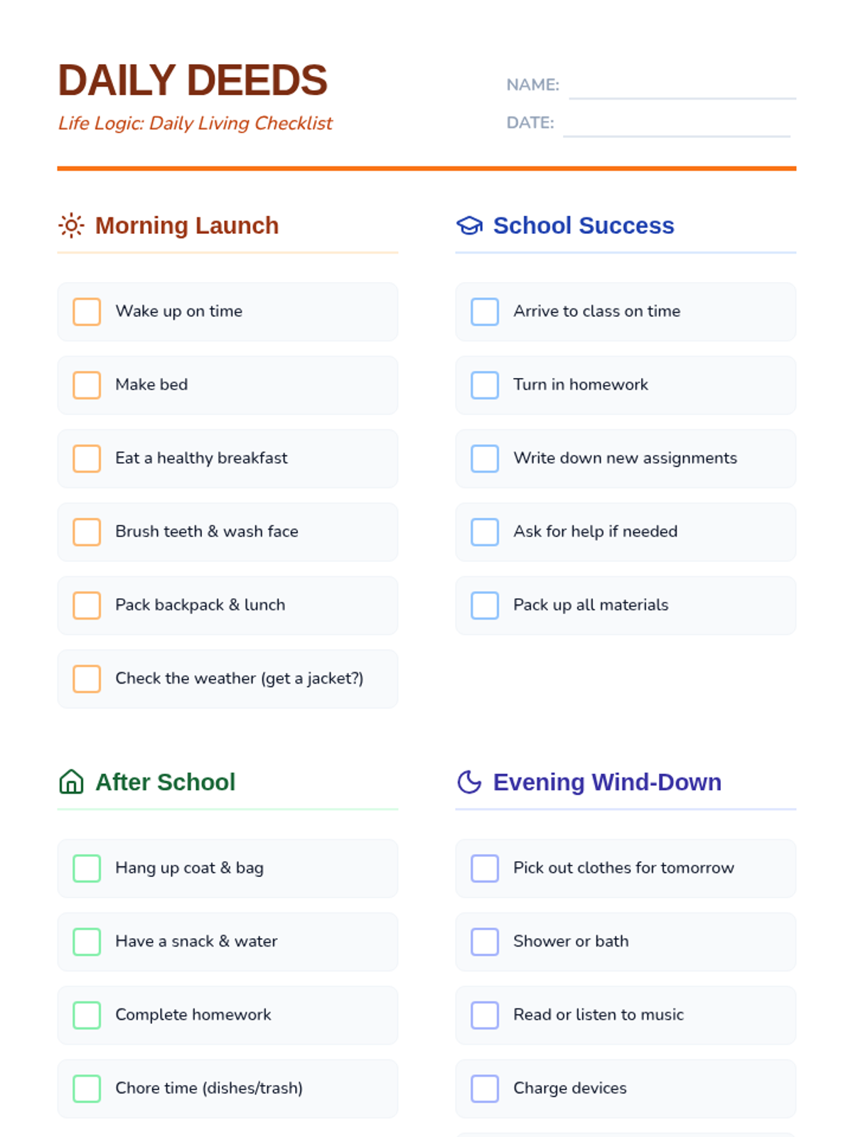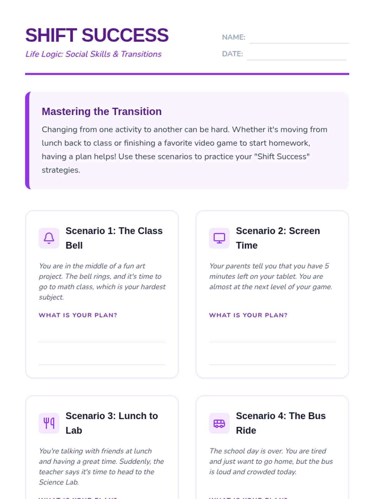 Practical guides and scenario-based activities to help students navigate social transitions and manage daily living tasks independently.