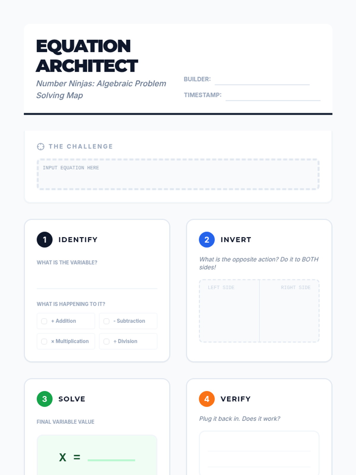 Visual tools and graphic organizers to assist students in breaking down and solving complex algebraic equations and word problems.