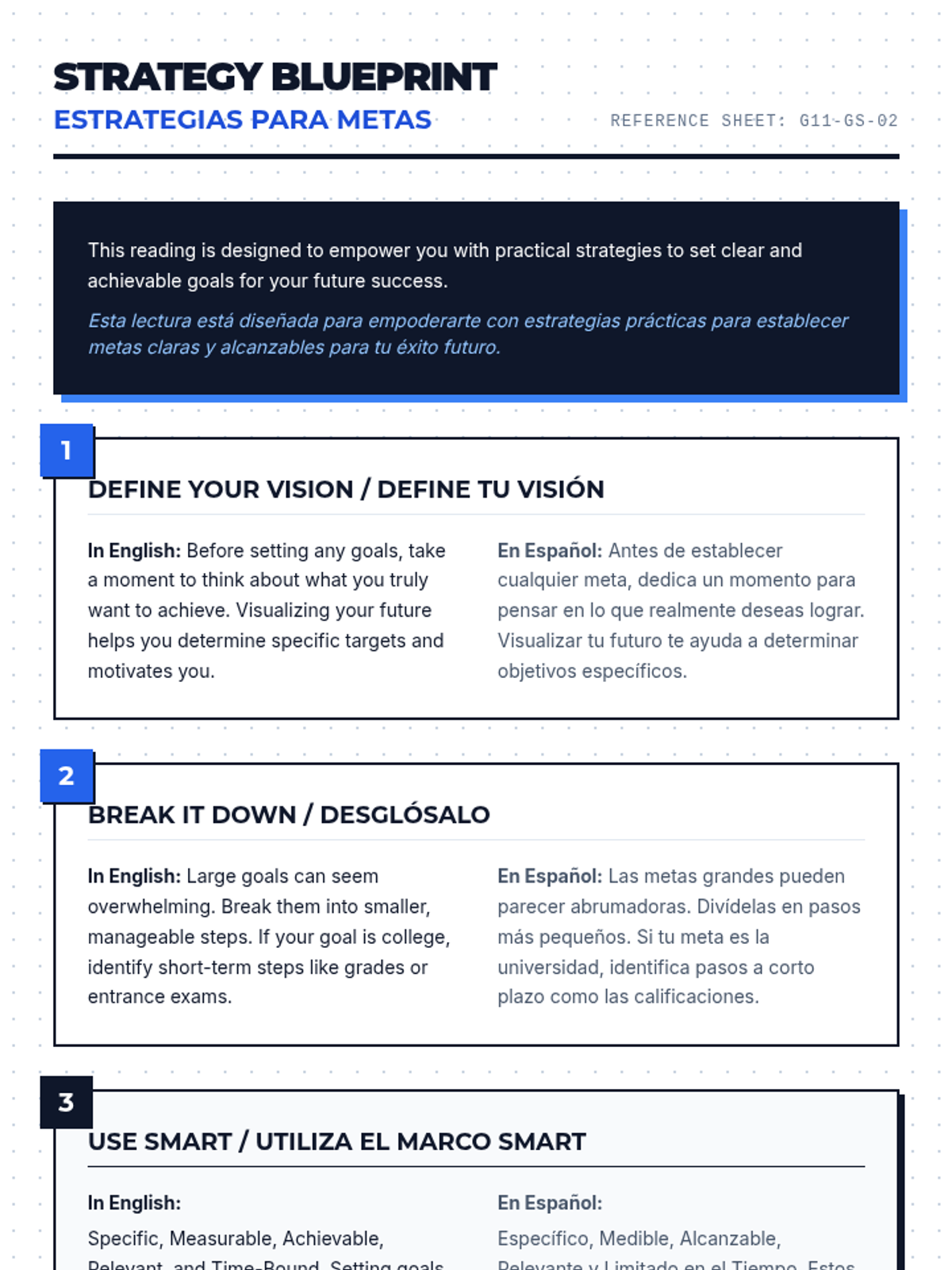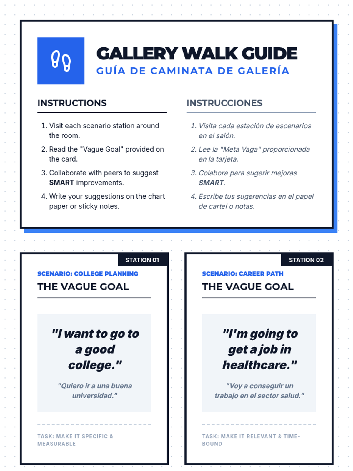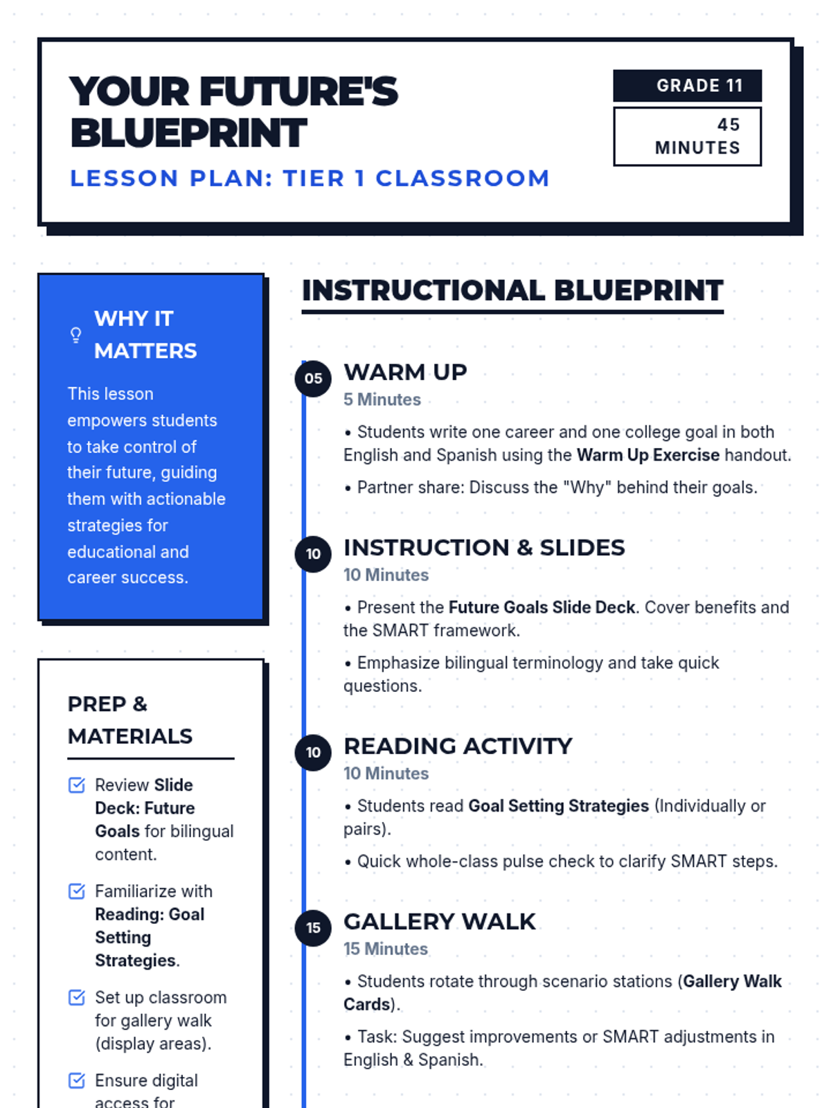 An 11th-grade lesson on goal setting for college and career planning, featuring bilingual (English/Spanish) materials and an interactive gallery walk activity.