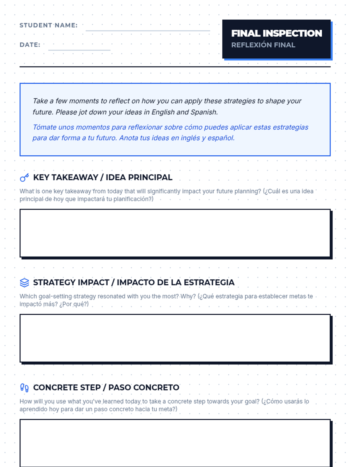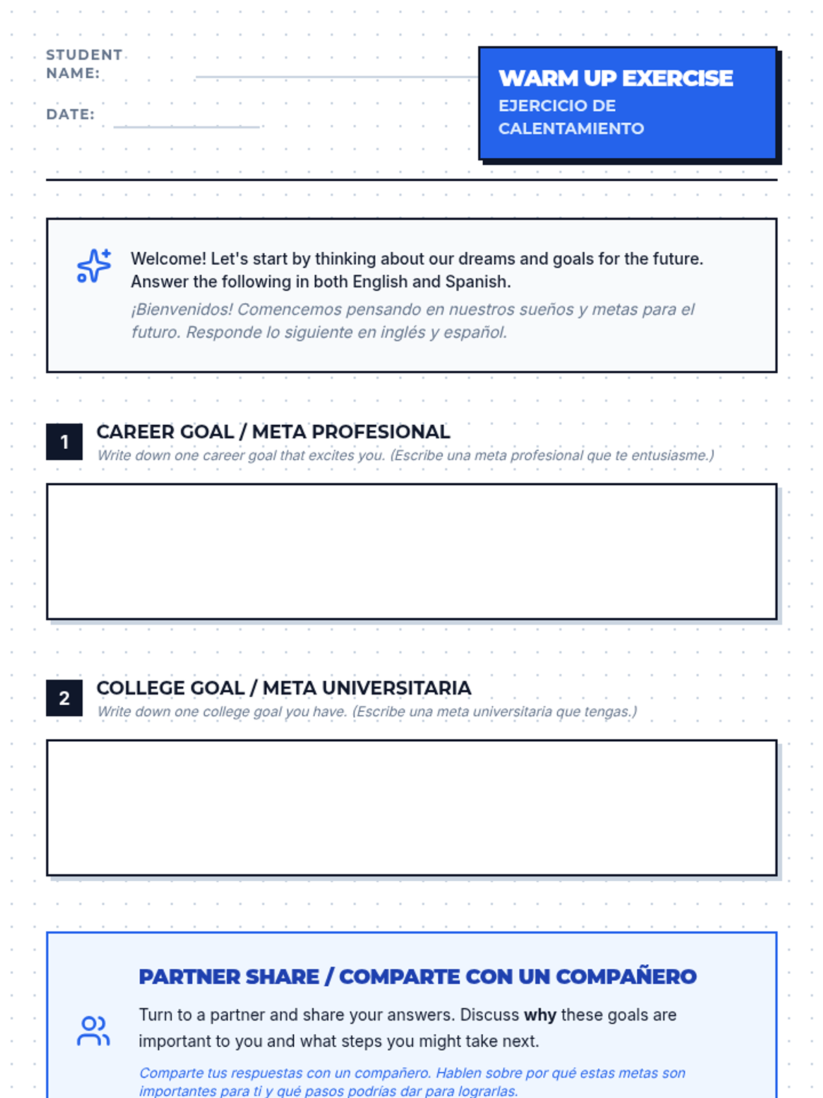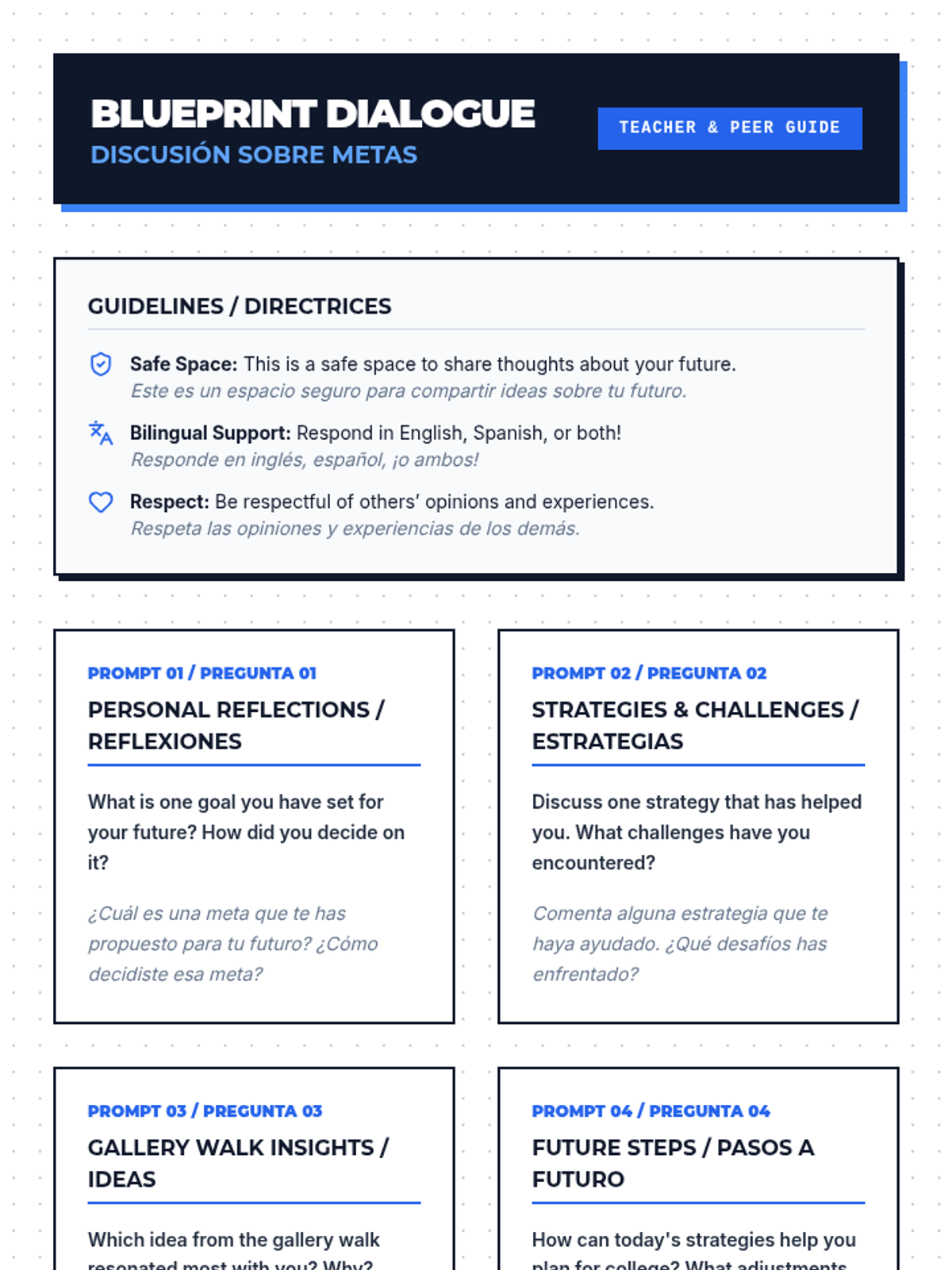 An 11th-grade lesson on goal setting for college and career planning, featuring bilingual (English/Spanish) materials and an interactive gallery walk activity.
