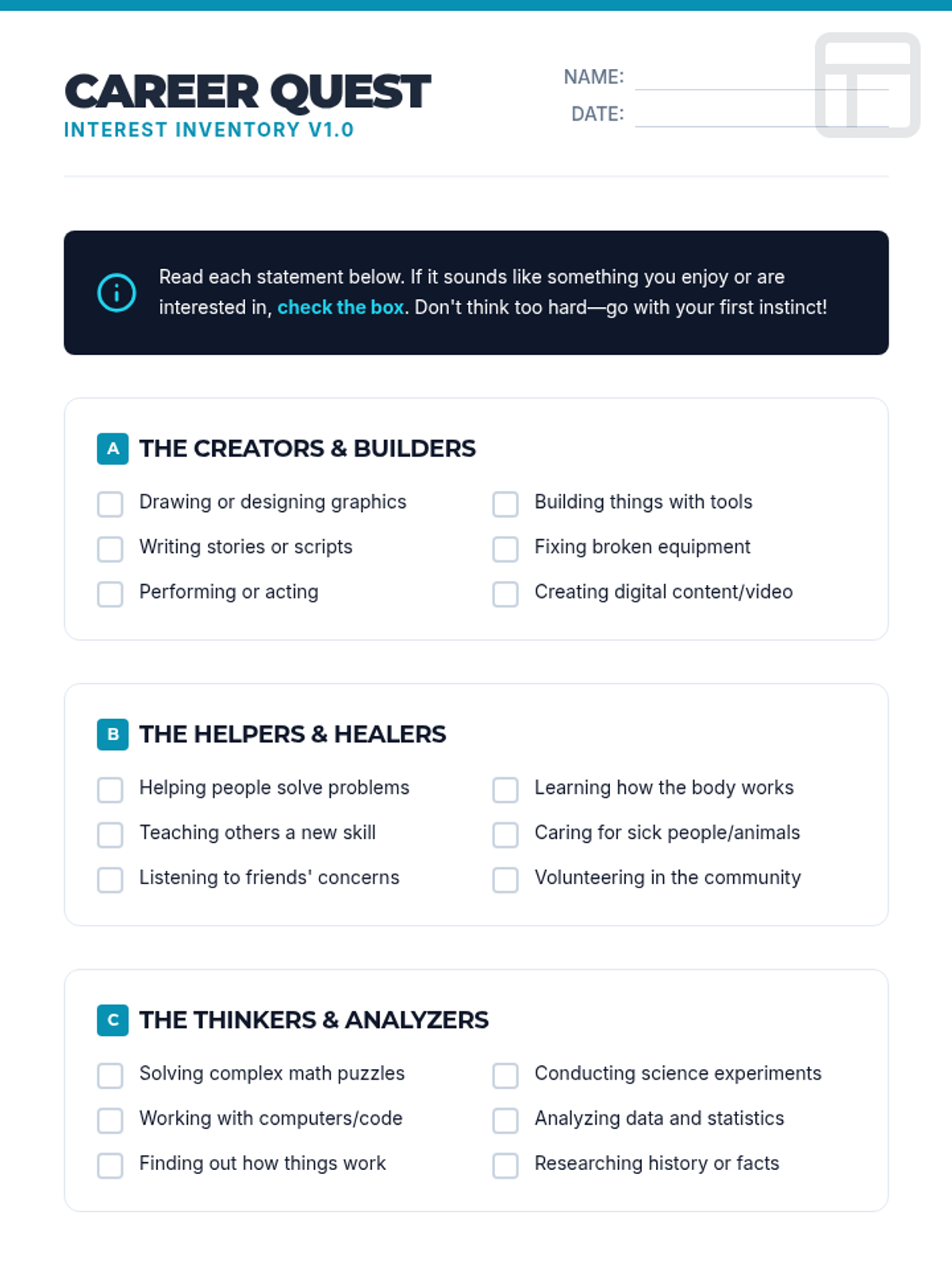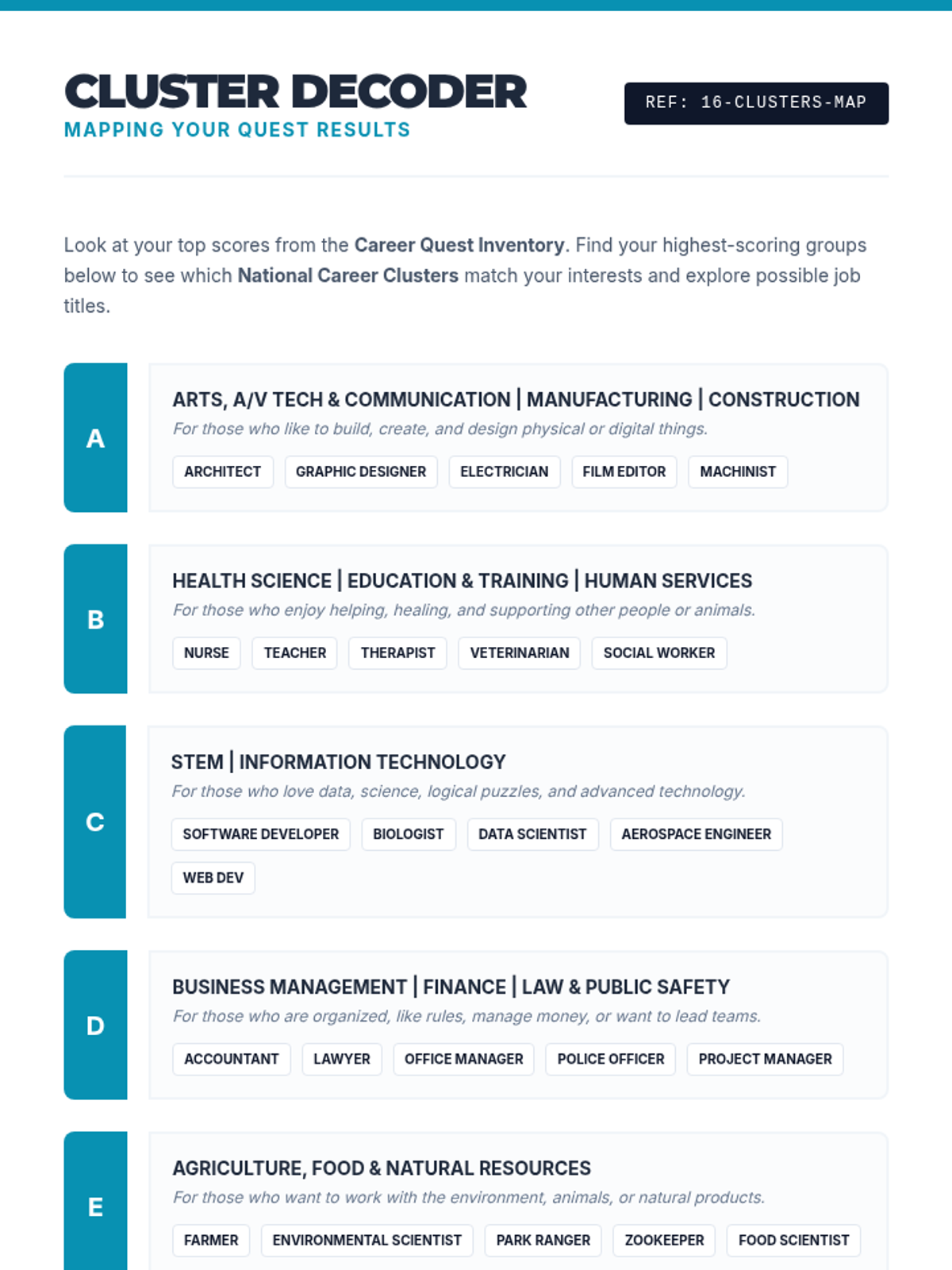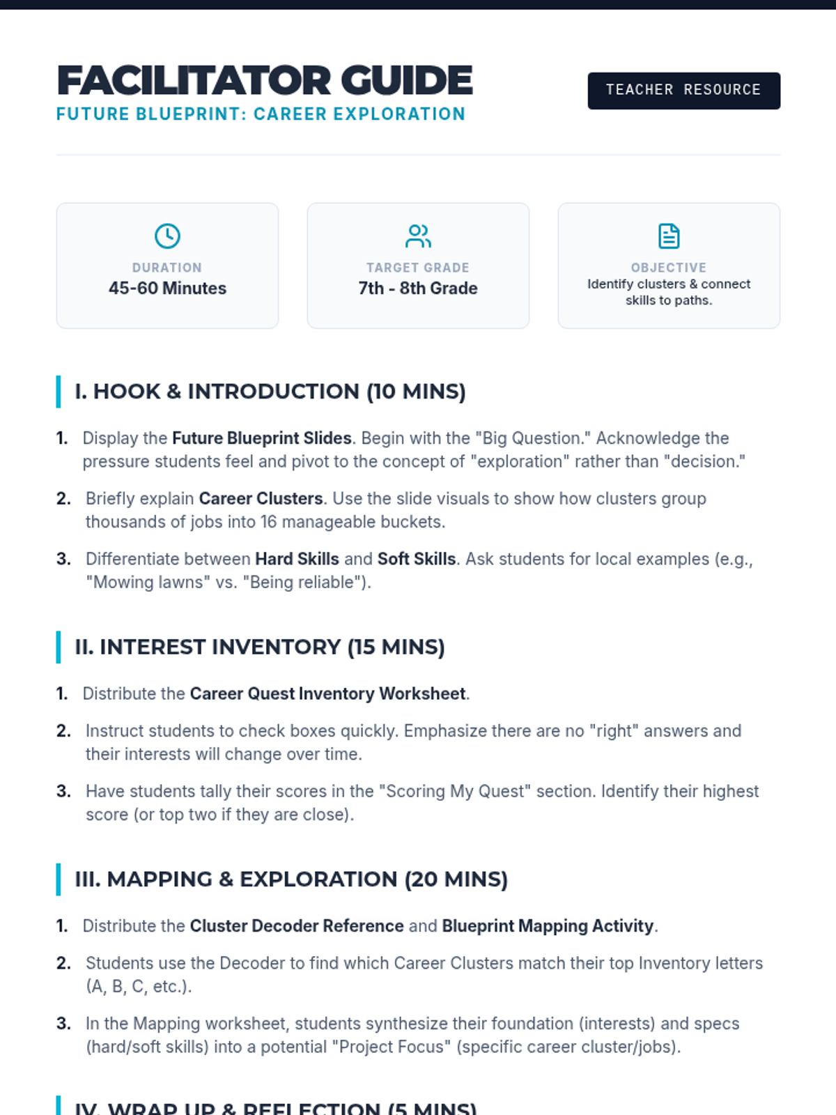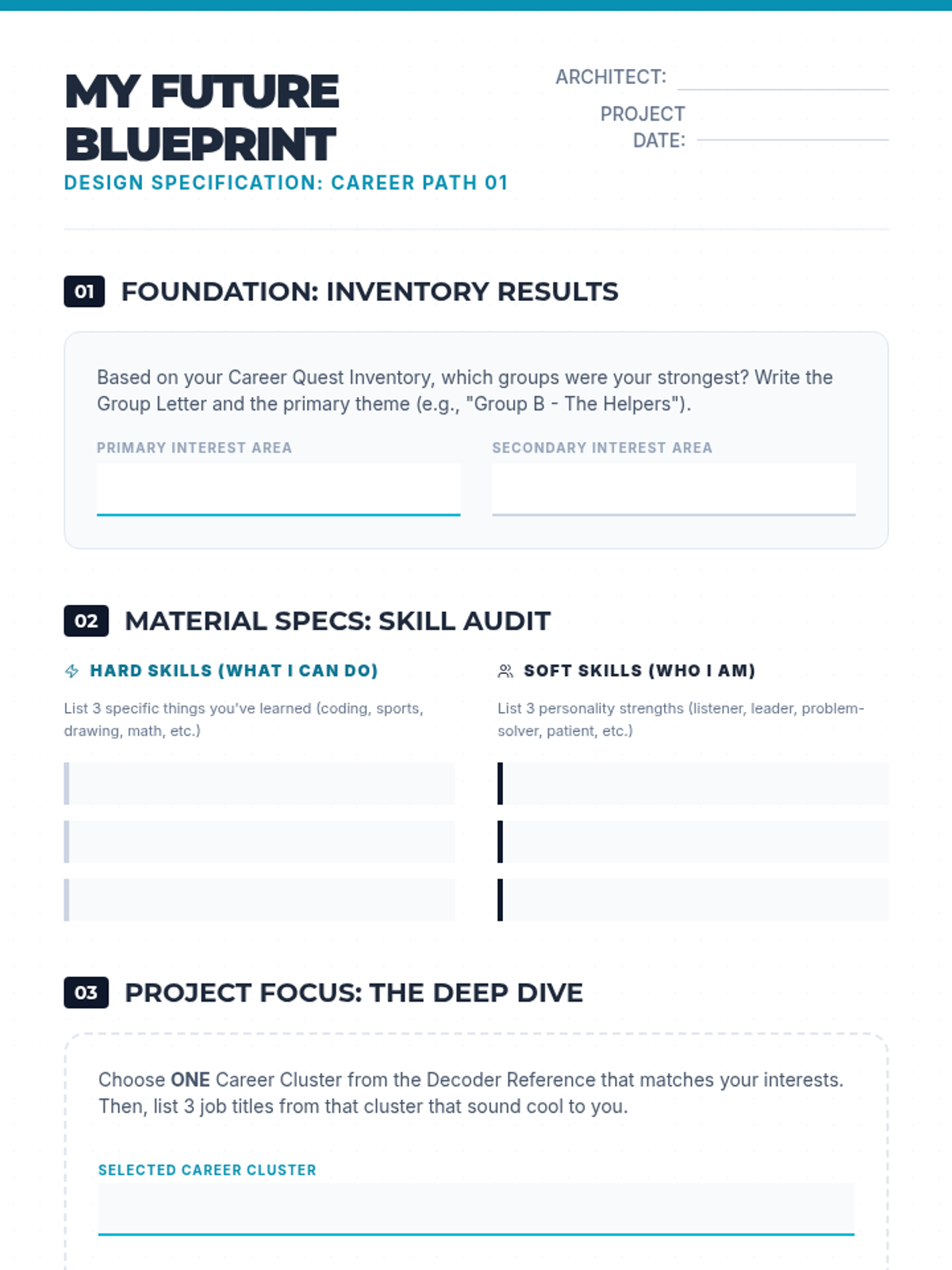 A comprehensive career exploration lesson for middle schoolers. Students identify their strengths, explore the 16 Career Clusters, and map their interests to potential future paths using a 'Future Blueprint' theme.