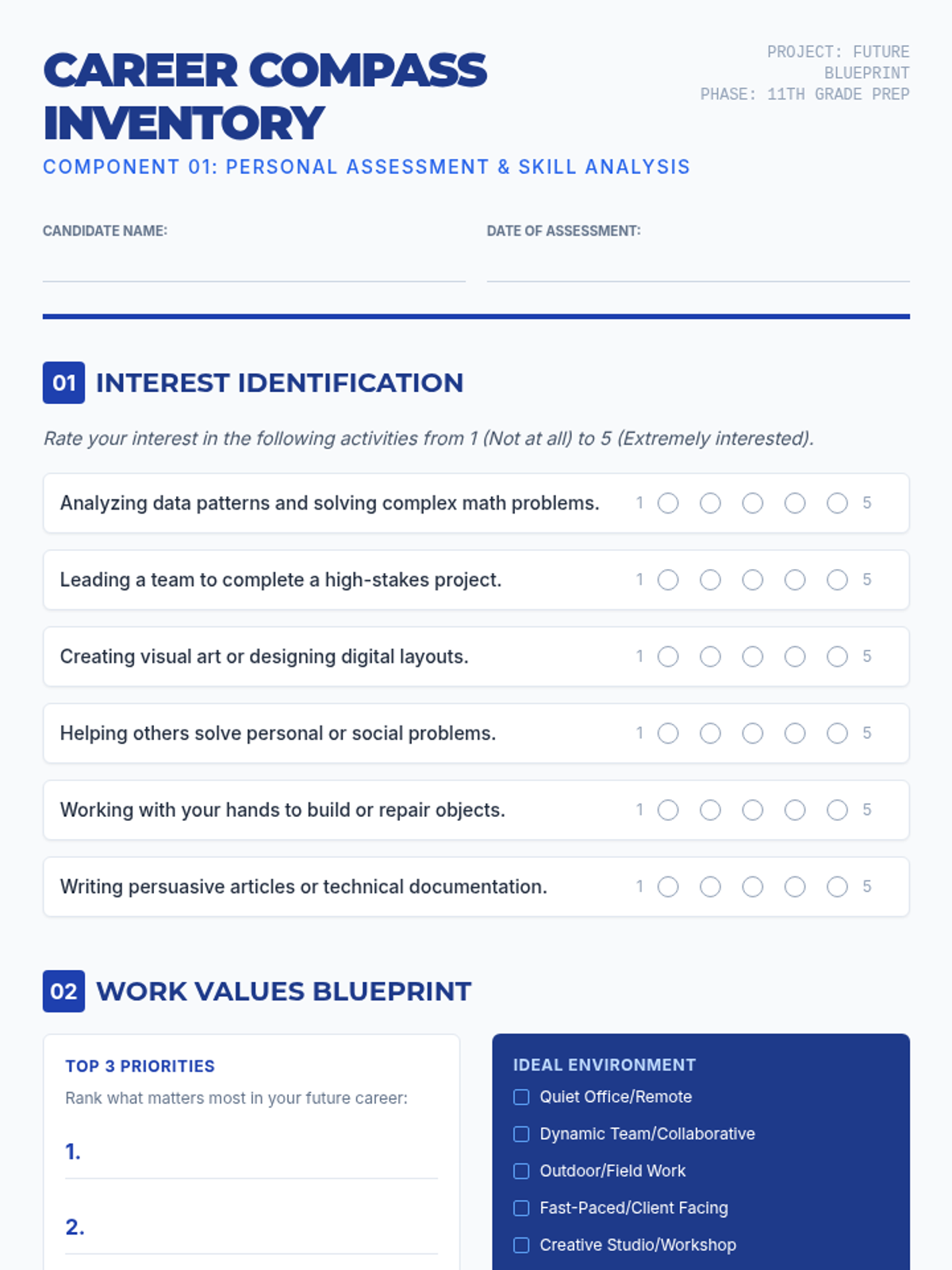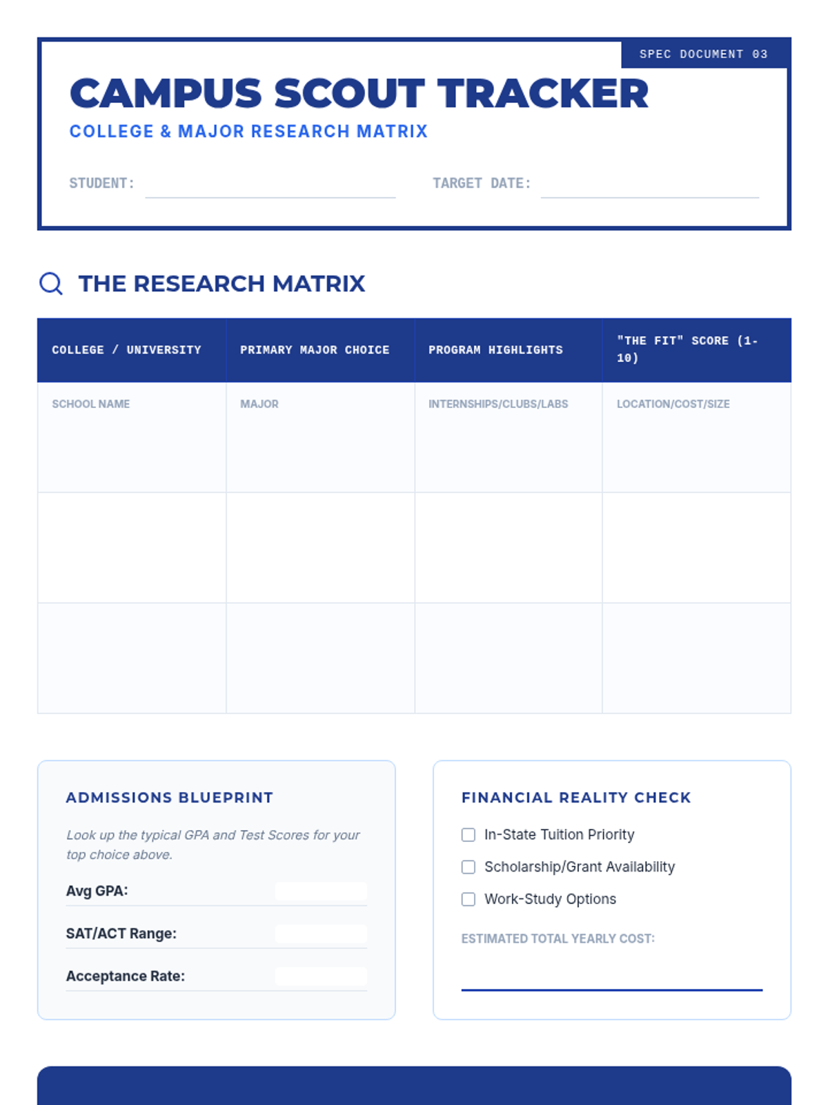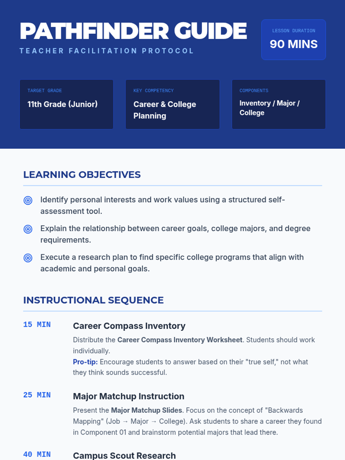 A comprehensive 11th-grade college and career readiness lesson that guides students through self-discovery, major exploration, and college research using a structured blueprint theme.