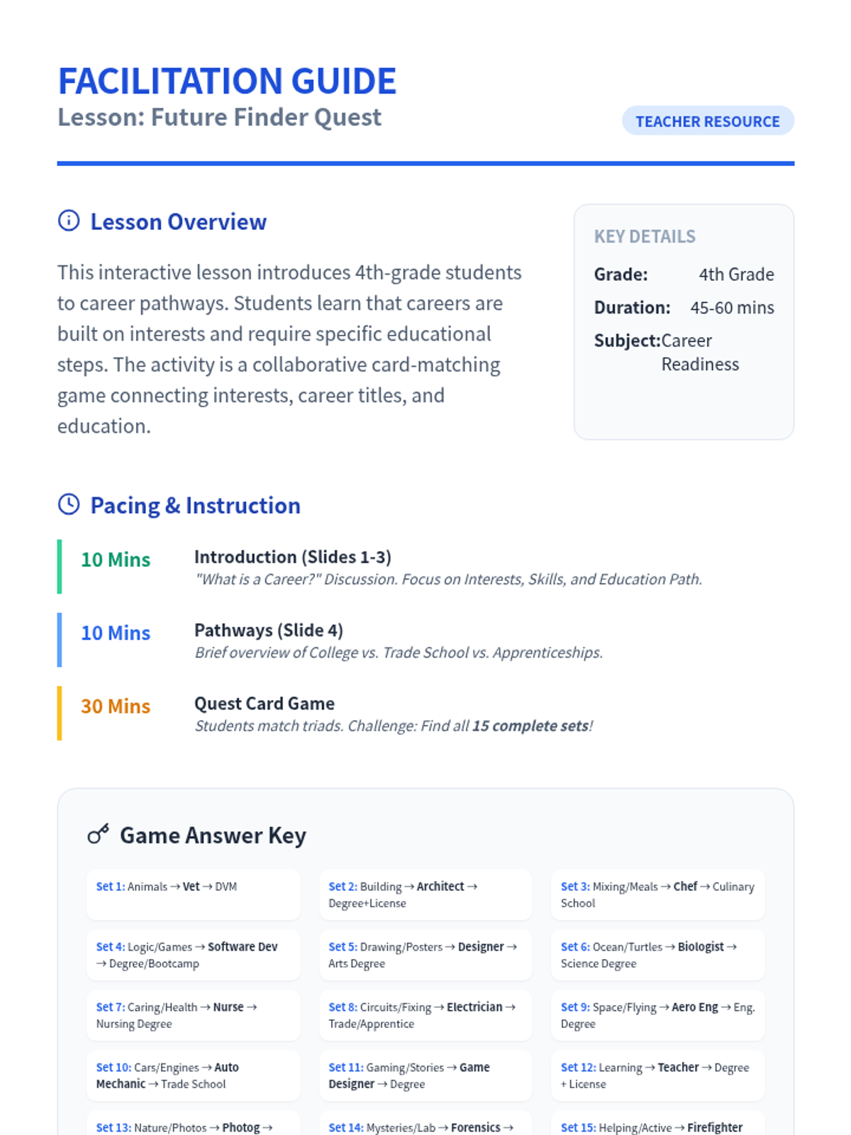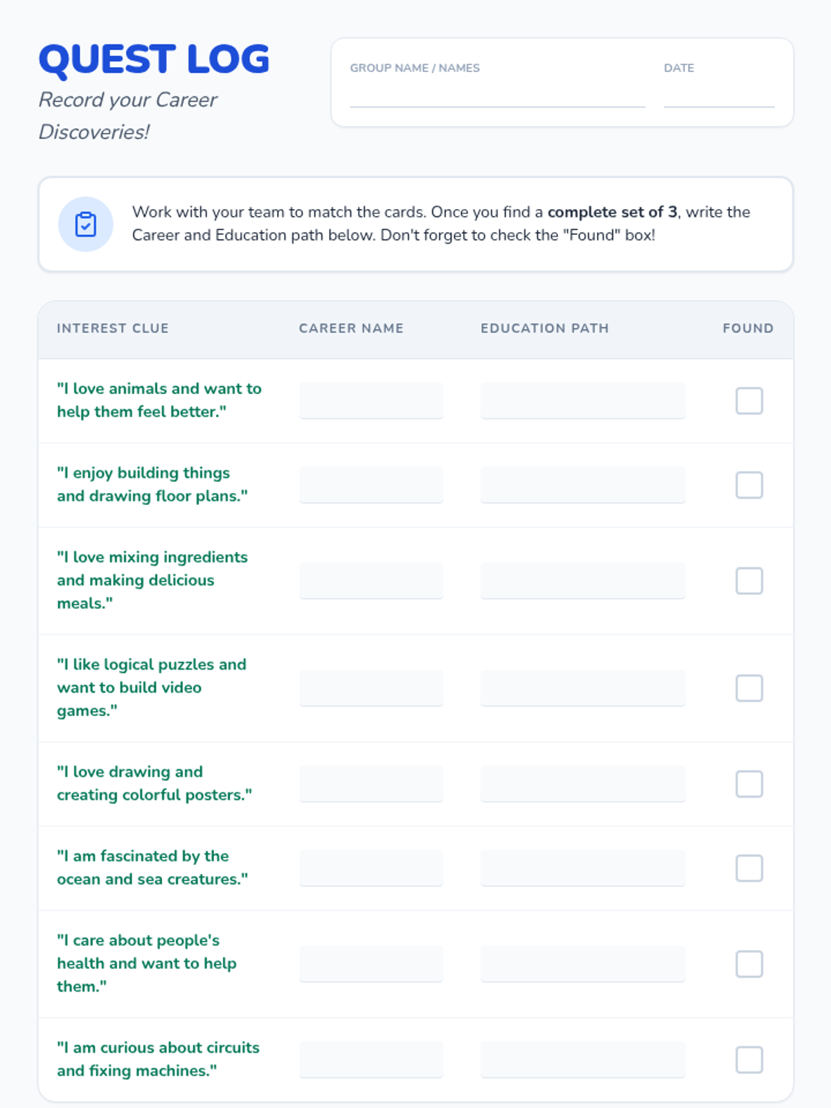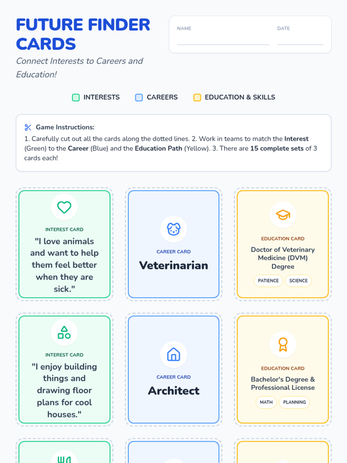 An interactive career exploration lesson where students match their interests to professional paths and discover the educational requirements for various roles.