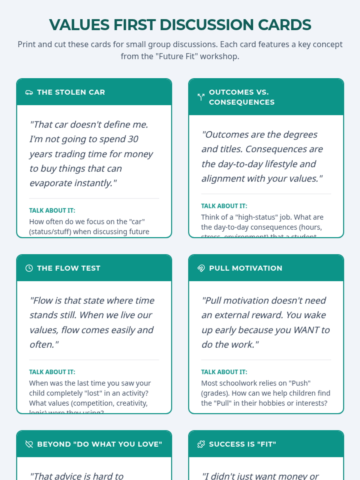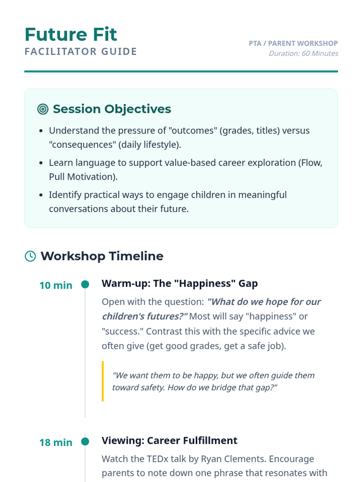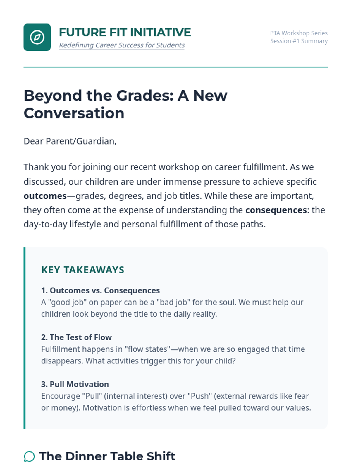 A workshop for parents and PTA members focused on shifting the conversation from academic 'outcomes' to value-based career fulfillment. Parents explore the concepts of 'Pull Motivation' and 'Flow' to better support their children's long-term happiness and success.