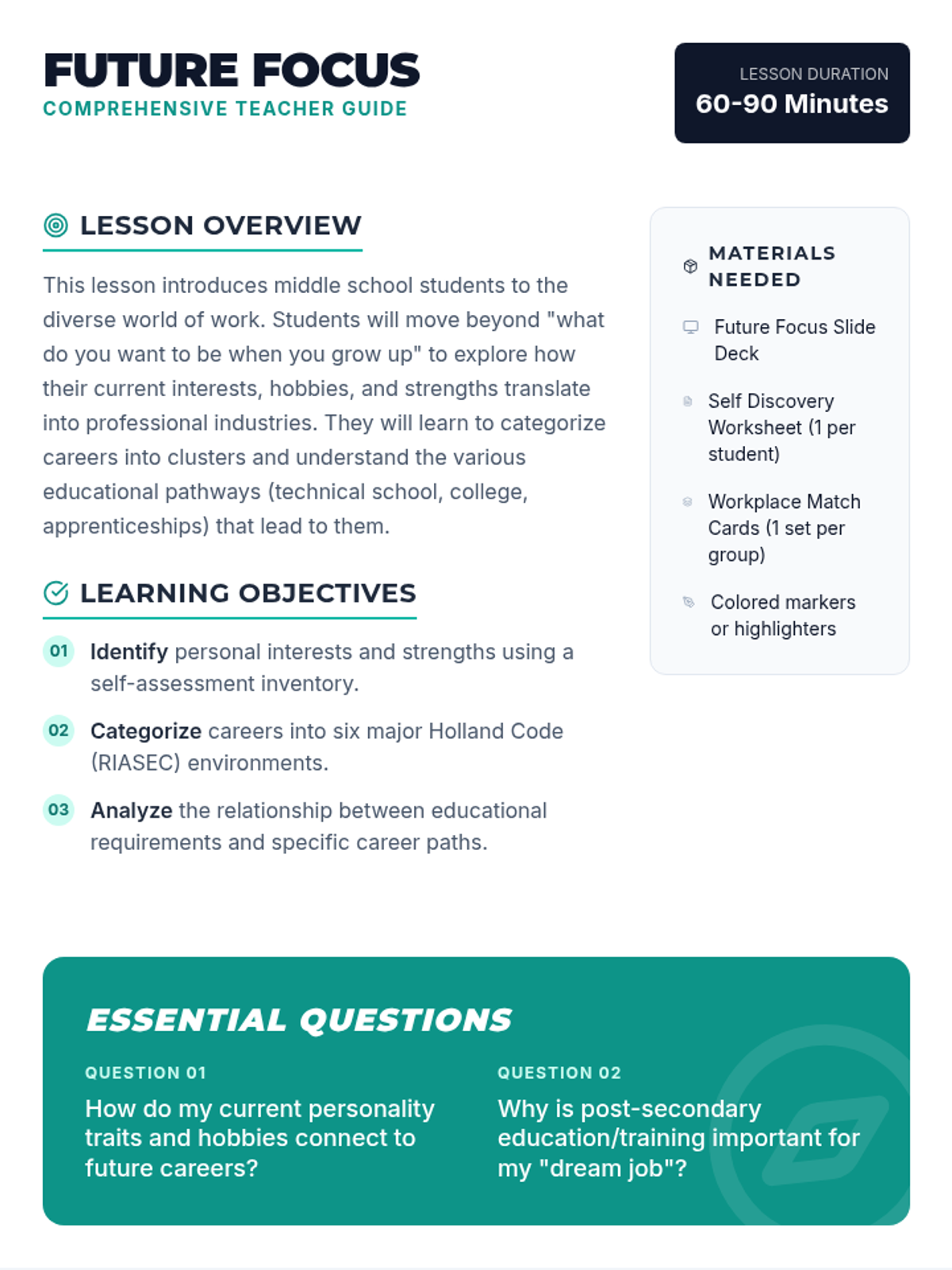 A comprehensive career exploration lesson for middle schoolers to identify personal strengths and explore diverse professional paths. Students will map their interests to real-world careers and understand the educational building blocks required for success.