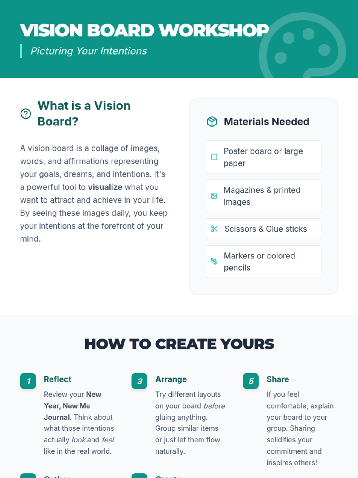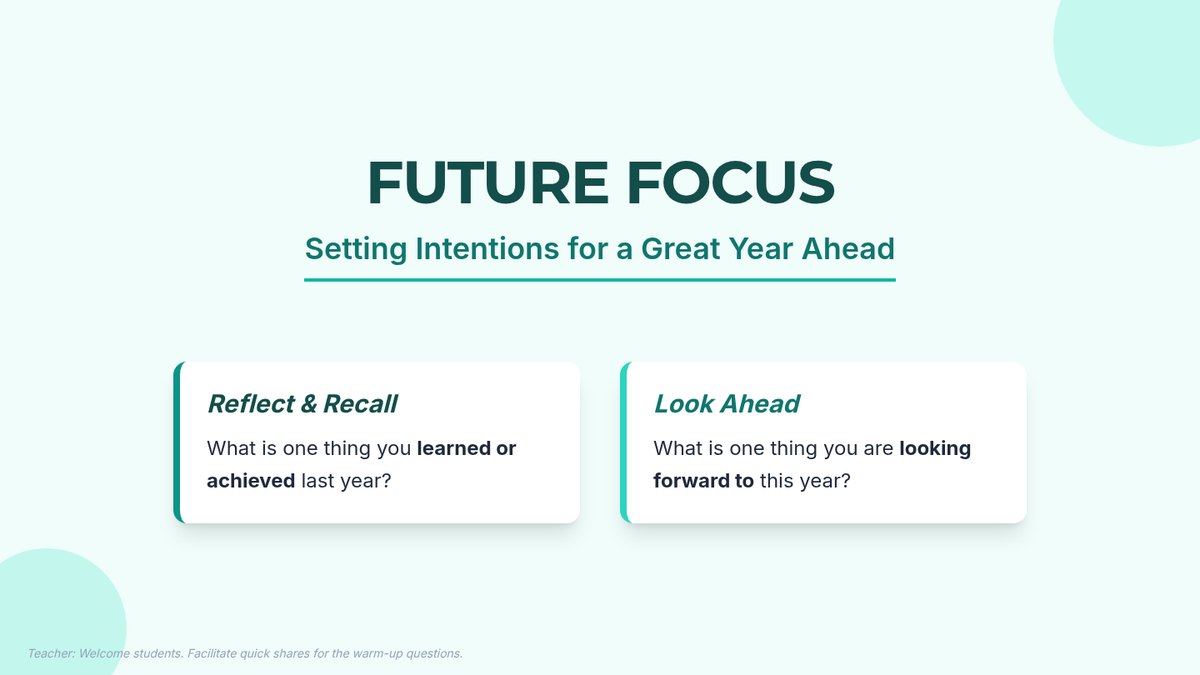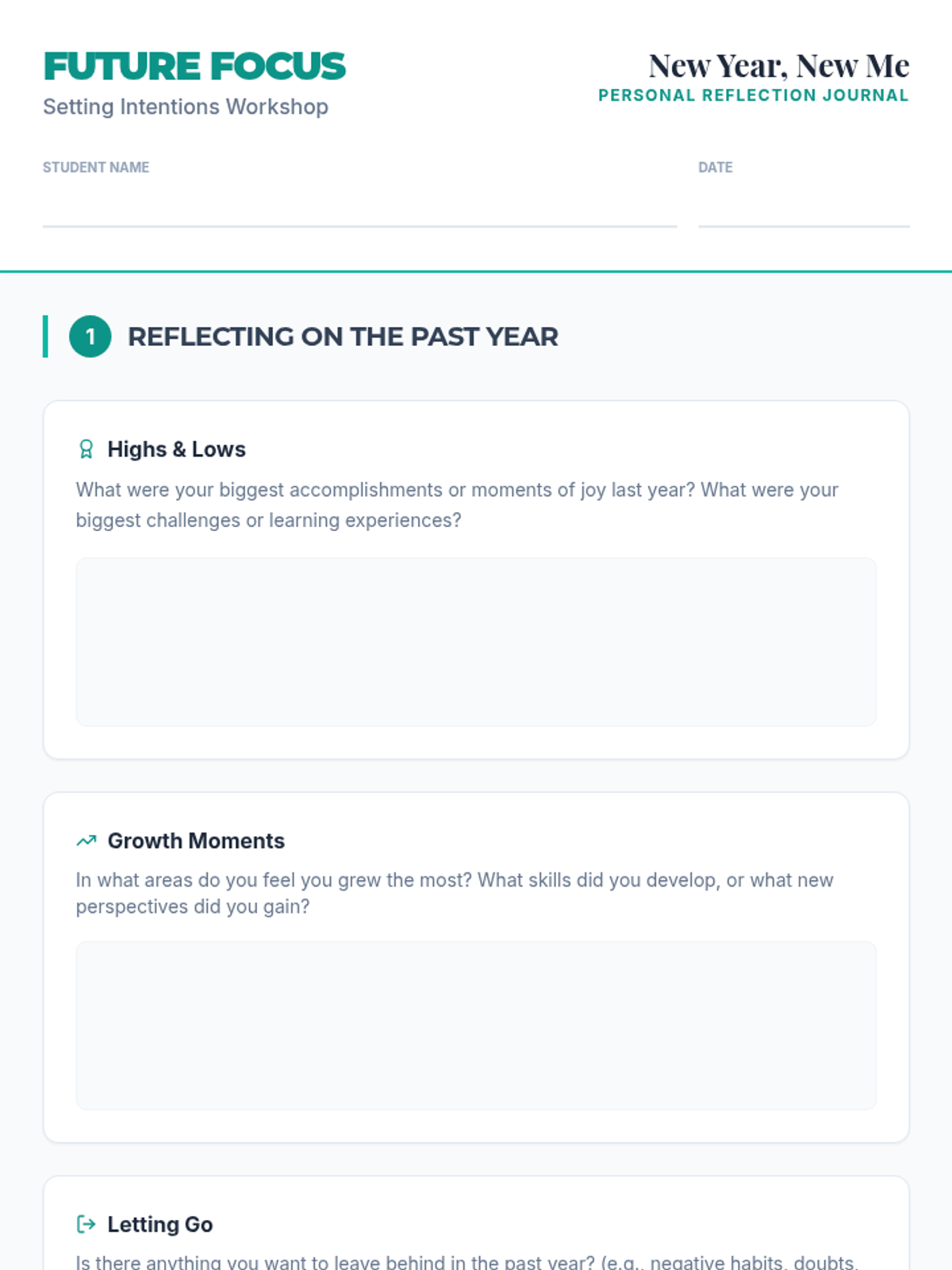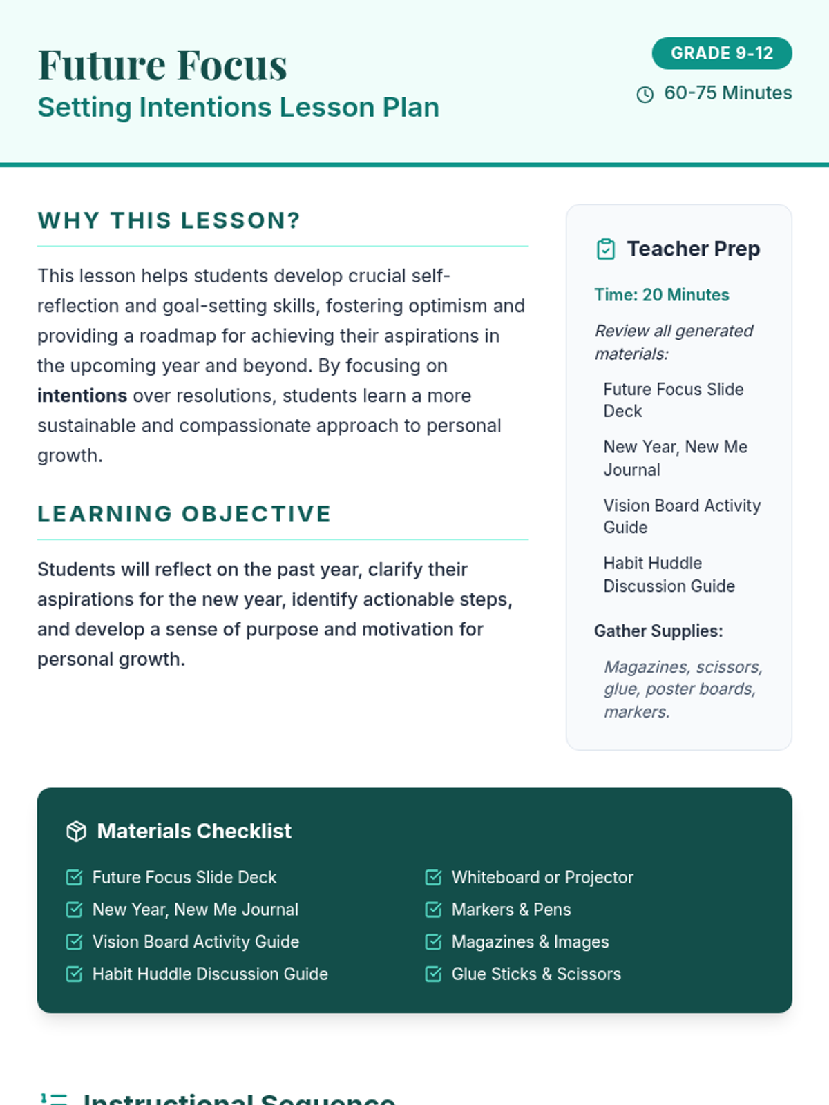 This crucial lesson for students in grades 9-12 encourages reflective thinking and goal setting as they approach the new year. Through guided journaling, collaborative vision board creation, and discussions about positive habits, students will clarify their aspirations, identify actionable steps, and develop a sense of purpose and motivation for the upcoming semester and beyond.